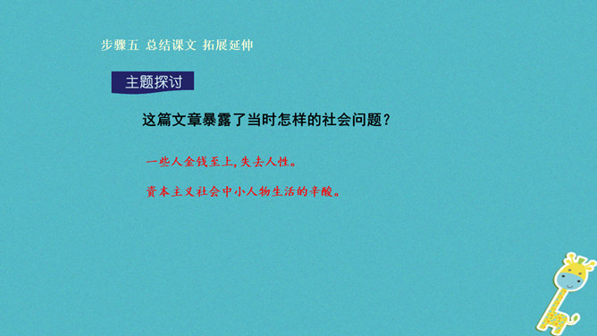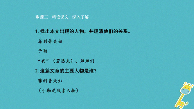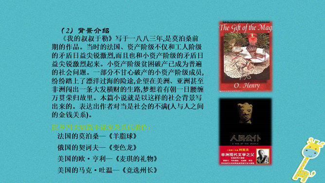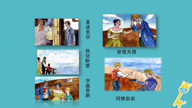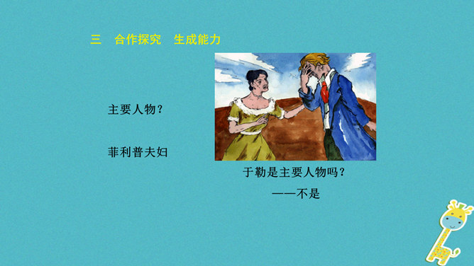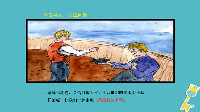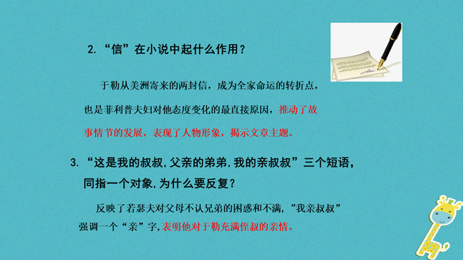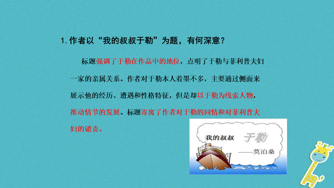 标题强调了于勒在作品中的地位,点明了于勒与菲利普夫妇一家的亲属关系。作者对于勒本人着墨不多,主要通过侧面来展示他的经历、遭遇和性格特征,但是却以于勒为线索人物,推动情节的发展。标题寄寓了作者对于勒的同情和对菲利普夫妇的谴责。“信”在小说中起什么作用?于勒从美洲寄来的两封信,成为全家命运的转折点,也是菲利普夫妇对他态度变化的最直接原因,推动了故事情节的发展,表现了人物形象,揭示文章主题。.“这是我的叔叔,父亲的弟弟,我的亲叔叔”三个短语,同指一个对象,为什么要反复?所属专题:我的叔叔于勒ppt。