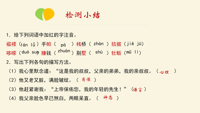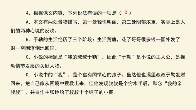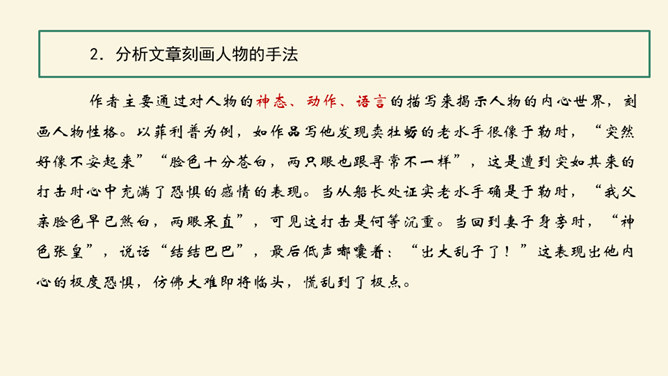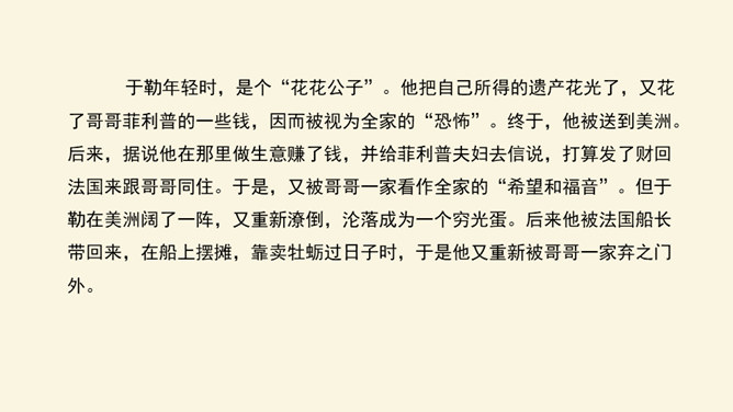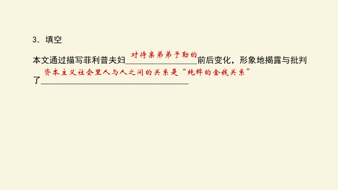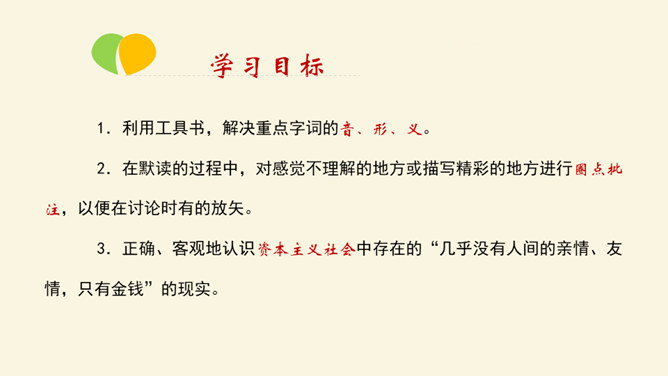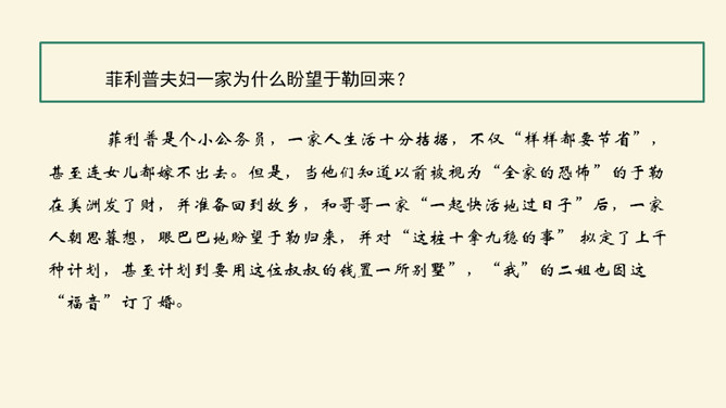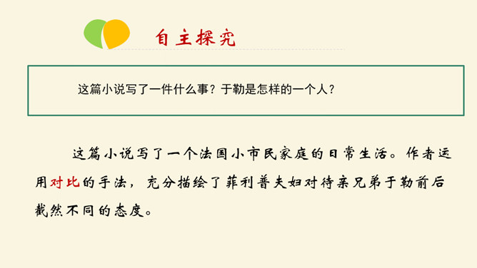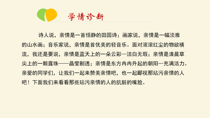 利用工具书,解决重点字词的音、形、义。在默读的过程中,对感觉不理解的地方或描写精彩的地方进行圈点批注,以便在讨论时有的放矢。正确、客观地认识资本主义社会中存在的“几乎没有人间的亲情、友情,只有金钱”的现实。诗人说,亲情是一首恬静的田园诗;画家说,亲情是一幅淡雅的山水画;音乐家说,亲情是首优美的轻音乐。面对滚滚红尘的物欲横流,我还是要说,亲情是蓝天上的一朵云彩—洁白无瑕;亲情是清晨草尖上的一颗露珠——晶莹剔透;亲情是东方冉冉升起的朝阳—充满活力。所属专题:我的叔叔于勒ppt。