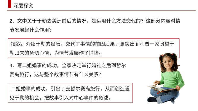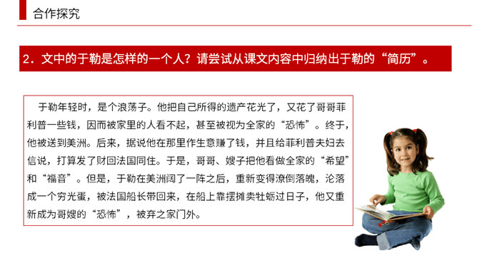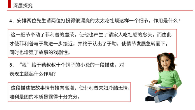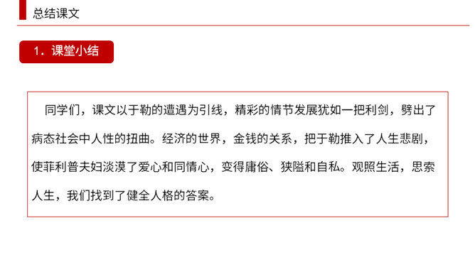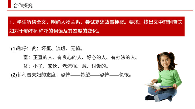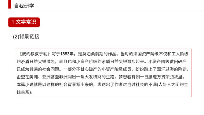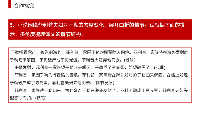 小说围绕菲利普夫妇对于勒的态度变化,展开曲折的情节。试根据下面的提示。多角度梳理课文的情节结构。于勒挥霍家产,被送到海外。菲利普一家因于勒的挥霍陷入困境。菲利普一家等待在海外发财的于勒归来解困。于勒破产成了穷光蛋。菲利普夫妇弃他而去。(逻辑)于勒发财,菲利普一家盼望于勒归来解困。于勒成了穷光蛋,希望破灭了。(心理)菲利普一家因于勒的挥霍陷入困境。菲利普一家等待在海外发财的于勒归来解困。在船上发现于勒破产成了穷光蛋。菲利普夫妇弃他而去。(情节发展)所属专题:我的叔叔于勒ppt。