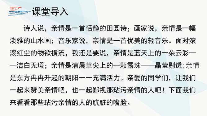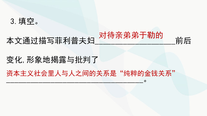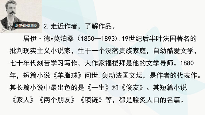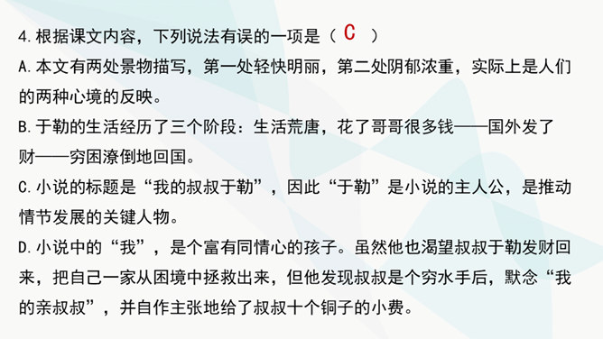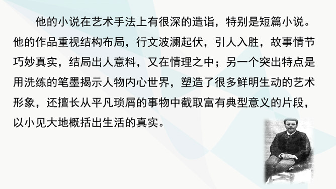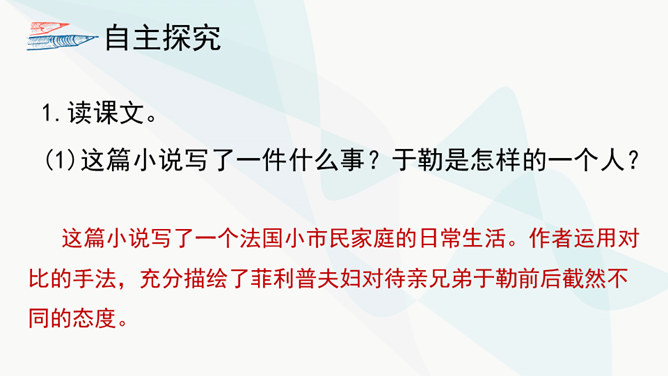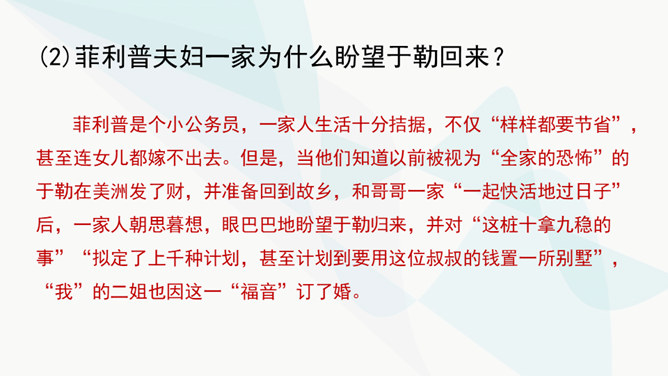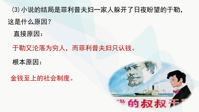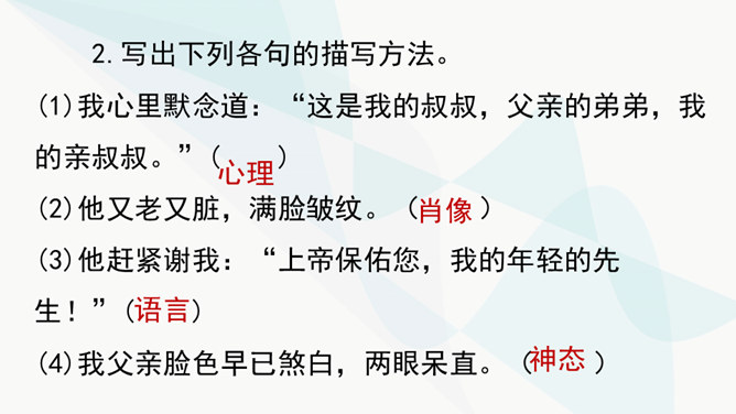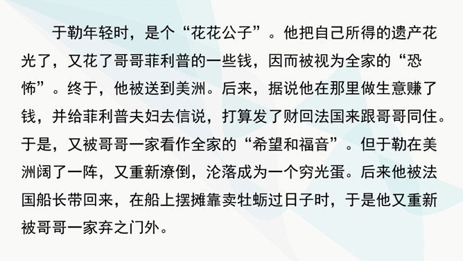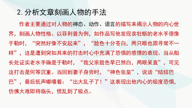 作者主要通过对人物的神态、动作、语言的描写来揭示人物的内心世界,刻画人物性格。以菲利普为例,如作品写他发现卖牡蛎的老水手很像于勒时,“突然好像不安起来”,“脸色十分苍白,两只眼也跟寻常不一样”,这是遭到突如其来的打击时心中充满了恐惧的感情的表现。当从船长处证实老水手确是于勒时,“我父亲脸色早已煞白,两眼呆直”,可见这打击是何等沉重。当回到妻子身旁时,“神色张皇”,说话“结结巴巴”,最后低声嘟囔着:“出大乱子了!”这表现出他内心的极度恐惧,仿佛大难即将临头,慌乱到了极点。所属专题:我的叔叔于勒ppt。