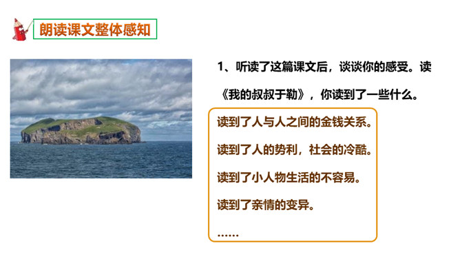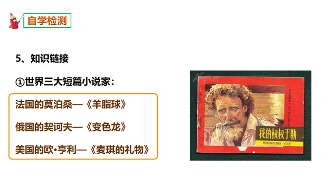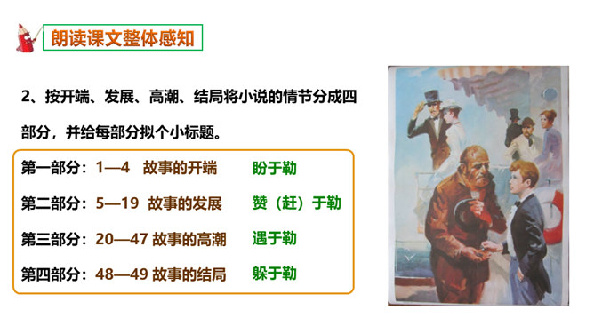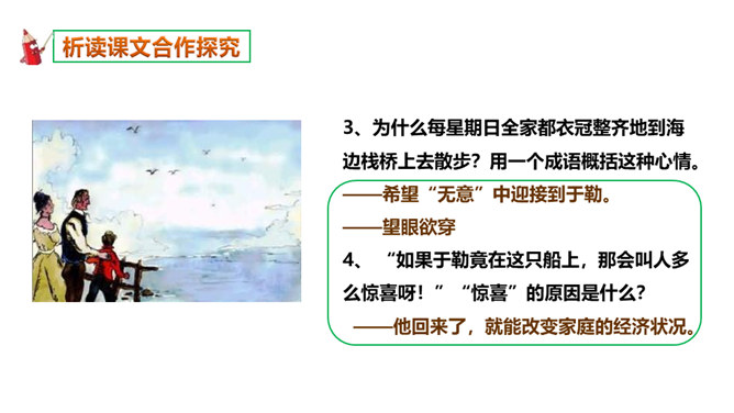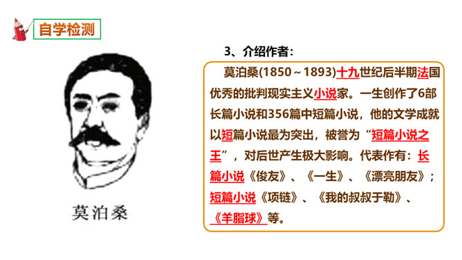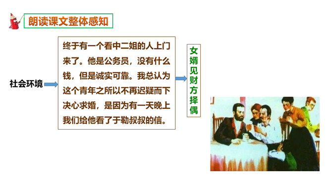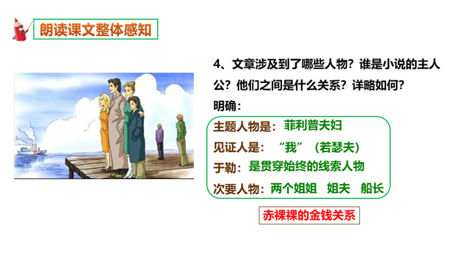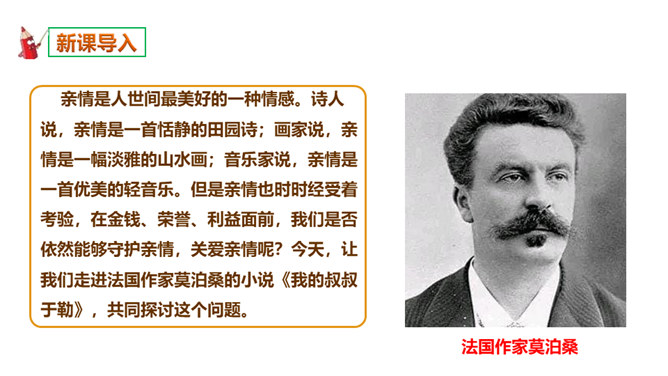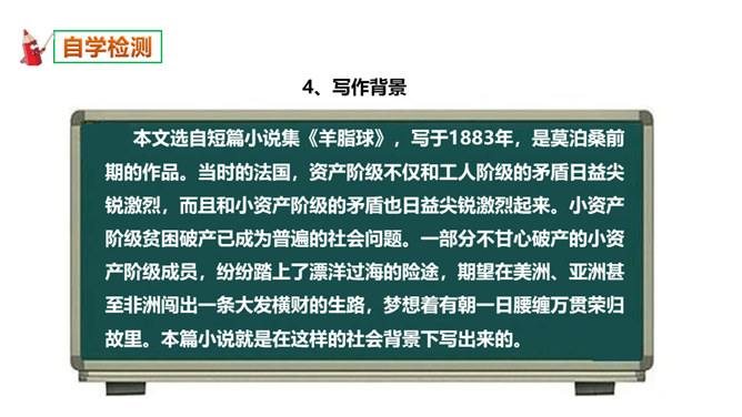 本文选自短篇小说集《羊脂球》,写于1883年,是莫泊桑前期的作品。当时的法国,资产阶级不仅和工人阶级的矛盾日益尖锐激烈,而且和小资产阶级的矛盾也日益尖锐激烈起来。小资产阶级贫困破产已成为普遍的社会问题。一部分不甘心破产的小资产阶级成员,纷纷踏上了漂洋过海的险途,期望在美洲、亚洲甚至非洲闯出一条大发横财的生路,梦想着有朝一日腰缠万贯荣归故里。本篇小说就是在这样的社会背景下写出来的。听读了这篇课文后,谈谈你的感受,你读到了一些什么。读到了人与人之间的金钱关系。读到了人的势利,社会的冷酷。所属专题:我的叔叔于勒ppt。