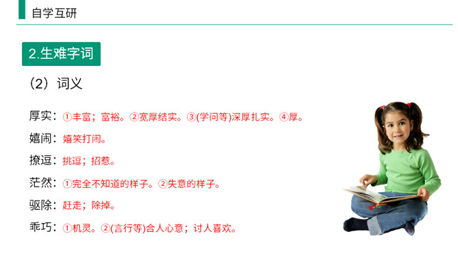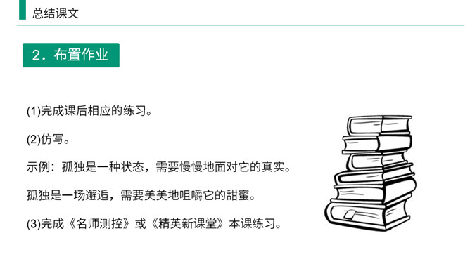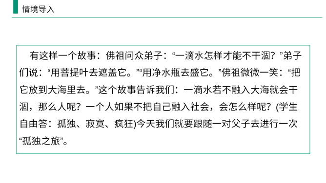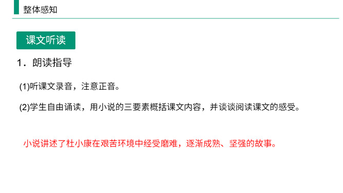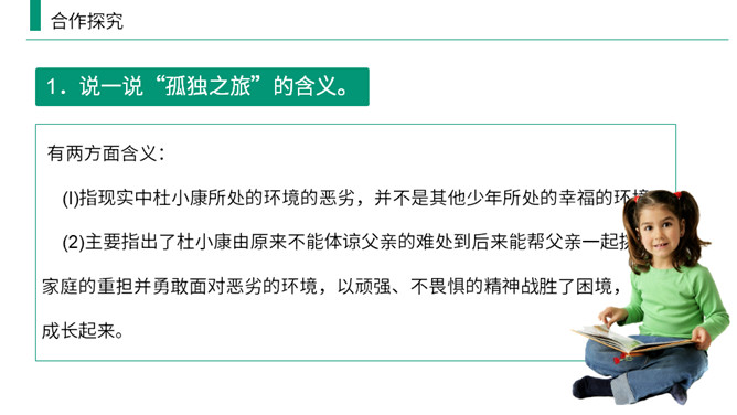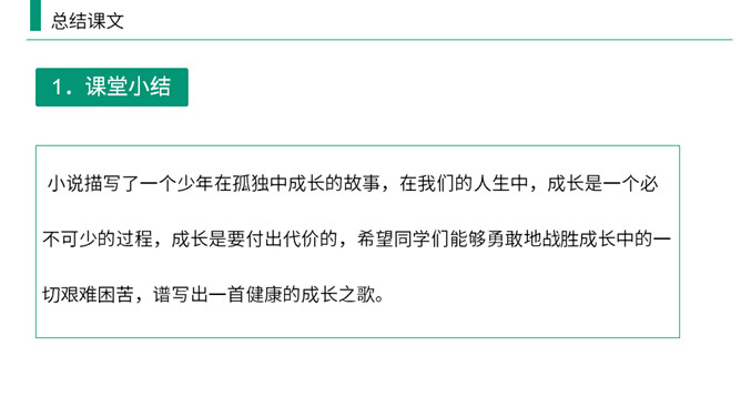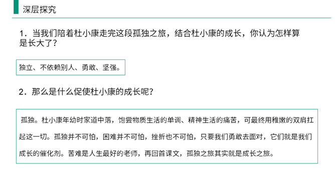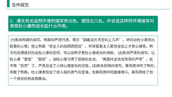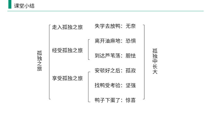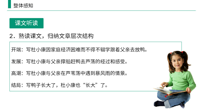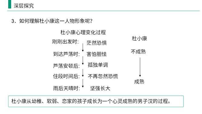 熟读课文,归纳文章层次结构。开端:写杜小康因家庭经济困难而不得不辍学跟着父亲去放鸭。 发展:写杜小康与父亲撑船赶鸭去芦荡的经过和感受。高潮:写杜小康与父亲在芦苇荡中遇到暴风雨的情景。 结局:写鸭子长大了,杜小康也“长大”了。有两方面含义: (1)指现实中杜小康所处的环境的恶劣,并不是其他少年所处的幸福的环境;(2)主要指出了杜小康由原来不能体谅父亲的难处到后来能帮父亲一起挑起家庭的重担并勇敢面对恶劣的环境,以顽强、不畏惧的精神战胜了困境,真正成长起来。所属专题:孤独之旅ppt。
