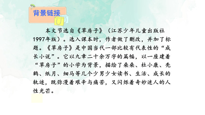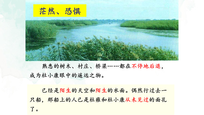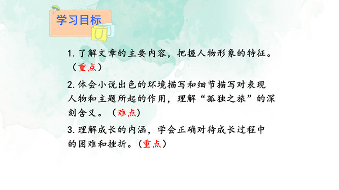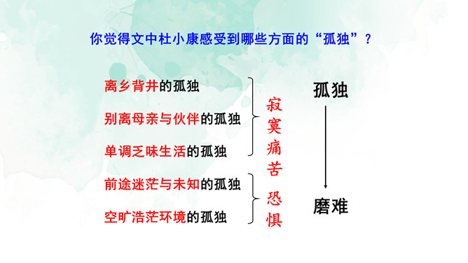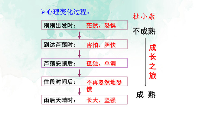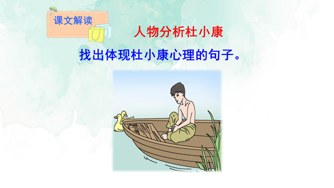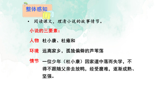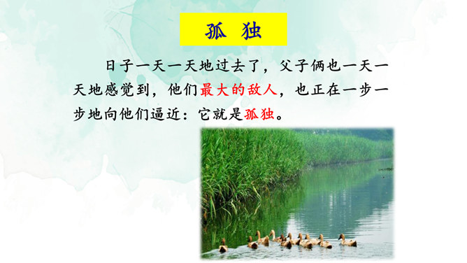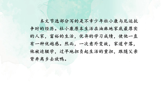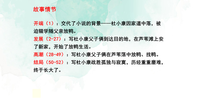 开端(1):交代了小说的背景,杜小康因家道中落,被迫辍学随父亲放鸭。发展(2-27):写杜小康父子俩到达目的地,在芦苇滩上安了新家,开始了放鸭生活。高潮(28-49):写杜小康父子俩在芦苇荡中放鸭、找鸭。结局(50-52):写杜小康战胜孤独与寂寞,历经重重磨难,终于长大了。你认为杜小康是一个怎样的孩子?他是一个不怕困难,在困境中成长,越来越坚强的孩子。他是一个能理解父母苦衷,能为家庭分忧的孩子。他是一个念念不忘求学上进,热爱生活的孩子。文中的自然环境描写很出色,为人物成长提供了广阔的背景。所属专题:孤独之旅ppt。