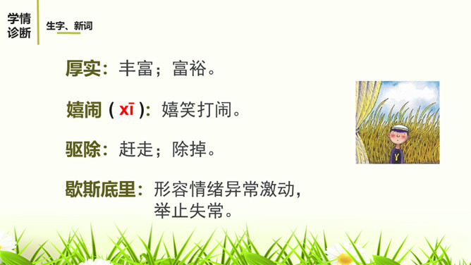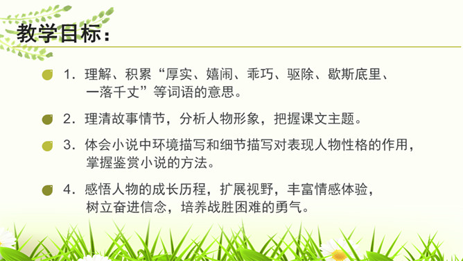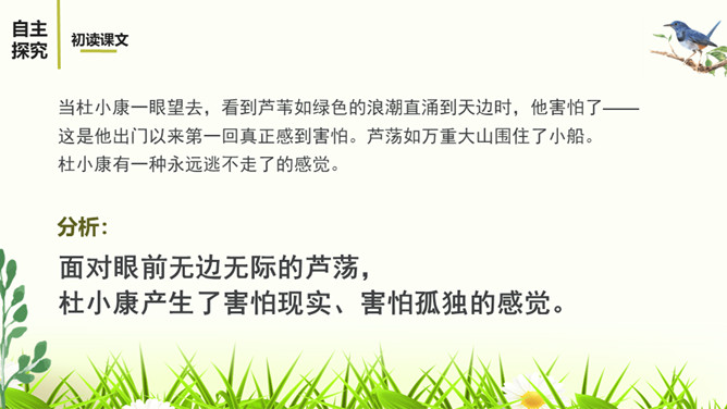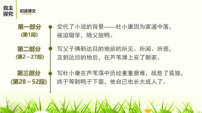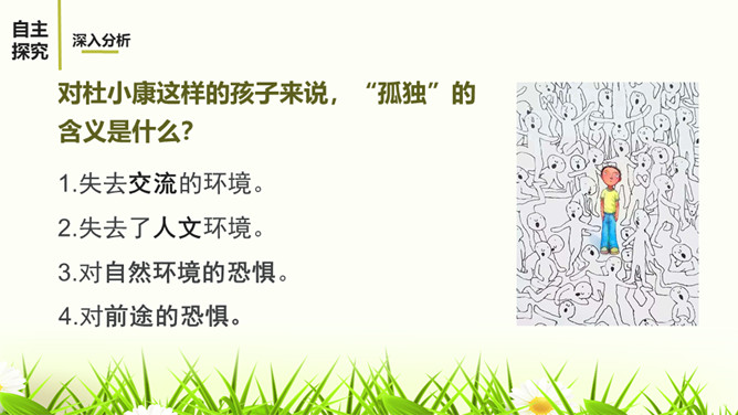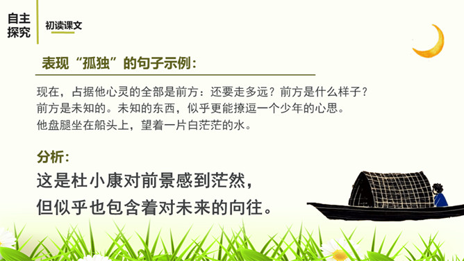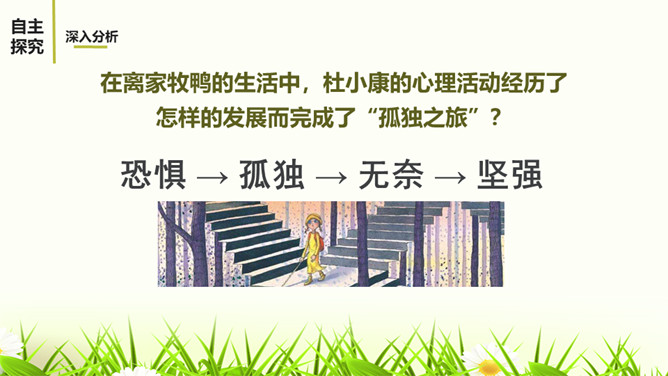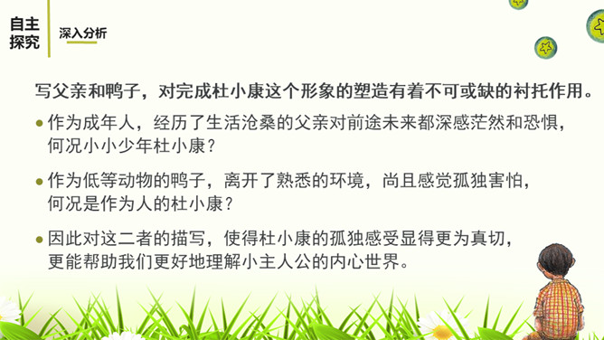 1.理解、积累“厚实、嬉闹、乖巧、驱除、歇斯底里、一落千丈”等词语的意思。2.理清故事情节,分析人物形象,把握课文主题。3.体会小说中环境描写和细节描写对表现人物性格的作用,掌握鉴赏小说的方法。4.感悟人物的成长历程,扩展视野,丰富情感体验,树立奋进信念,培养战胜困难的勇气。写父亲和鸭子,对完成杜小康这个形象的塑造有着不可或缺的衬托作用。作为成年人,经历了生活沧桑的父亲对前途未来都深感茫然和恐惧,何况小小少年杜小康?作为低等动物的鸭子,离开了熟悉的环境,尚且感觉孤独害怕,何况是作为人的杜小康?所属专题:孤独之旅ppt。
