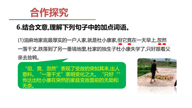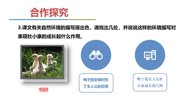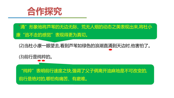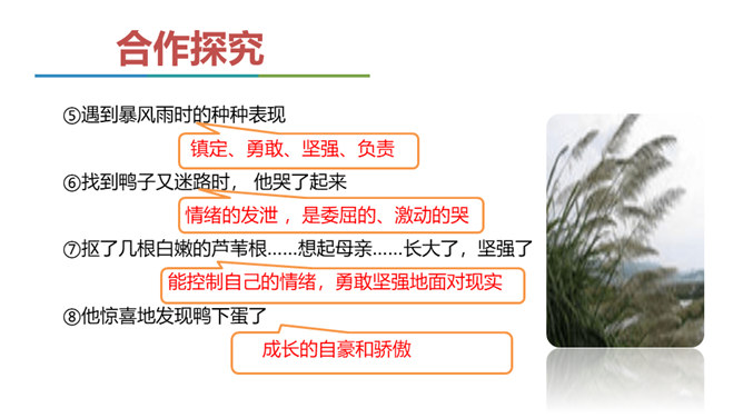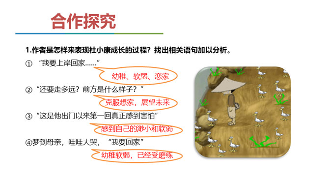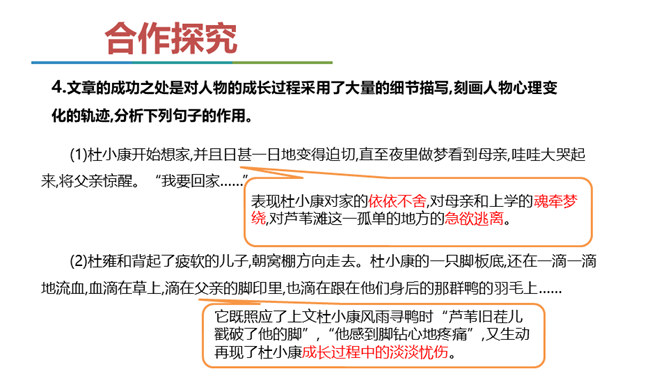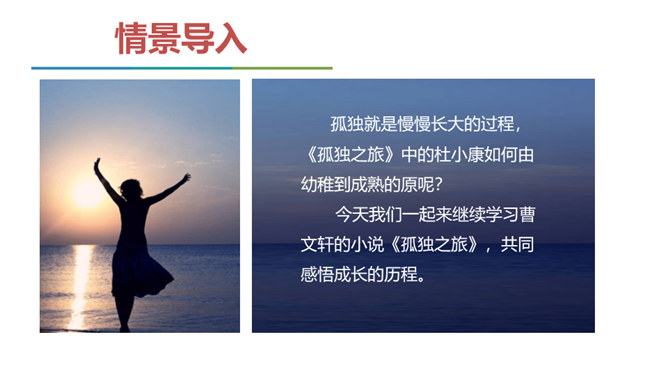 1.学习小说的细节描写和环境描写对表现人物和主题所起的重要作用。2.品味小说精美传神、意味深长的语言。3.感悟人物的成长历程,扩展视野,丰富情感体验,树立奋进信念,培养战胜困难的勇气。前部分那无边无际的芦苇荡制造了杜小康的恐惧与孤独。后部分的芦苇荡衬托了杜小康的“成长”。成长,是一个美好的过程,每个人成长的经历不同,成长的故事也就丰富多彩,你在成长的道路上感受过孤独吗?孤独是一座没上发条的钟,孤独是一朵凌寒开放的花;孤独是面对爱人欲诉不能的无奈,孤独是面对朋友难分难舍的牵挂。所属专题:孤独之旅ppt。
