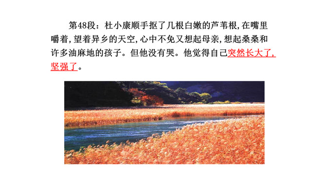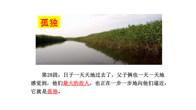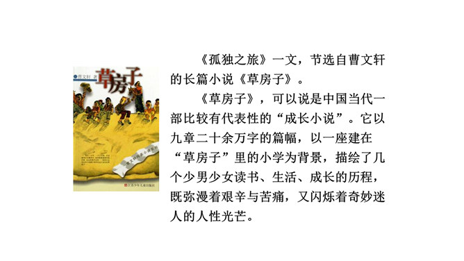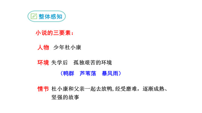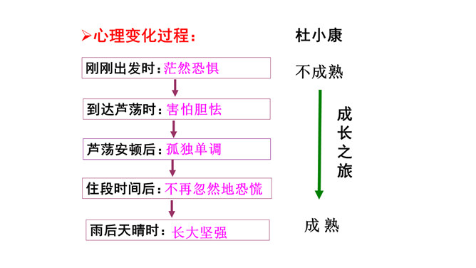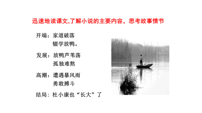 鸭群是杜小康亲密的伙伴。作者以较大的篇幅描写这些鸭子,这与表现杜小康的成长有什么联系?鸭子的叫声烘托出杜小康无比寂寞的心情,鸭子的恐惧感烘托出杜小康的恐慌。鸭子是杜小康成长的借物。当暴风雨来临之时,杜小康勇敢地追赶鸭群,他经受住磨难,长大,坚强。鸭们也长大了,长成真正的鸭。鸭子的心理其实就是主人公心理的写照,它的成长过程也反映了主人公的成长过程,可以说鸭子是杜小康成长的借助。课文详写了孤独之旅中的那场暴风雨,这场风雨对“我”有什么影响?所属专题:孤独之旅ppt。