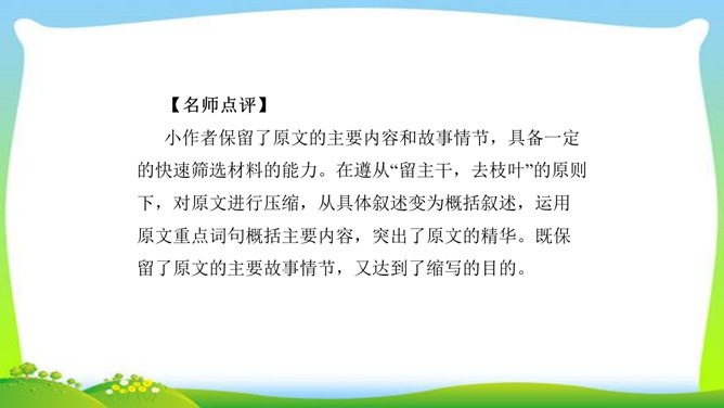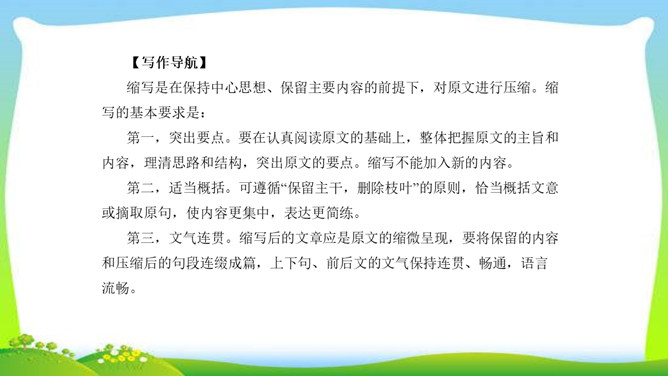 缩写是在保持中心思想、保留主要内容的前提下,对原文进行压缩。缩写的基本要求是:第一,突出要点。要在认真阅读原文的基础上,整体把握原文的主旨和内容,理清思路和结构,突出原文的要点。缩写不能加入新的内容。第二,适当概括。可遵循“保留主干,删除枝叶”的原则,恰当概括文意或摘取原句,使内容更集中,表达更简练。第三,文气连贯。缩写后的文章应是原文的缩微呈现,要将保留的内容和压缩后的句段连缀成篇,上下句、前后文的文气保持连贯、畅通,语言流畅。所属专题:学习缩写ppt。