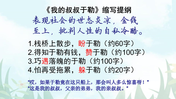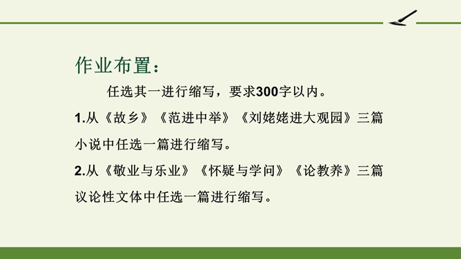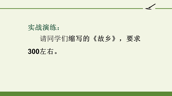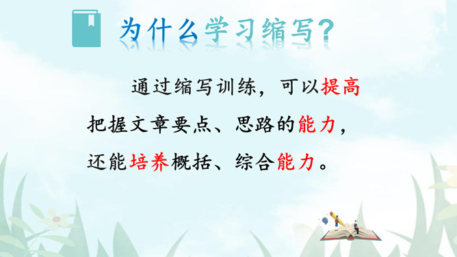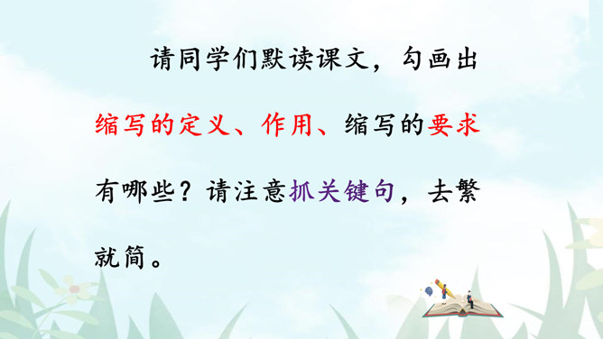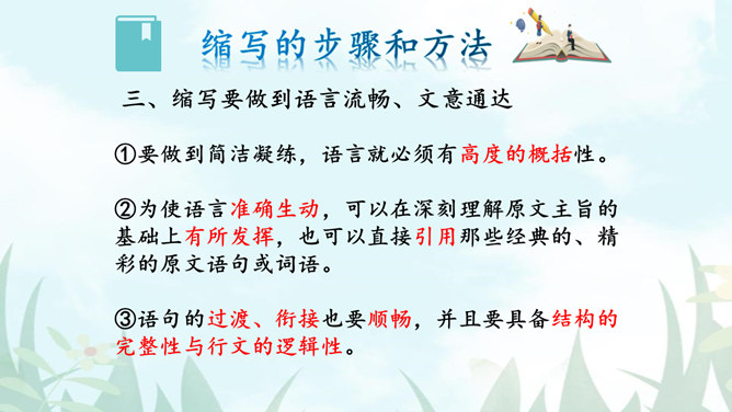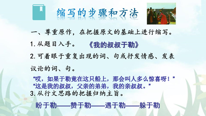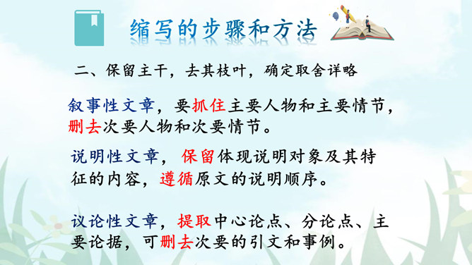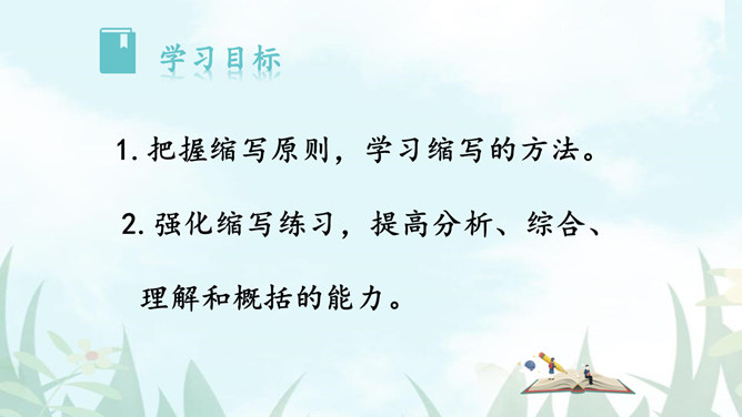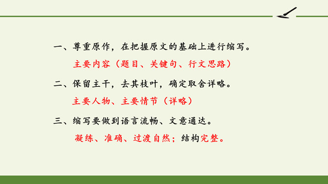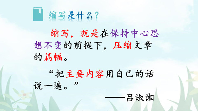 1.把握缩写原则,学习缩写的方法。2.强化缩写练习,提高分析、综合、理解和概括的能力。请同学们默读课文,勾画出缩写的定义、作用、缩写的要求有哪些?请注意抓关键句,去繁就简。通过缩写训练,可以提高把握文章要点、思路的能力,还能培养概括、综合能力。一、尊重原作,在把握原文的基础上进行缩写。1.从题目入手。2.可着眼于重复出现的词、句或抒发情感、发表议论的词、句。3.从行文思路的把握归纳主旨。二、保留主干,去其枝叶,确定取舍详略。叙事性文章,要抓住主要人物和主要情节,删去次要人物和次要情节。所属专题:学习缩写ppt。