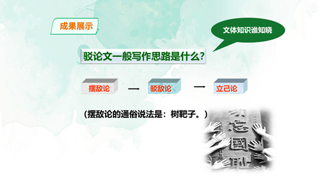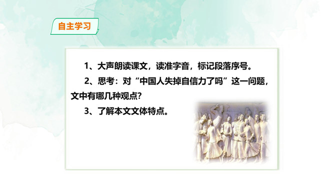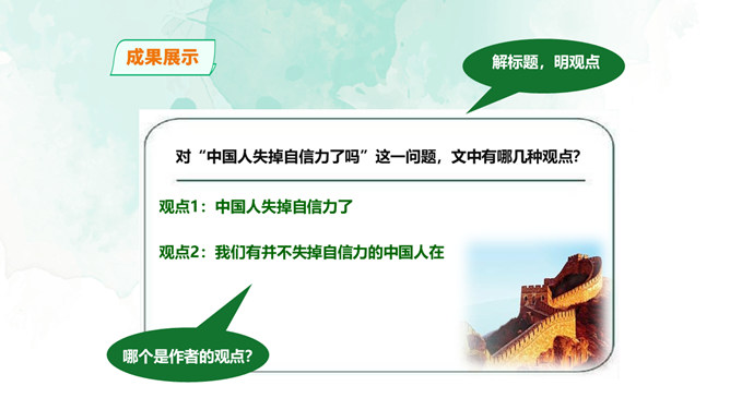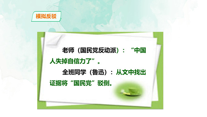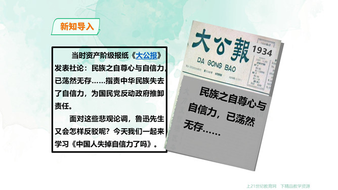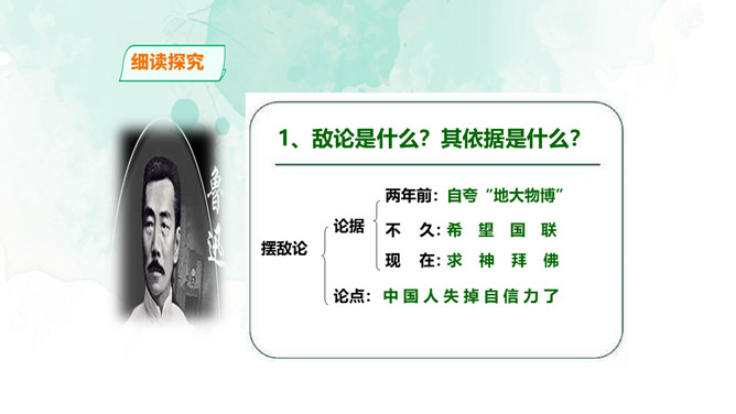 1、2段摆敌论,3、5段用驳论证的方法直接批驳敌论,然后确立一个与敌论针锋相对的观点对敌论进行间接反驳。两者结合,论证严密。作者最后得出结论,“自信力的有无,状元宰相的文章不足为据,要自己去看地底下。”请问“状元宰相”和“地底下”分别有何含义?“状元宰相”是统治者及其御用文人,“地底下”指当时处于地下斗争状态的中国共产党及其革命力量。鲁迅对敌人深恶痛绝,而对中国人民的优秀儿女则是衷心爱戴。这爱憎分明的情感是如何通过语言表现出来的?请同学们从文中找到相关词、句,和小组同学一起品析。所属专题:中国人失掉自信力了吗ppt。
