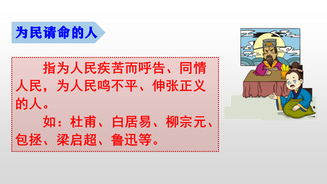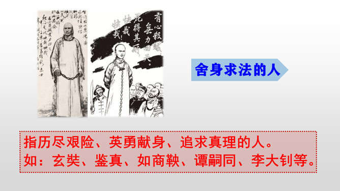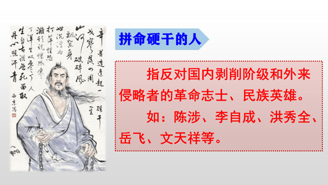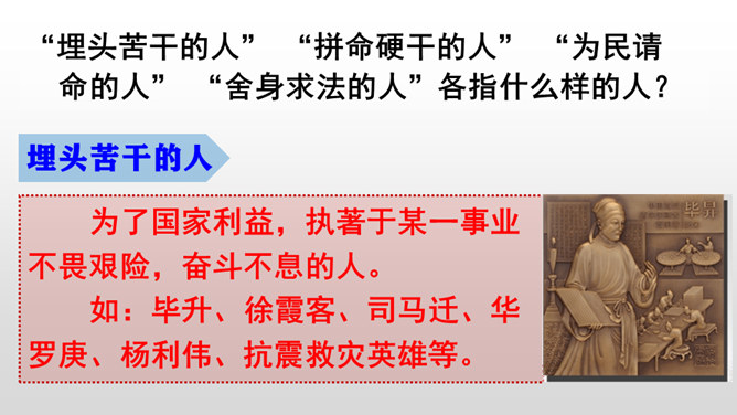 “埋头苦干的人” “拼命硬干的人” “为民请命的人” “舍身求法的人”各指什么样的人?为了国家利益,执著于某一事业不畏艰险,奋斗不息的人。埋头苦干的人如:毕升、徐霞客、司马迁、华罗庚、杨利伟、抗震救灾英雄等。拼命硬干的人指反对国内剥削阶级和外来侵略者的革命志士、民族英雄。如:陈涉、李自成、洪秀全、岳飞、文天祥等。为民请命的人指为人民疾苦而呼告、同情人民,为人民鸣不平、伸张正义的人。如:杜甫、白居易、柳宗元、包拯、梁启超、鲁迅等。舍身求法的人指历尽艰险、英勇献身、追求真理的人。所属专题:中国人失掉自信力了吗ppt。