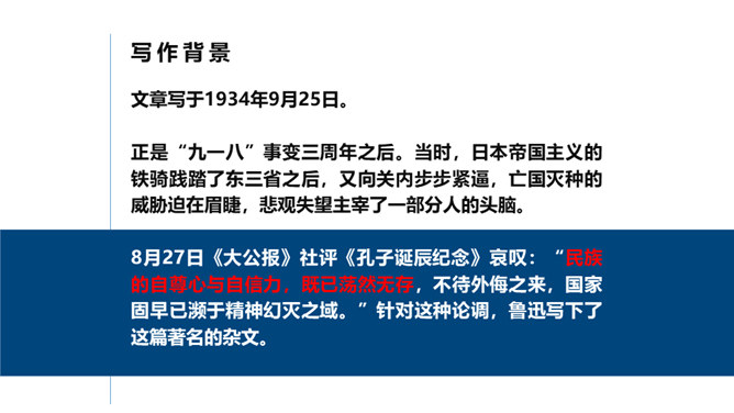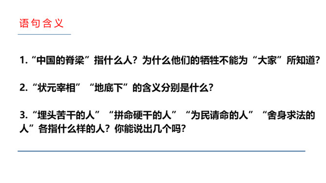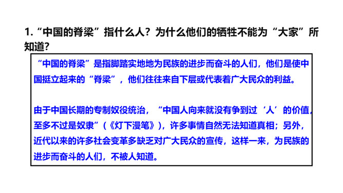 “中国的脊梁”指什么人?为什么他们的牺牲不能为“大家”所知道?“中国的脊梁”是指脚踏实地地为民族的进步而奋斗的人们,他们是使中国挺立起来的“脊梁”,他们往往来自下层或代表着广大民众的利益。由于中国长期的专制奴役统治,“中国人向来就没有争到过‘人’的价值,至多不过是奴隶”,许多事情自然无法知道真相;另外,近代以来的许多社会变革多缺乏对广大民众的宣传,这样一来,为民族的进步而奋斗的人们,不被人知道。“状元宰相”“地底下”的含义分别是什么?“状元宰相”是指统治阶级的御用文人。所属专题:中国人失掉自信力了吗ppt。