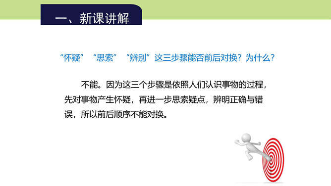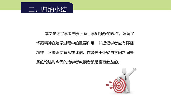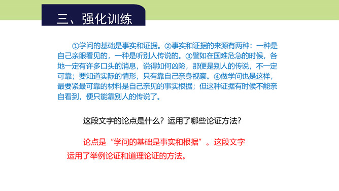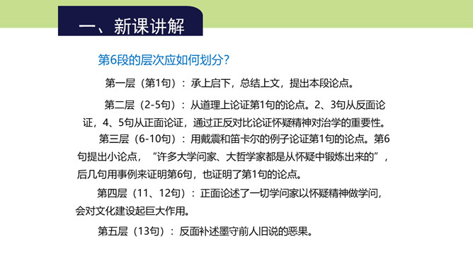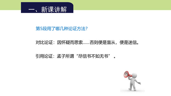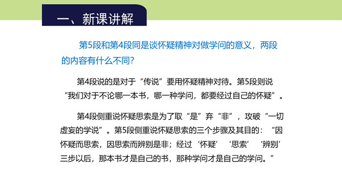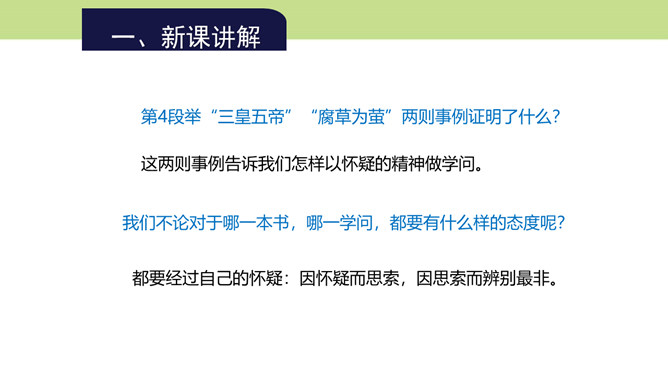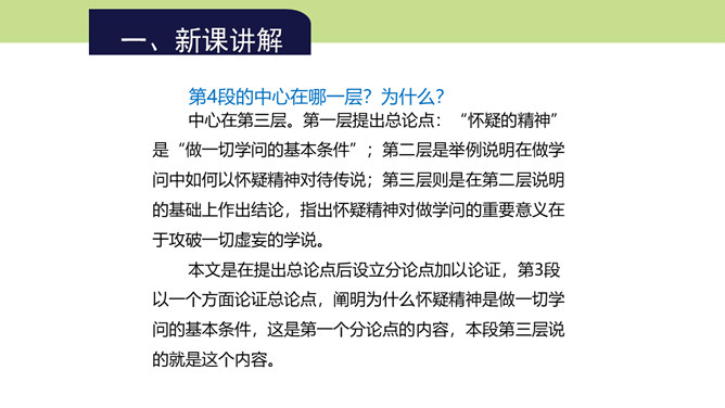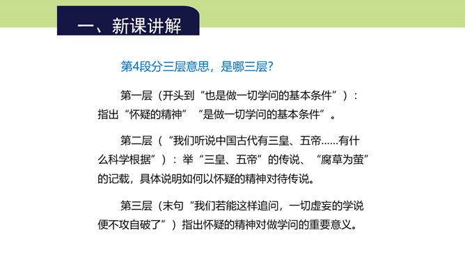 第4段的中心在哪一层?为什么?中心在第三层。第一层提出总论点:“怀疑的精神”是“做一切学问的基本条件”;第二层是举例说明在做学问中如何以怀疑精神对待传说;第三层则是在第二层说明的基础上作出结论,指出怀疑精神对做学问的重要意义在于攻破一切虚妄的学说。本文是在提出总论点后设立分论点加以论证,第3段以一个方面论证总论点,阐明为什么怀疑精神是做一切学问的基本条件,这是第一个分论点的内容,本段第三层说的就是这个内容。第4段举“三皇五帝”“腐草为萤”两则事例证明了什么?所属专题:怀疑与学问ppt。