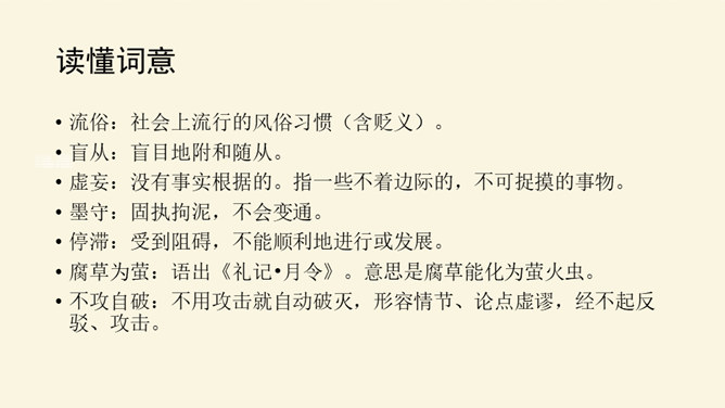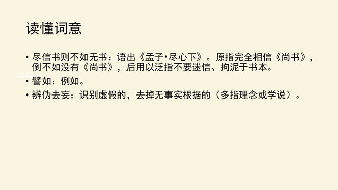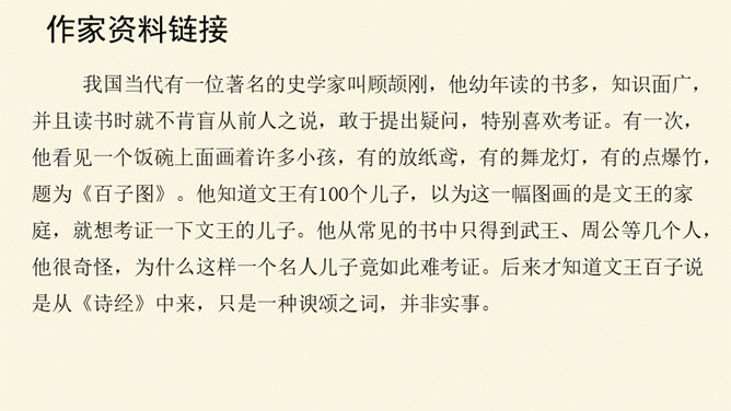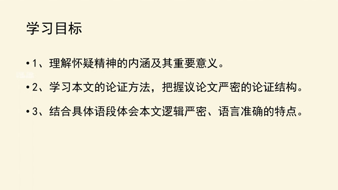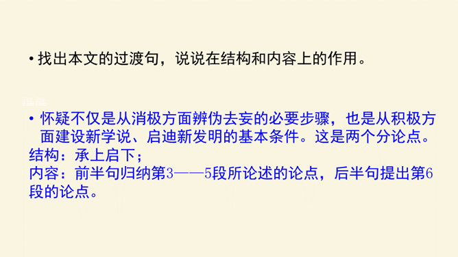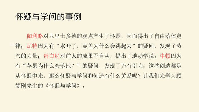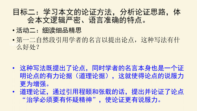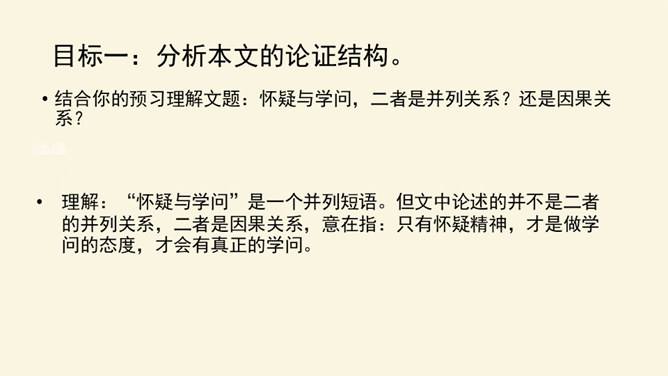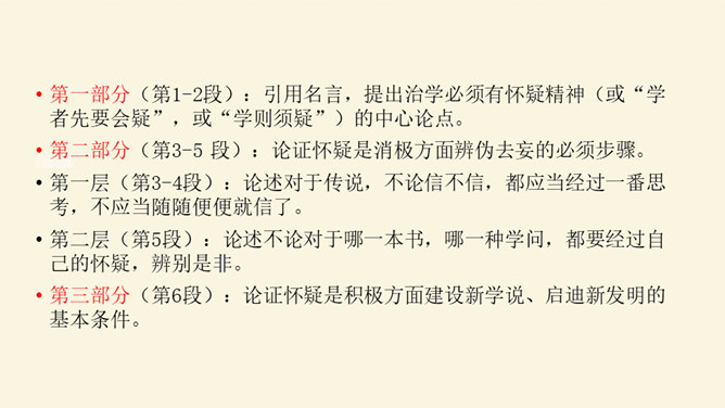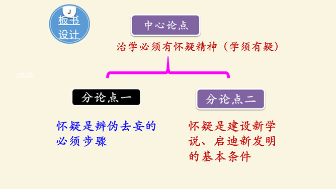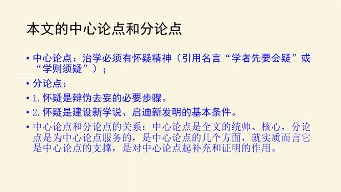 本文论述了学者先要会疑,学则须疑的观点,强调了怀疑精神在治学过程中的重要作用,并提倡学者应有怀疑精神,不要随便盲从或迷信。本文围绕着中心论点,分设了两个分论点,分层次地进行论述,条理清楚,中心明确。作者关于怀疑与学问之间关系的论述对今天的治学者或读者都是富有教益的。小结本文的结构和语言特点:结构完整严密,论证层层推进,鞭辟入里,论述有理有据,详略得当,具有很强的论证力量和说服力,对做学问和谋求进步者都有着很强的启发作用。所属专题:怀疑与学问ppt。