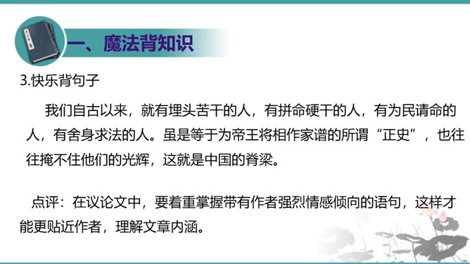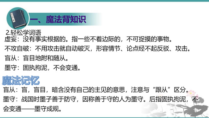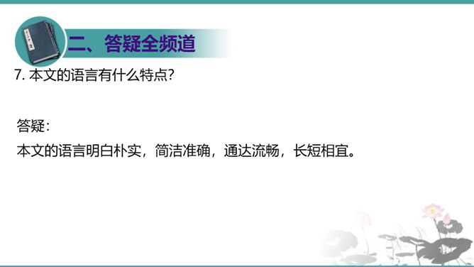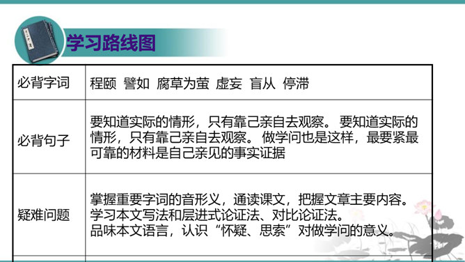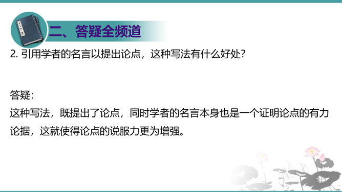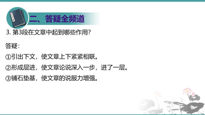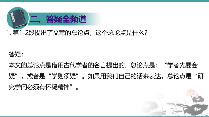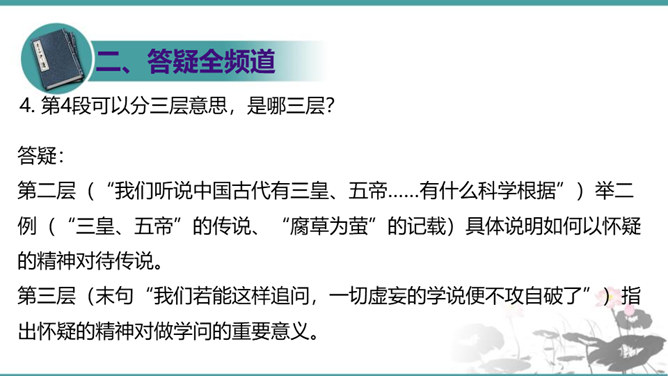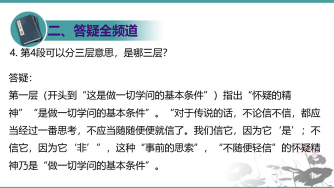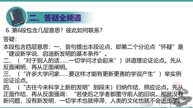 第6段包含几层意思?彼此如何联系?答疑:本段包含四层意思:一、首句提出本段论点,即第二个分论点“怀疑”是“建设新学说、启迪新发明的基本条件”。二、(“对于别人的话……一切学问才会起来”)讲道理论证论点。先从反面阐明,再从正面阐明。三、(“许多大学问家……要这样才能有更新更善的学说产生”)举实例论证论点。四、(“古往今来科学上新的发明”到段末)归纳作结,照应论点。先从正面作结,再从反面强调:“若使后之学者都墨守前人的旧说,那就没有新问题,没有新发明,一切学术也就停滞,人类的文化也就不会进步了。”所属专题:怀疑与学问ppt。