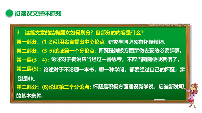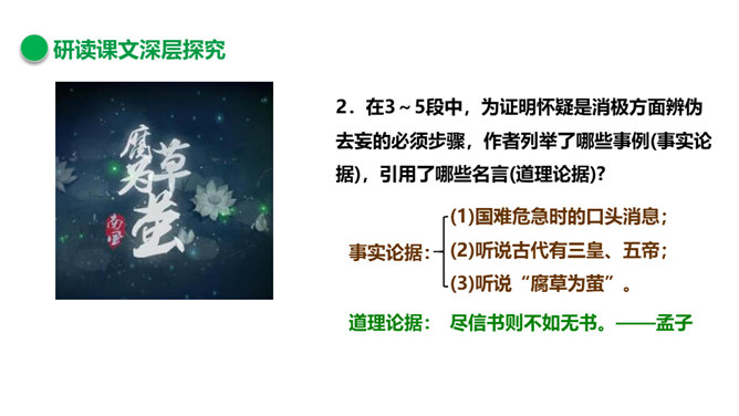 作者提出了论点,就要去论证论点,论证论点所用的材料就是论据。所举的例子或概括的事实,就是事实论据,所引用的名言、格言、俗语、警句等就是道理论据。用事实论据论证论点的方法就是举例论证,用道理论据论证论点的方法就是道理论证。对比论证是将两种矛盾或对立的事物或道理加以对照比较,从正反两方面进行说理的论证方法,使所阐述的事理更加深刻,更有说服力。下面两组句子运用了对比论证的方法,试分析其表达效果。我们信它,因为它“是”;不信它,因为它“非”。从正反两方面说理,阐明原因。所属专题:怀疑与学问ppt。