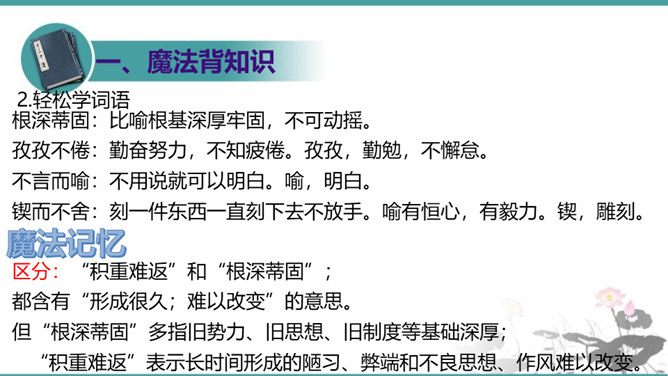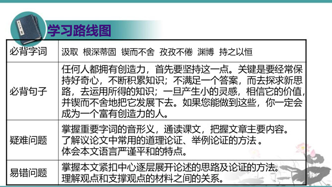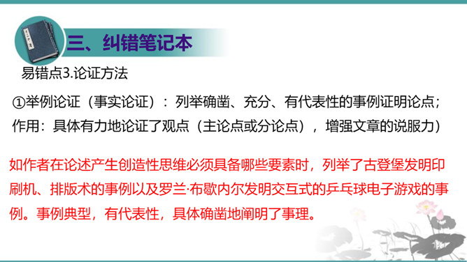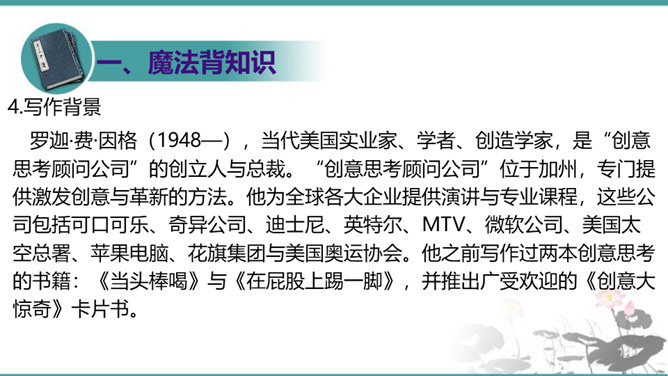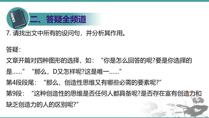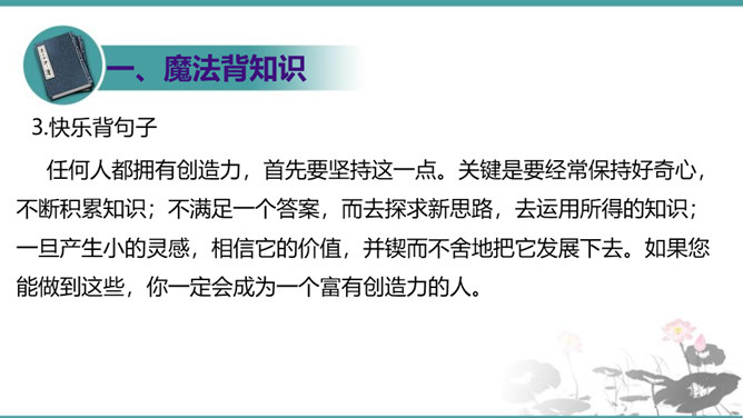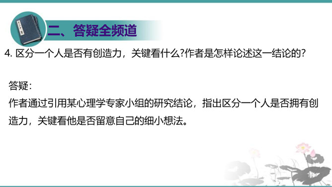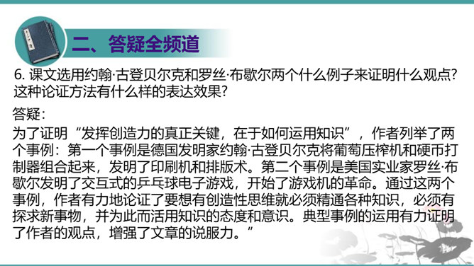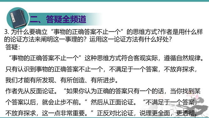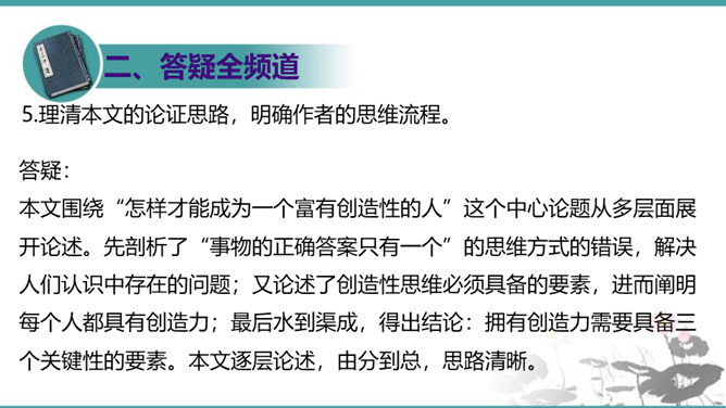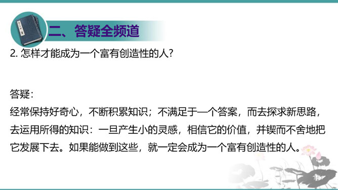 怎样才能成为一个富有创造性的人?经常保持好奇心,不断积累知识;不满足于—个答案,而去探求新思路,去运用所得的知识:一旦产生小的灵感,相信它的价值,并锲而不舍地把它发展下去。如果能做到这些,就一定会成为一个富有创造性的人。为什么要确立“事物的正确答案不止一个”的思维方式?作者是用什么样的论证方法来阐明这一事理的?运用这一论证方法有什么好处?“事物的正确答案不止一个”这种思维方式符合客观实际,遵循自然规律。只有认识到事物的正确答案不止一个,不满足于一个答案,不放弃探求,我们才能有所发现、有所创造、有所进步。所属专题:谈创造性思维ppt。