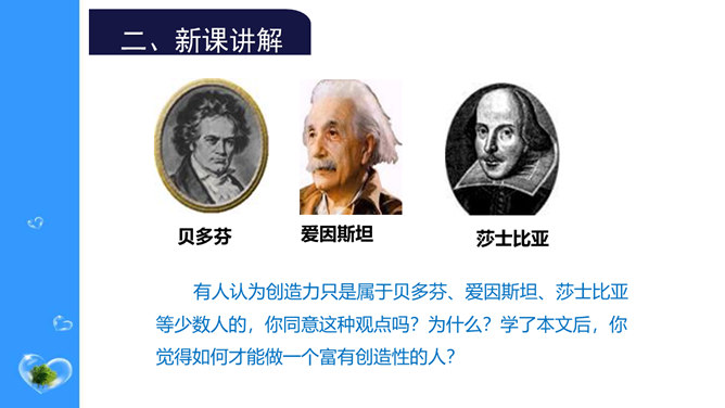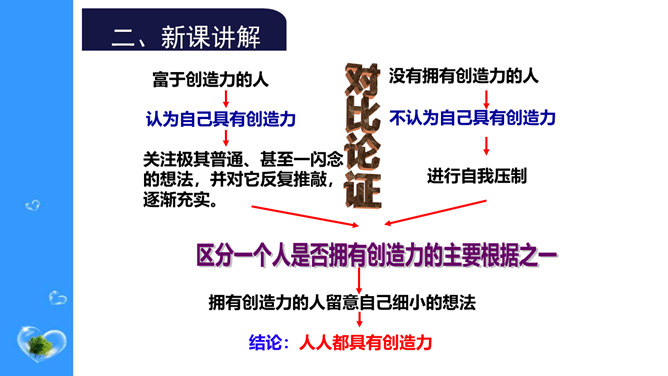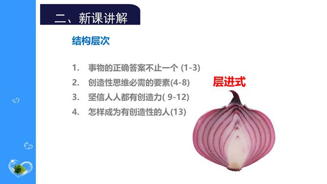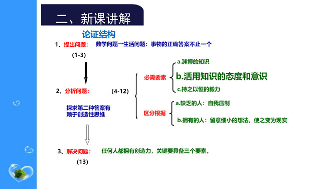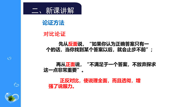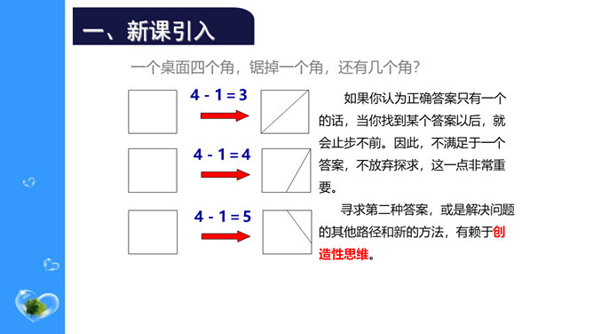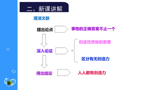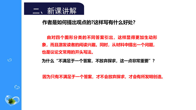 1、事物的正确答案为什么不止一个?2、本文主要论述的是什么问题?作者为什么要从“事物的正确答案不止一个”谈起?3、根据议论文的结构特点,理清文章层次。作者是如何提出观点的?这样写有什么好处?由对四个图形分类的不同答案引出,这样显得更加生动形象,而且激发读者的阅读兴趣。同时,从材料中提出一个问题,也是议论文常用的开头写法。为什么“不满足于一个答案,不放弃探求,这一点非常重要”?因为只有不满足于一个答案,才不会放弃探求,才会有所发明创造。围绕“事物的正确答案不止一个”这一观点,作者阐述了哪几个问题?所属专题:谈创造性思维ppt。