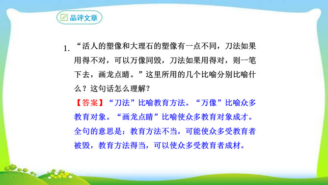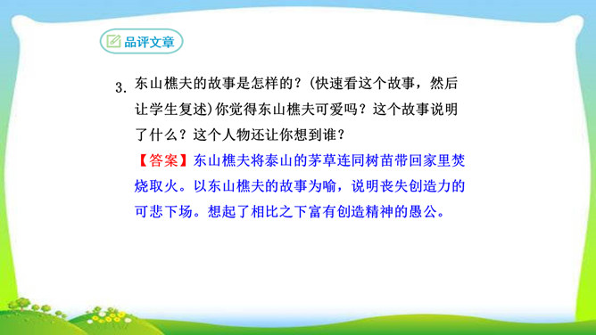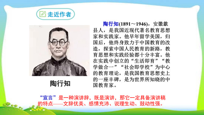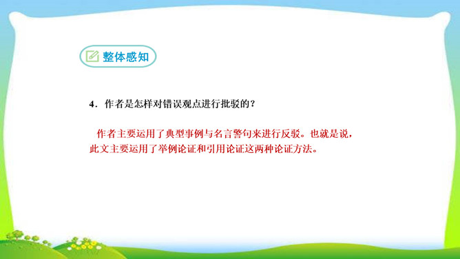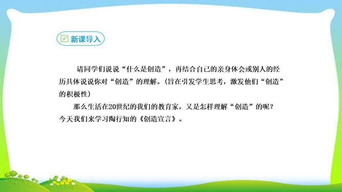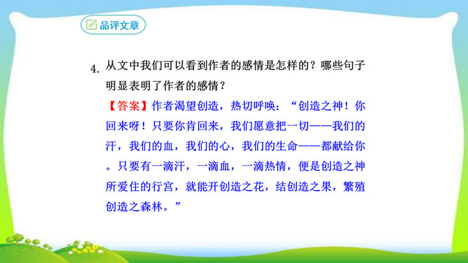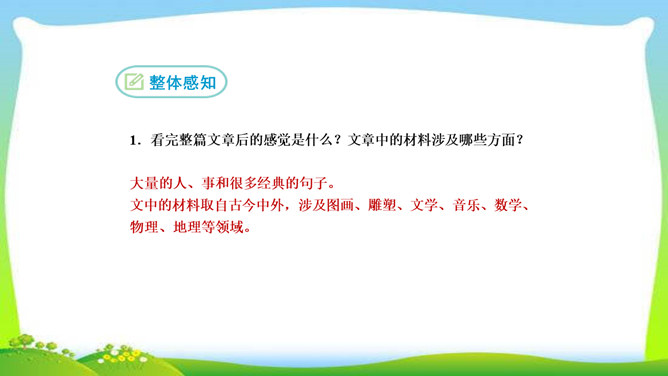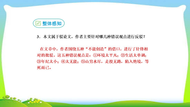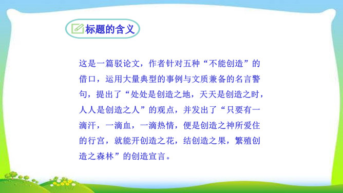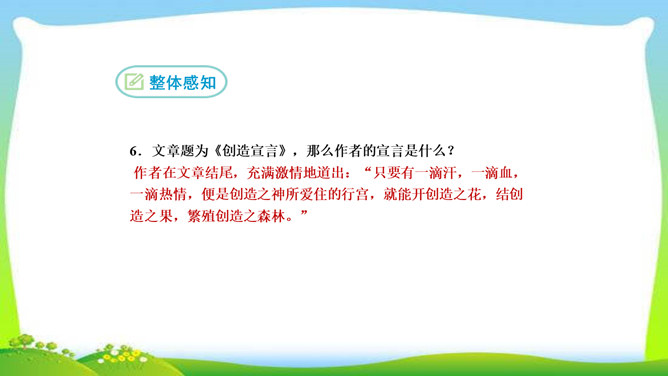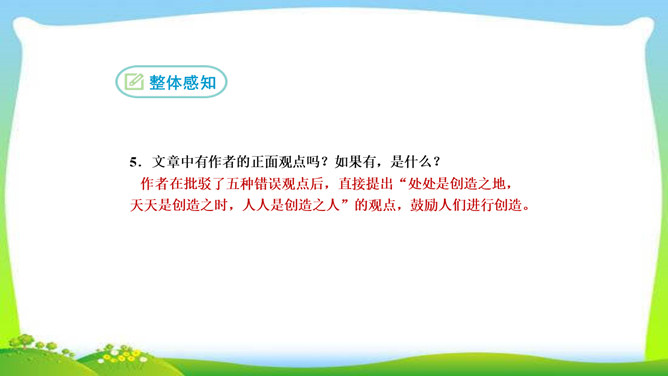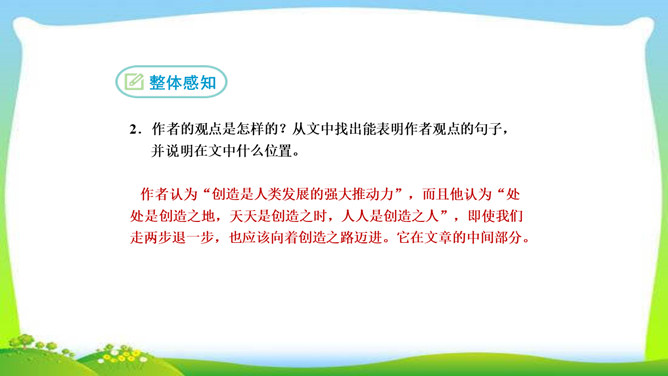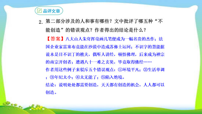 看完整篇文章后的感觉是什么?文章中的材料涉及哪些方面?大量的人、事和很多经典的句子。文中的材料取自古今中外,涉及图画、雕塑、文学、音乐、数学、物理、地理等领域。作者的观点是怎样的?从文中找出能表明作者观点的句子, 并说明在文中什么位置。作者认为“创造是人类发展的强大推动力”,而且他认为“处处是创造之地,天天是创造之时,人人是创造之人”,即使我们走两步退一步,也应该向着创造之路迈进。它在文章的中间部分。本文属于驳论文,作者主要针对哪几种错误观点进行反驳?所属专题:创造宣言ppt。