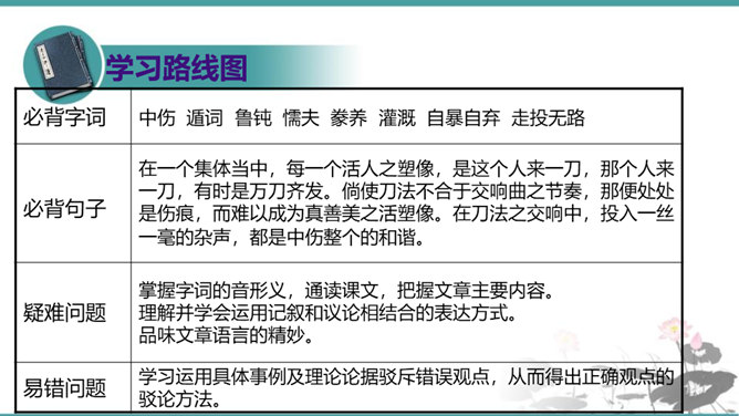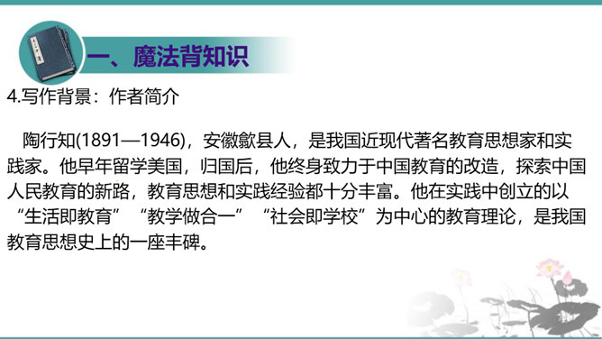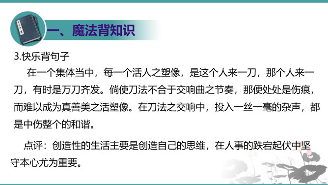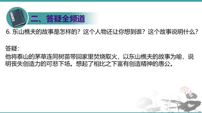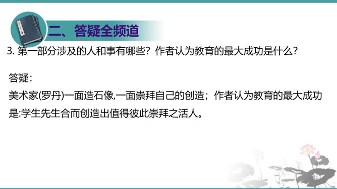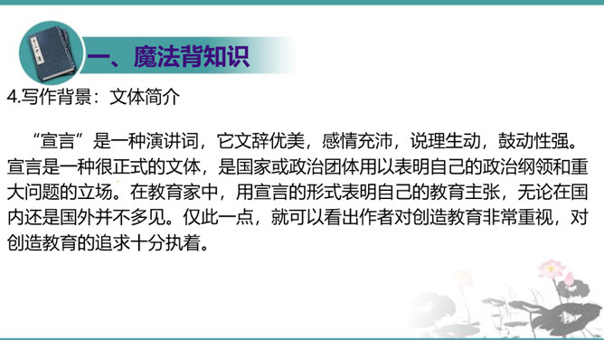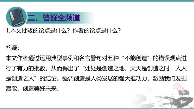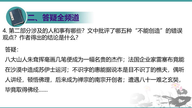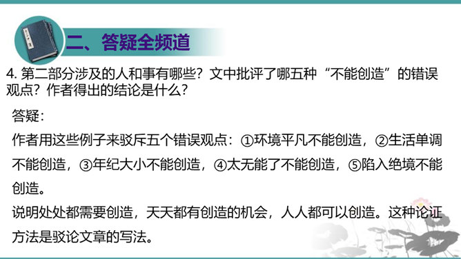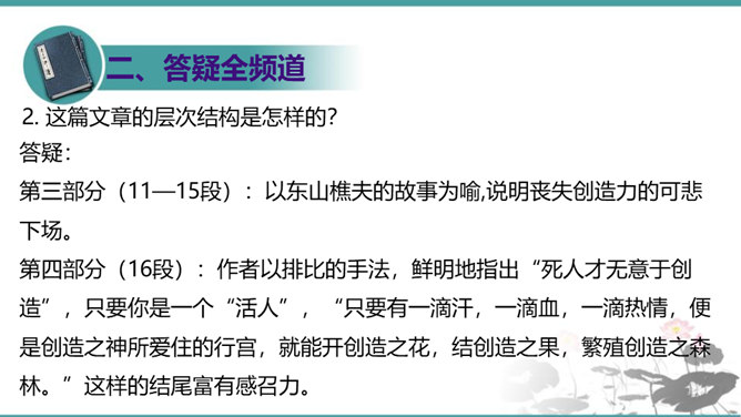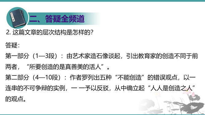 第一部分(1—3段):由艺术家造石像谈起,引出教育家的创造不同于前两者,“所要创造的是真善美的活人”。第二部分(4—10段):作者罗列出五种“不能创造”的错误观点,以一连串的不可争辩的实例,予以反驳,从中确立起“人人是创造之人”的观点。第三部分(11—15段):以东山樵夫的故事为喻,说明丧失创造力的可悲下场。第四部分(16段):作者以排比的手法,鲜明地指出“死人才无意于创造”,只要你是一个“活人”,“只要有一滴汗,一滴血,一滴热情,便是创造之神所爱住的行宫,就能开创造之花,结创造之果,繁殖创造之森林。”所属专题:创造宣言ppt。