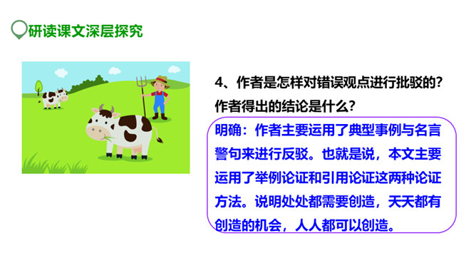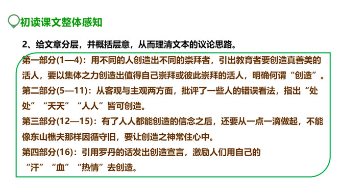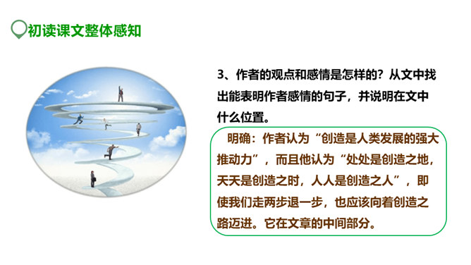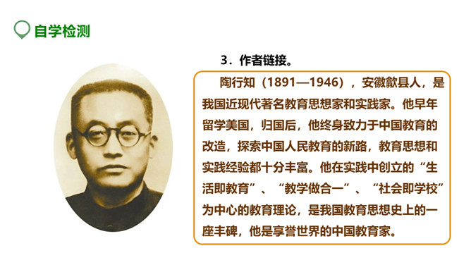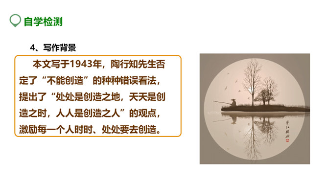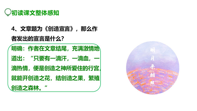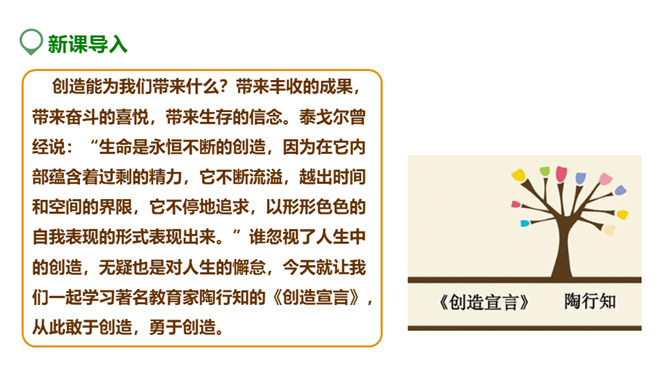创造能为我们带来什么?带来丰收的成果,带来奋斗的喜悦,带来生存的信念。泰戈尔曾经说:“生命是永恒不断的创造,因为在它内部蕴含着过剩的精力,它不断流溢,越出时间和空间的界限,它不停地追求,以形形色色的自我表现的形式表现出来。”谁忽视了人生中的创造,无疑也是对人生的懈怠,今天就让我们一起学习著名教育家陶行知的《创造宣言》,从此敢于创造,勇于创造。本文写于1943年,陶行知先生否定了“不能创造”的种种错误看法,提出了“处处是创造之地,天天是创造之时,人人是创造之人”的观点,激励每一个人时时、处处要去创造。所属专题:创造宣言ppt。