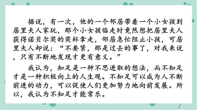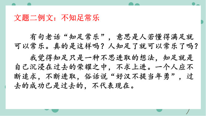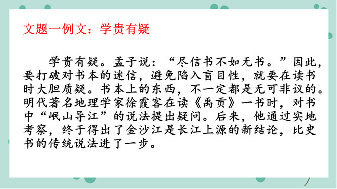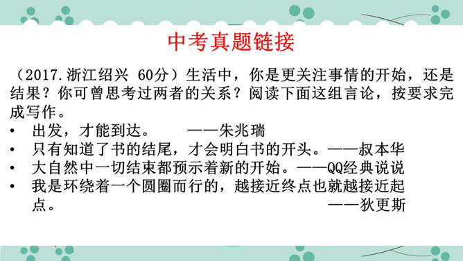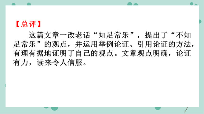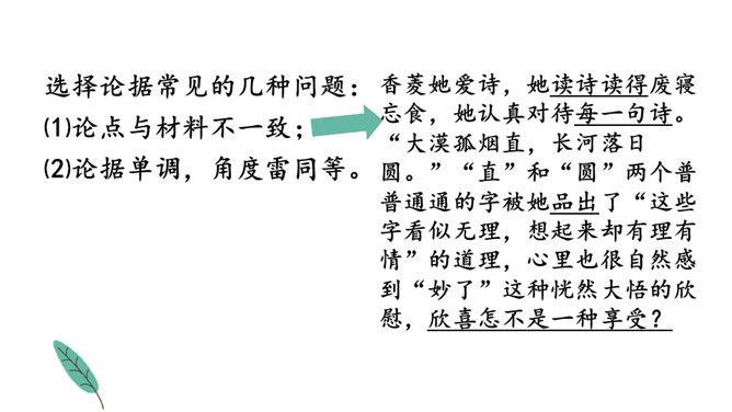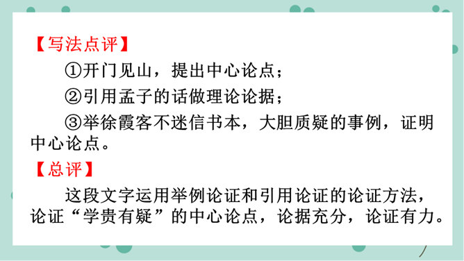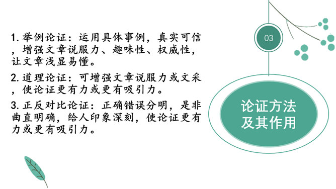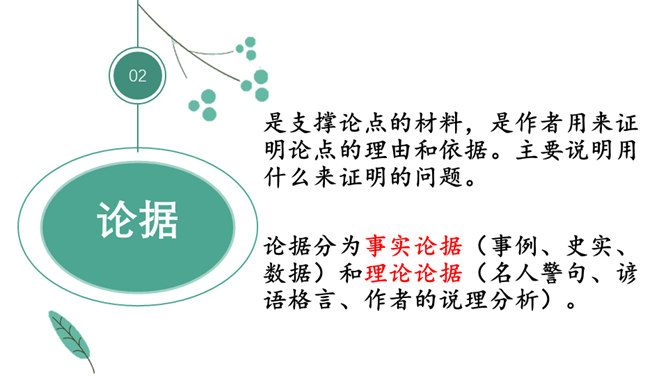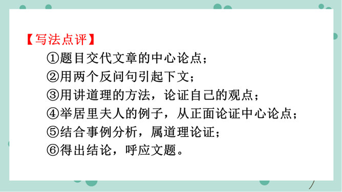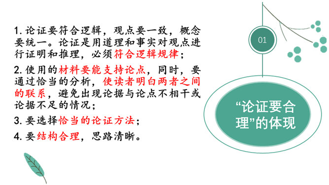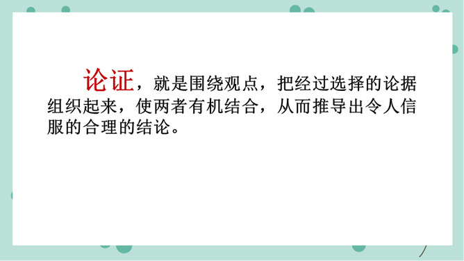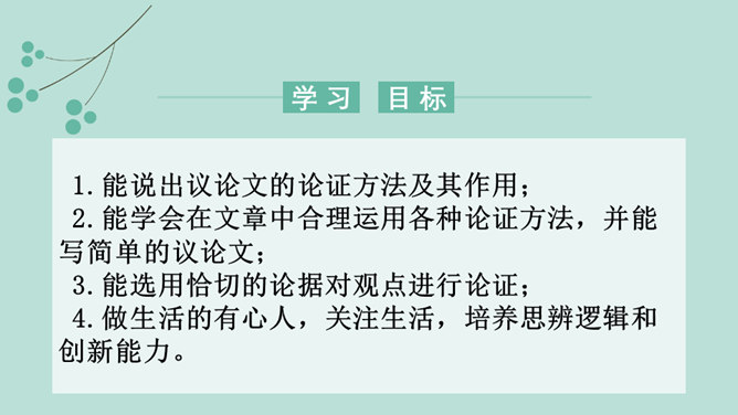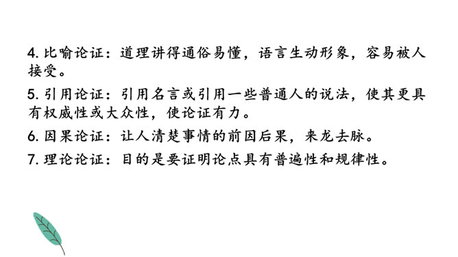 1.能说出议论文的论证方法及其作用;2.能学会在文章中合理运用各种论证方法,并能写简单的议论文;3.能选用恰切的论据对观点进行论证;4.做生活的有心人,关注生活,培养思辨逻辑和创新能力。1.论证要符合逻辑,观点要一致,概念要统一。论证是用道理和事实对观点进行证明和推理,必须符合逻辑规律;2.使用的材料要能支持论点,同时,要通过恰当的分析,使读者明白两者之间的联系,避免出现论据与论点不相干或论据不足的情况;3.要选择恰当的论证方法;4.要结构合理,思路清晰。所属专题:论证要合理ppt。