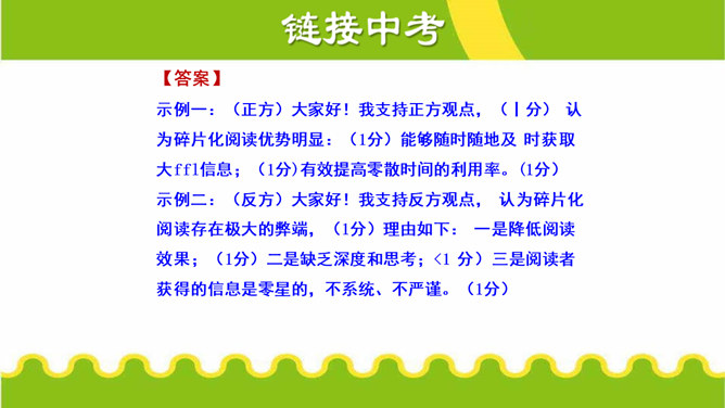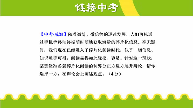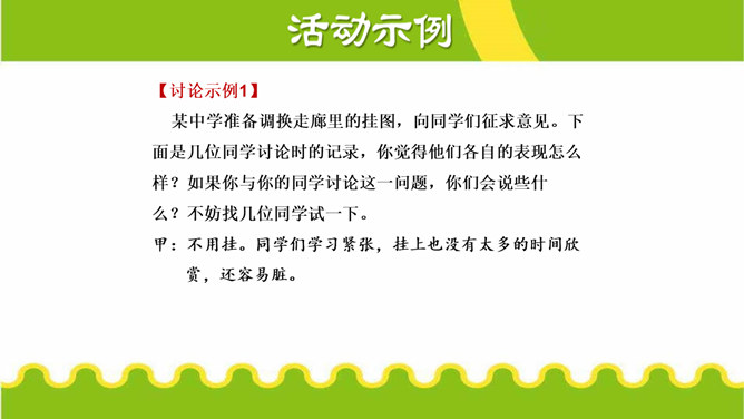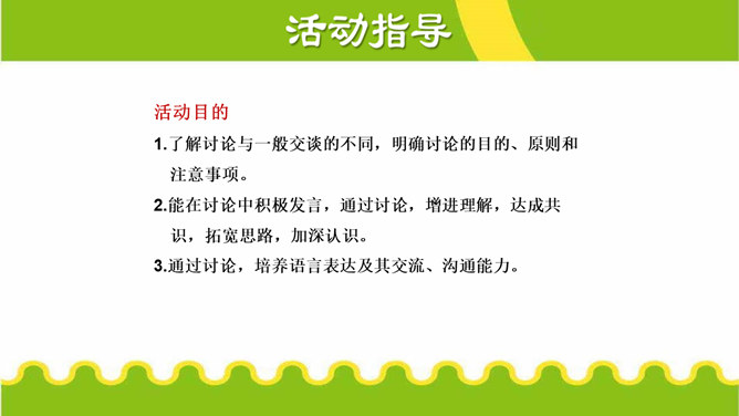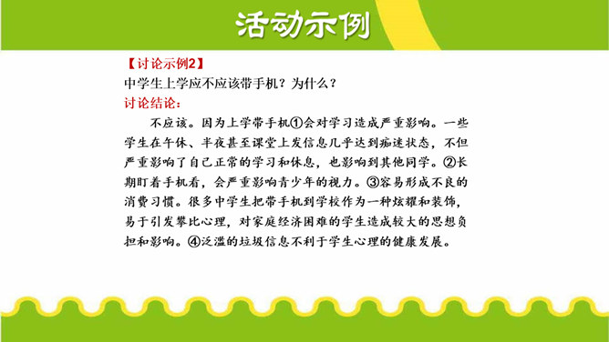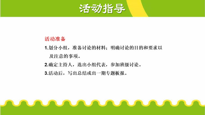 活动目的:1.了解讨论与一般交谈的不同,明确讨论的目的、原则和注意事项。2.能在讨论中积极发言,通过讨论,增进理解,达成共识,拓宽思路,加深认识。3.通过讨论,培养语言表达及其交流、沟通能力。活动准备:1.划分小组,准备讨论的材料;明确讨论的目的和要求以及注意的事项。2.确定主持人,选出小组代表,参加班级讨论。3.活动后,写出总结或出一期专题板报。所属专题:讨论ppt。