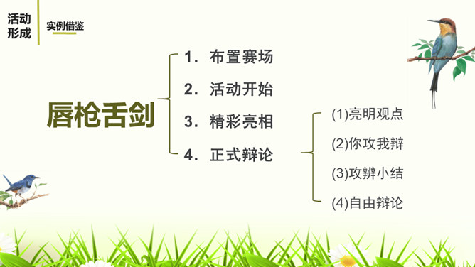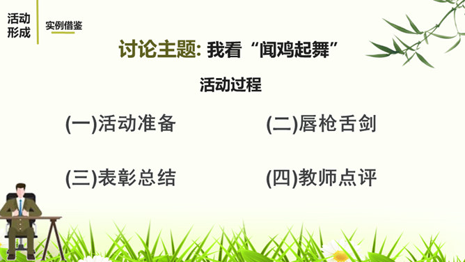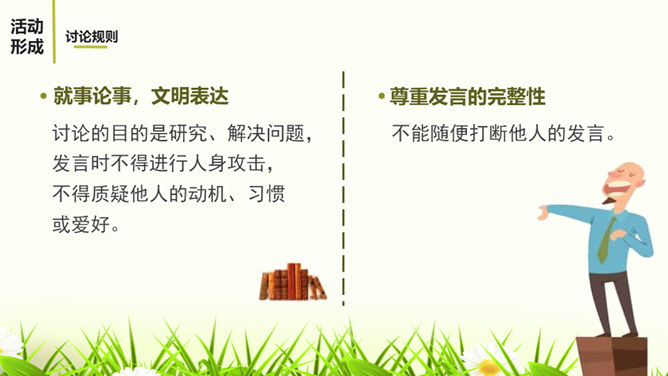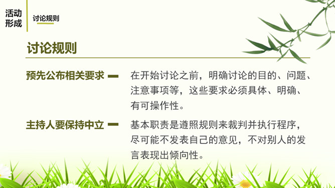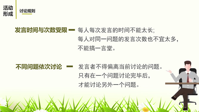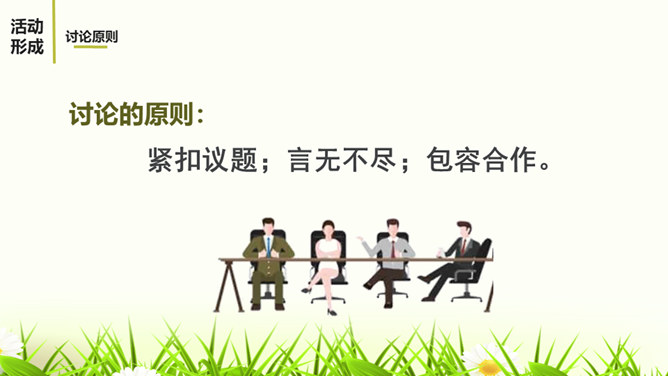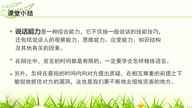1.讨论时要做到紧扣议题、言无不尽、包容合作。2.培养语言表达及其交流、沟通能力,鼓励积极参与讨论。3.通过讨论,学会听话、组织语言、评析他人的对话。说话能力是一种综合能力,它不仅指一般说话的技能技巧,还包括说话人的观察能力、思维能力、应变能力、知识结构及其他有关的因素。在辩论中,发言的时间都是有限的,一定要学会怎样精练语言。另外,怎样在最短的时间内向对方提出质疑,在相互尊重的前提之下敏锐地抓住对方的漏洞,这也是我们要不断地去锻炼完善的地方。所属专题:讨论ppt。