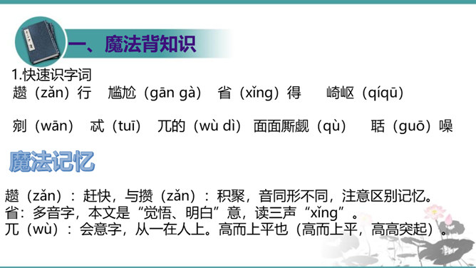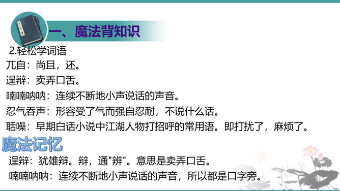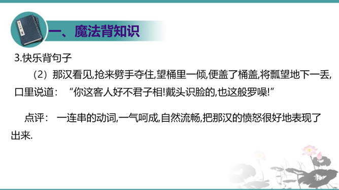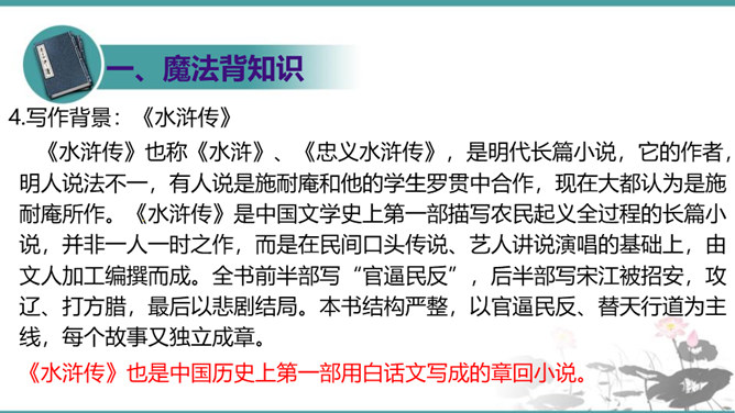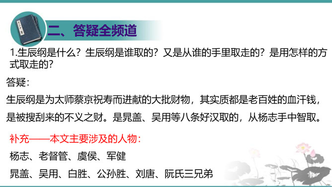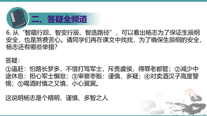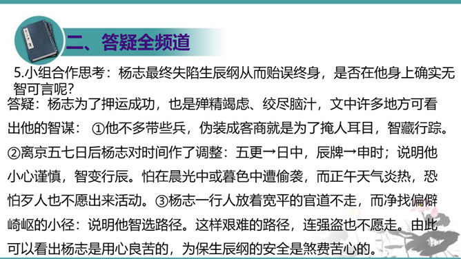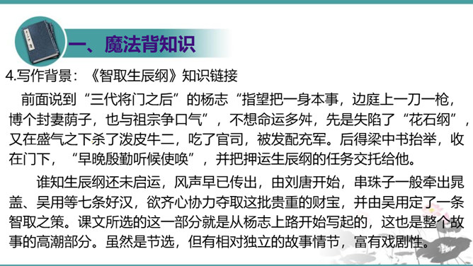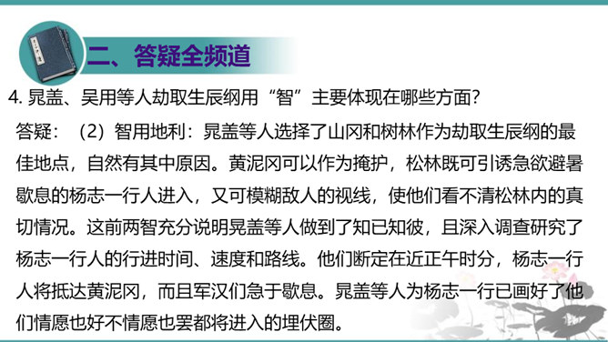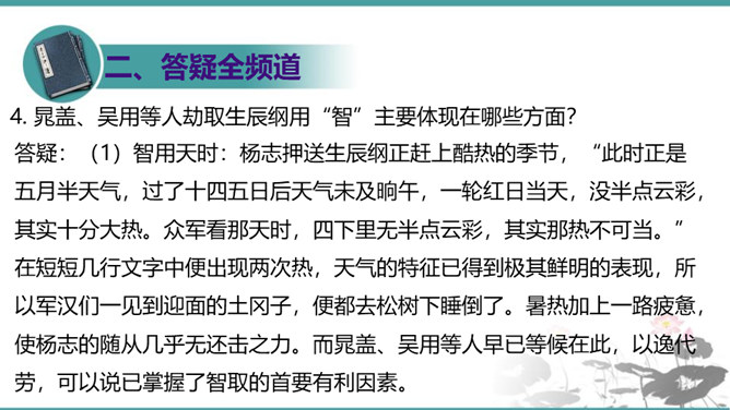 晁盖、吴用等人劫取生辰纲用“智”主要体现在哪些方面?答疑:(1)智用天时:杨志押送生辰纲正赶上酷热的季节,“此时正是五月半天气,过了十四五日后天气未及晌午,一轮红日当天,没半点云彩,其实十分大热。众军看那天时,四下里无半点云彩,其实那热不可当。”在短短几行文字中便出现两次热,天气的特征已得到极其鲜明的表现,所以军汉们一见到迎面的土冈子,便都去松树下睡倒了。暑热加上一路疲惫,使杨志的随从几乎无还击之力。而晁盖、吴用等人早已等候在此,以逸代劳,可以说已掌握了智取的首要有利因素。所属专题:智取生辰纲ppt。