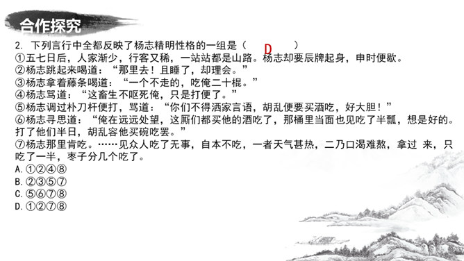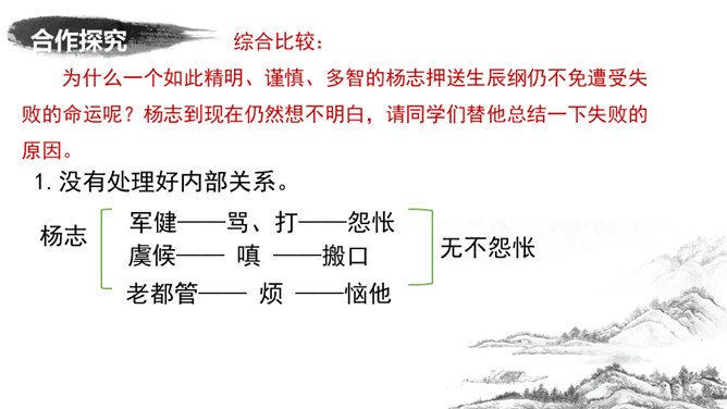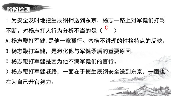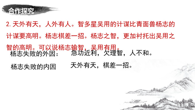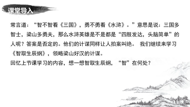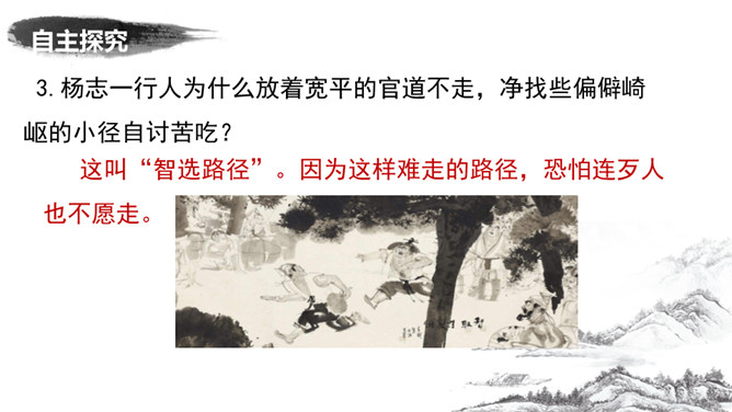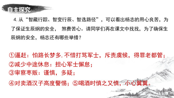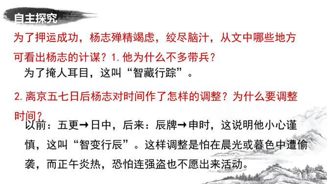 为了押运成功,杨志殚精竭虑,绞尽脑汁,从文中哪些地方可看出杨志的计谋?1.他为什么不多带兵?为了掩人耳目,这叫“智藏行踪”。2.离京五七日后杨志对时间作了怎样的调整?为什么要调整时间?这说明他小心谨慎,这叫“智变行辰”。这样调整是怕在晨光或暮色中遭偷袭,而正午炎热,恐怕连强盗也不愿出来活动。杨志一行人为什么放着宽平的官道不走,净找些偏僻崎岖的小径自讨苦吃?这叫“智选路径”。因为这样难走的路径,恐怕连歹人也不愿走。从“智藏行踪、智变行辰、智选路径”,可以看出杨志的用心良苦,为了保证生辰纲的安全, 煞费苦心。所属专题:智取生辰纲ppt。
