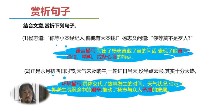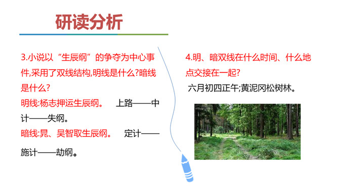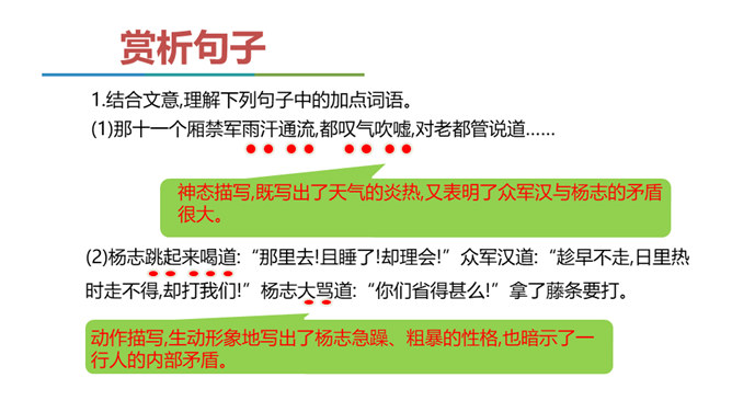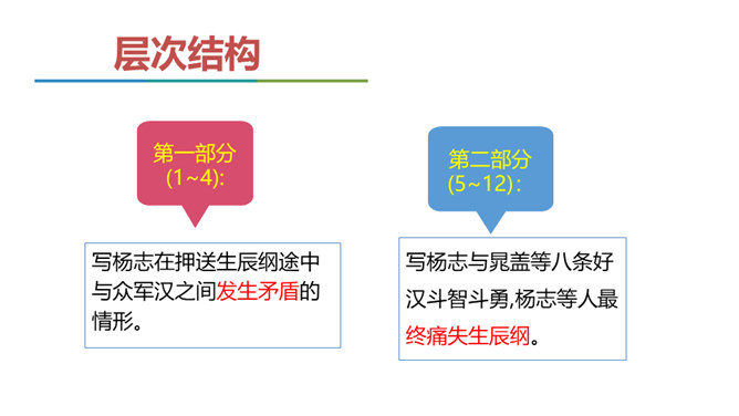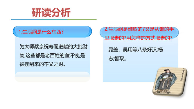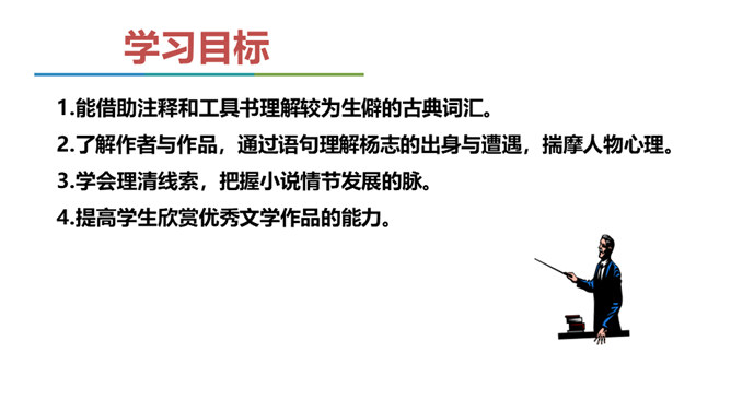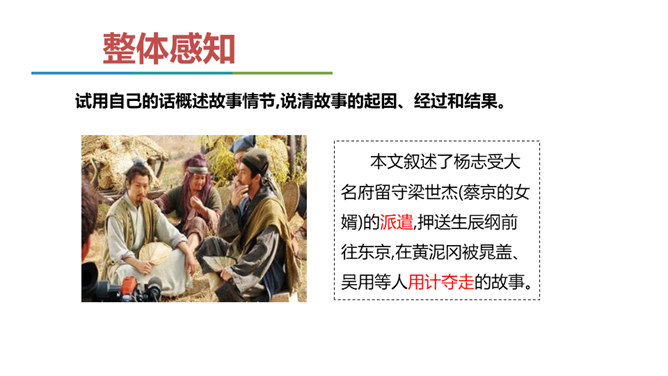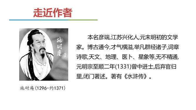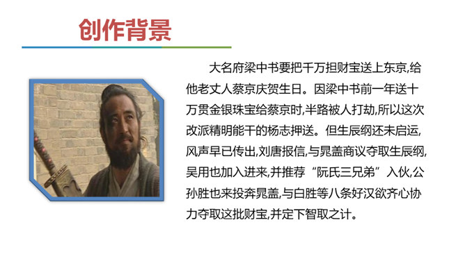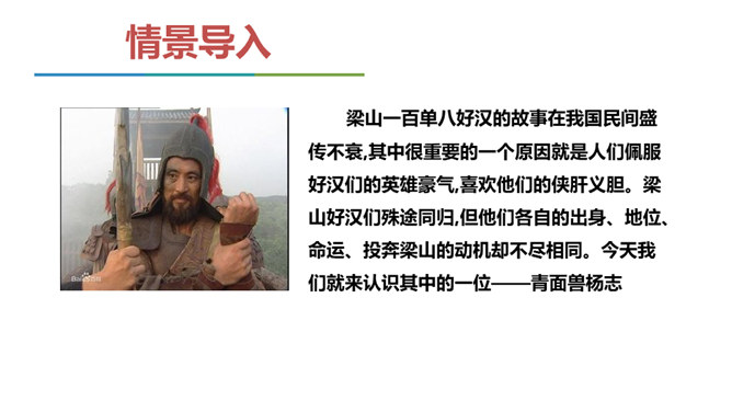 梁山一百单八好汉的故事在我国民间盛传不衰,其中很重要的一个原因就是人们佩服好汉们的英雄豪气,喜欢他们的侠肝义胆。梁山好汉们殊途同归,但他们各自的出身、地位、命运、投奔梁山的动机却不尽相同。今天我们就来认识其中的一位——青面兽杨志。1.能借助注释和工具书理解较为生僻的古典词汇。 2.了解作者与作品,通过语句理解杨志的出身与遭遇,揣摩人物心理。3.学会理清线索,把握小说情节发展的脉。 4.提高学生欣赏优秀文学作品的能力。小说以“生辰纲”的争夺为中心事件,采用了双线结构,明线是什么?暗线是什么?所属专题:智取生辰纲ppt。