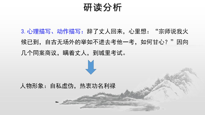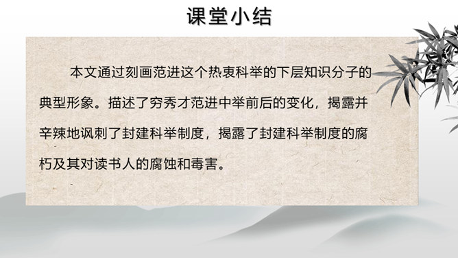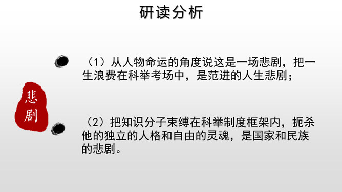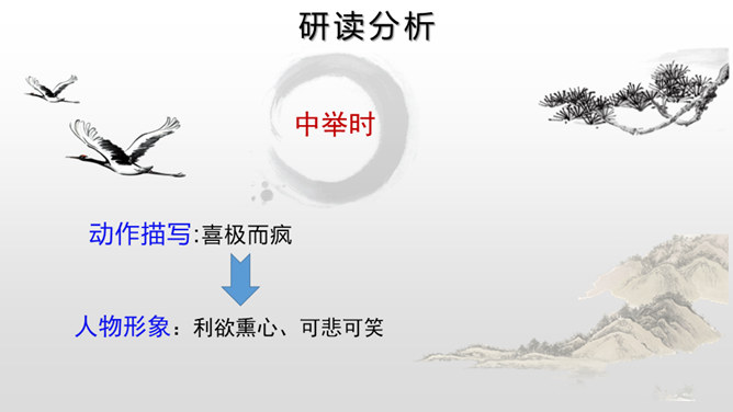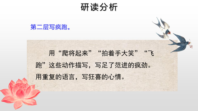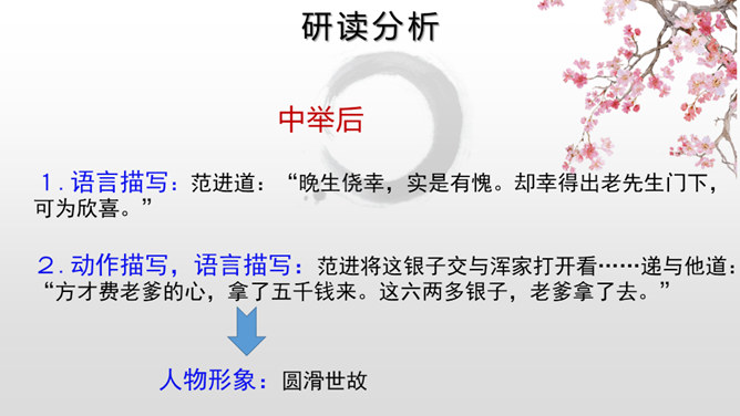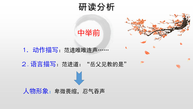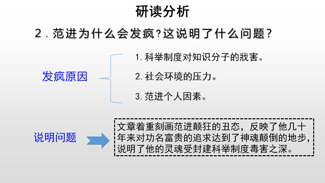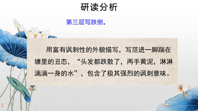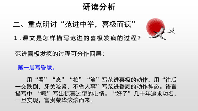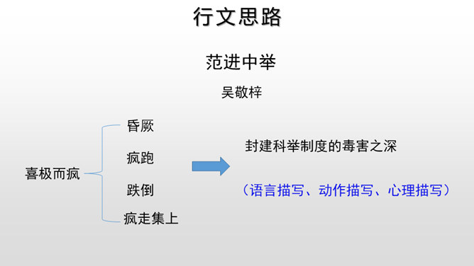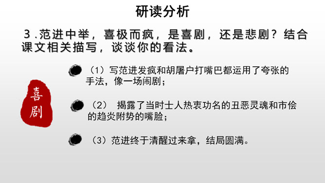 速读课文,画出描写范进的有关内容,说一说中举前后,范进本人有哪些变化?作者运用那些方法来刻画范进这个人物?说说范进是一个怎样的人?用“看”“念”“拍”“笑”写范进喜极的动作,用“往后 一交跌倒,牙关咬紧,不省人事”写范进昏厥的动作神态。语言描写中 “噫”写出惊喜过望的心情。“好了”几十年追求功名,一旦实现,富贵荣华滚滚而来。用“爬将起来”“拍着手大笑”“飞跑”这些动作描写,写足了范进的疯劲。用重复的语言,写狂喜的心情。用富有讽刺性的外貌描写,写范进一脚踹在塘里的丑态,包含了极其强烈的讽刺意味。所属专题:范进中举ppt。