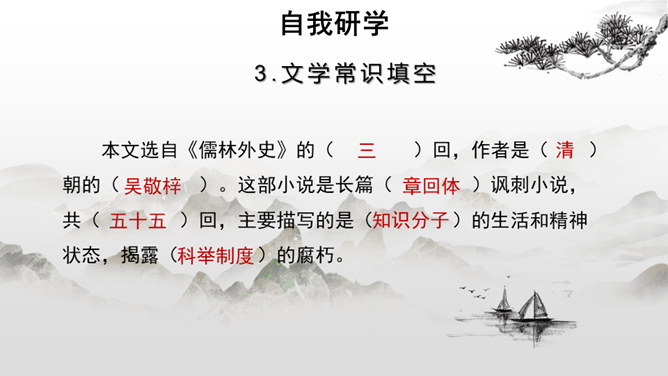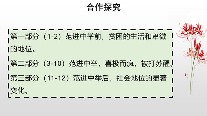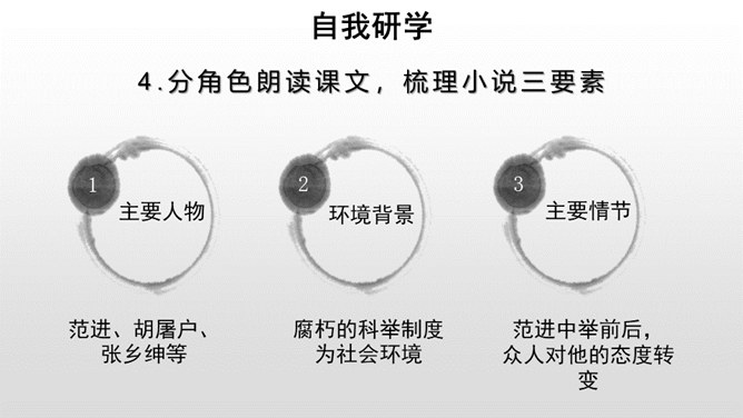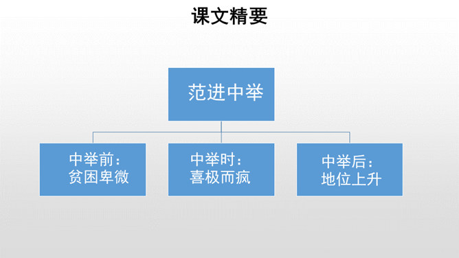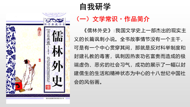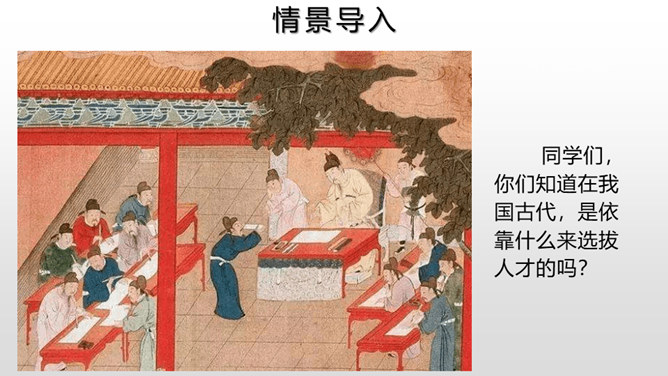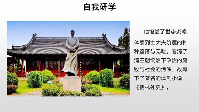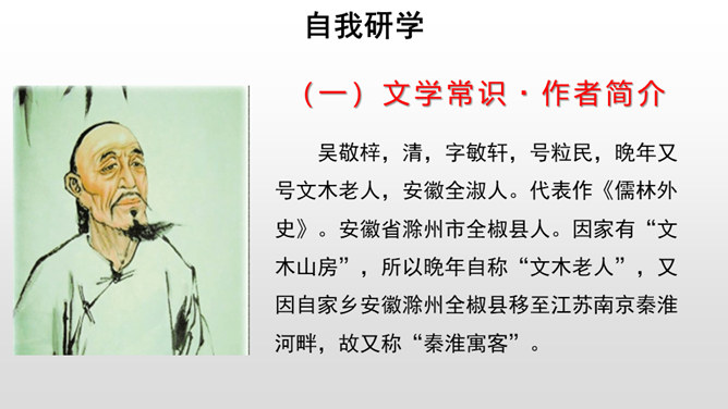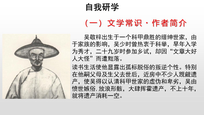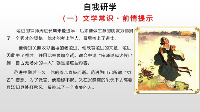 每年的6月7、8号两天,对全国的高中生来说,那是鲤鱼跳龙门的时刻,而对于我们国家来说,那也是选拔人才、选拔栋梁的时刻。同学们,你们知道在我国古代,是依靠什么来选拔人才的吗?吴敬梓出生于一个科甲鼎胜的缙绅世家,由于家族的影响,吴少时曾热衷于科举,早年入学为秀才,二十九岁时参加乡试,却因“文章大好人大怪”而遭黜落。读书生活使他显露出孤标脱俗的叛逆个性。特别在他嗣父母及生父去世后,近房中不少人觊觎遗产,使吴得以认清科甲世家的虚伪和卑劣,吴由愤世嫉俗,放浪形骸,大肆挥霍遗产,不上十年,就将遗产消耗一空。所属专题:范进中举ppt。