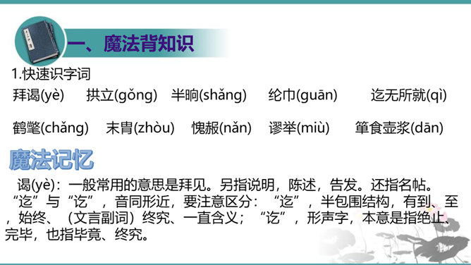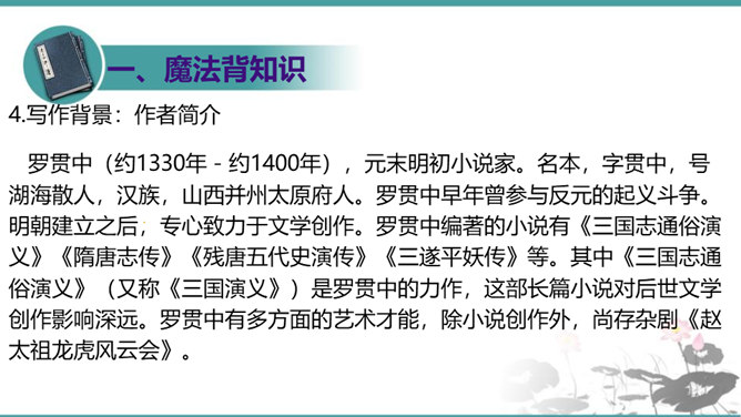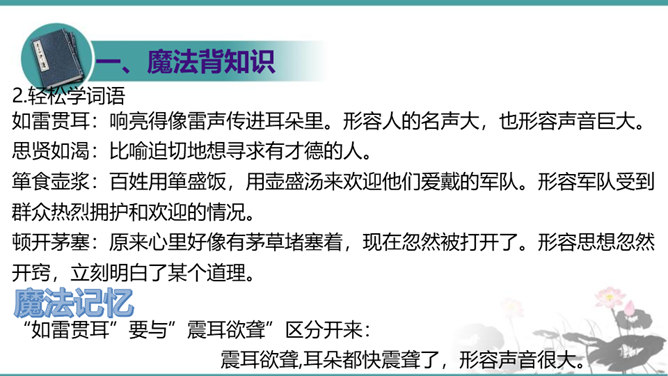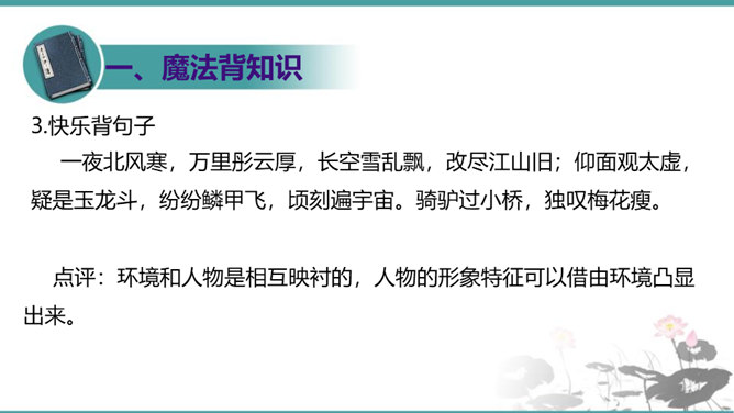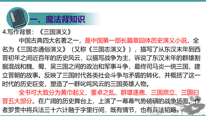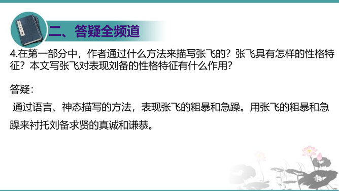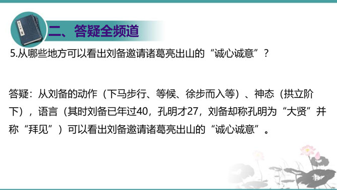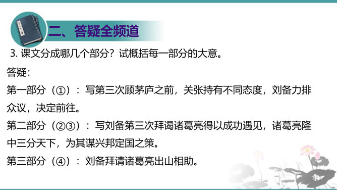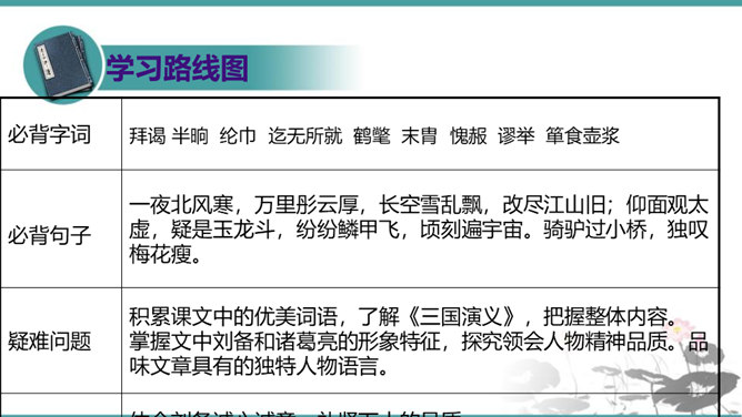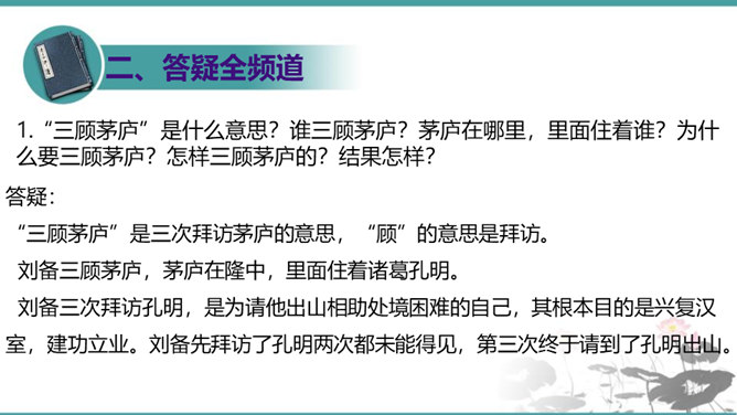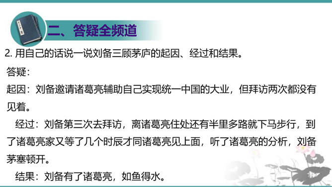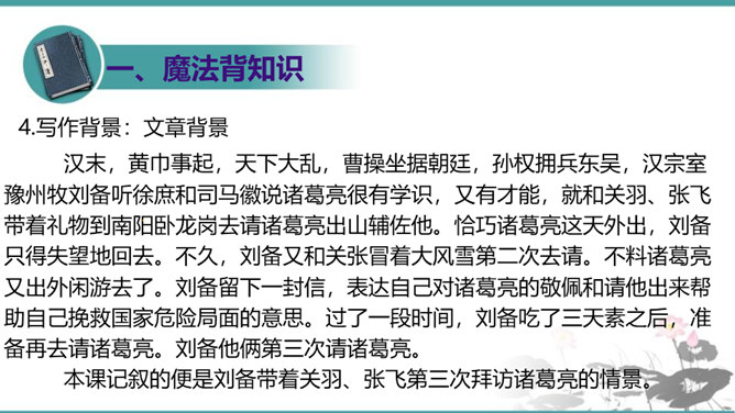 汉末,黄巾事起,天下大乱,曹操坐据朝廷,孙权拥兵东吴,汉宗室豫州牧刘备听徐庶和司马徽说诸葛亮很有学识,又有才能,就和关羽、张飞带着礼物到南阳卧龙岗去请诸葛亮出山辅佐他。恰巧诸葛亮这天外出,刘备只得失望地回去。不久,刘备又和关张冒着大风雪第二次去请。不料诸葛亮又出外闲游去了。刘备留下一封信,表达自己对诸葛亮的敬佩和请他出来帮助自己挽救国家危险局面的意思。过了一段时间,刘备吃了三天素之后,准备再去请诸葛亮。刘备他俩第三次请诸葛亮。本课记叙的便是刘备带着关羽、张飞第三次拜访诸葛亮的情景。所属专题:三顾茅庐ppt。