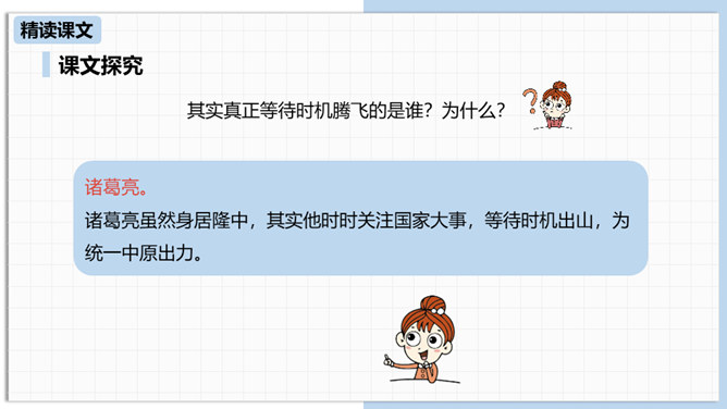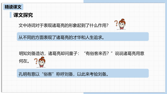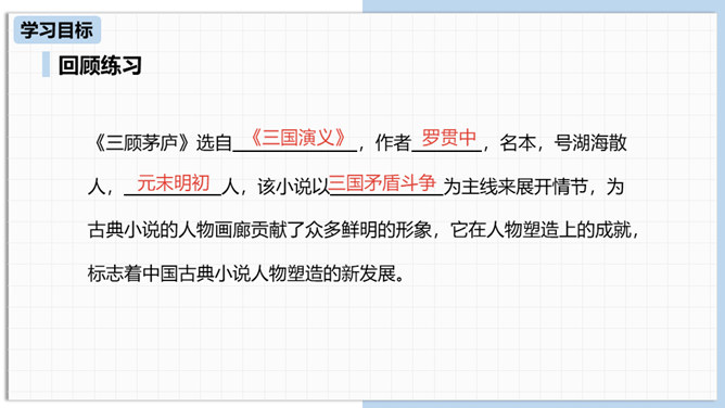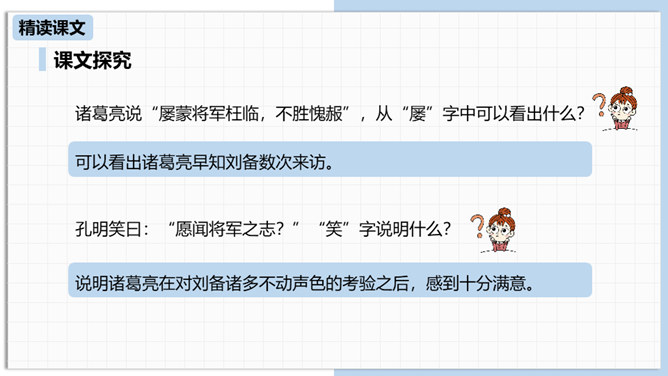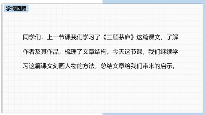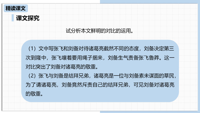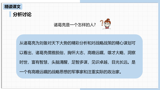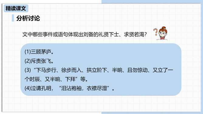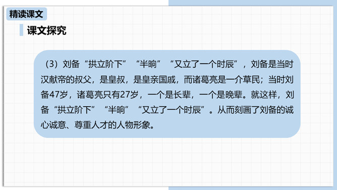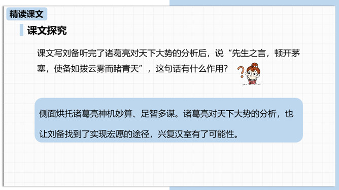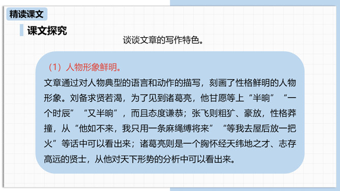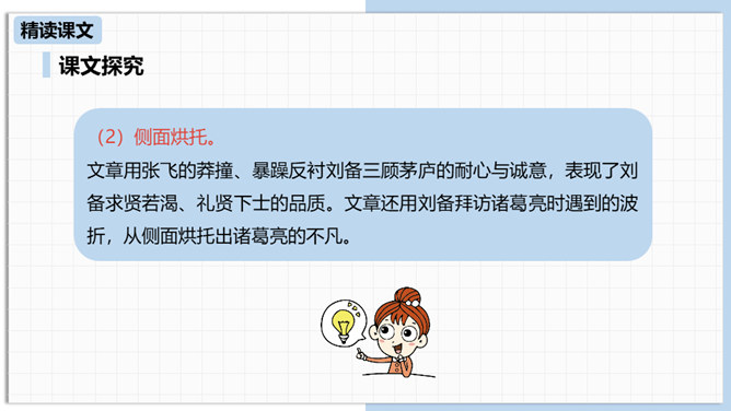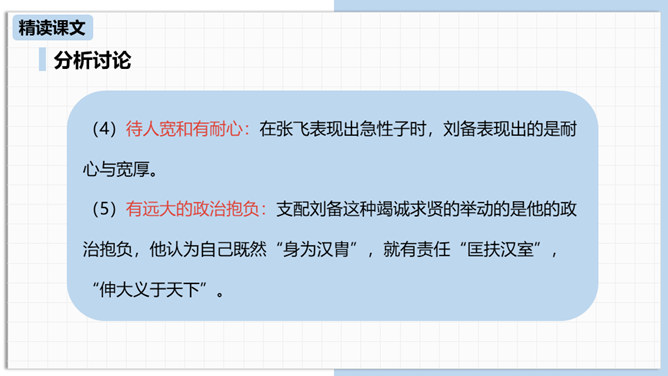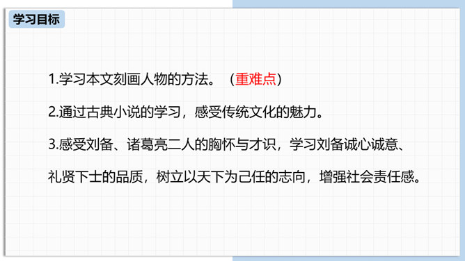 1.学习本文刻画人物的方法。(重难点)2.通过古典小说的学习,感受传统文化的魅力。3.感受刘备、诸葛亮二人的胸怀与才识,学习刘备诚心诚意、礼贤下士的品质,树立以天下为己任的志向,增强社会责任感。请结合课文分析刘备有怎样的性格特征?仁心爱人:刘备求贤若渴,非是为了一己之私,在诸葛亮未应出山时,刘备泣曰“先生不出,如苍生何”,是为苍生计,以此可见其仁人之心。诚心求贤:刘备为见得诸葛亮,不顾贵胄身份,“凡三往”,可见其求贤之诚。虚心求教:刘备自知谋略不足,因此请见诸葛亮,言“开备愚鲁而赐教”,可见其请教虚心。所属专题:三顾茅庐ppt。