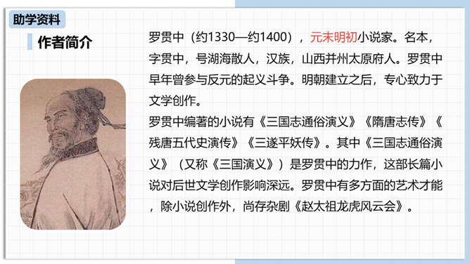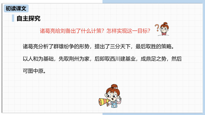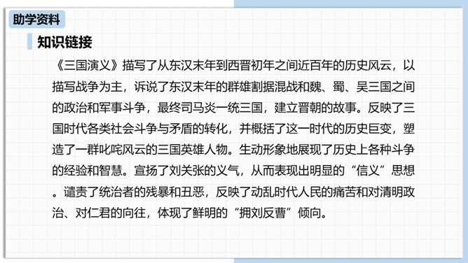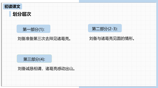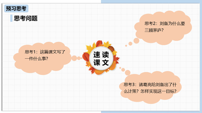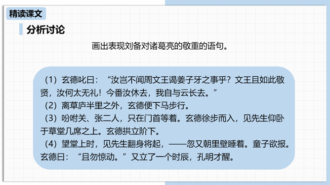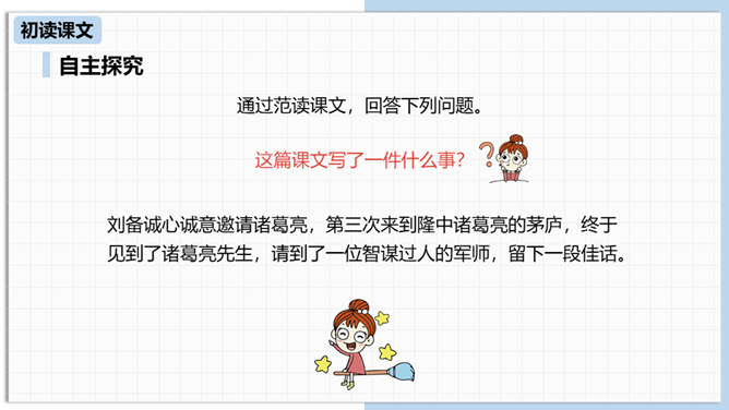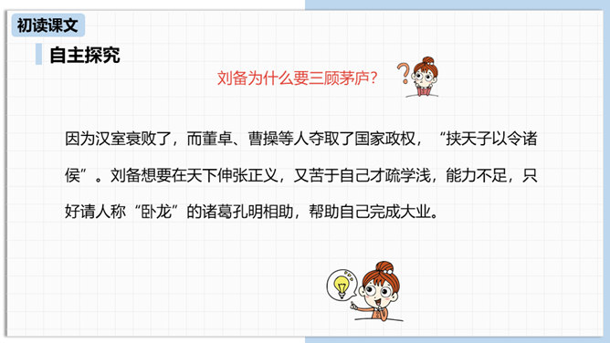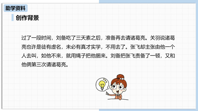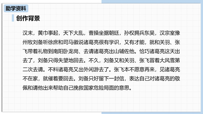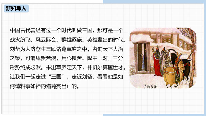 中国古代曾经有过一个时代叫做三国,那可是一个战火纷飞、风云际会、群雄逐鹿、英雄辈出的时代。刘备为大济苍生三顾诸葛草庐之中,咨询天下大治之策,可谓思贤若渴,用心良苦。隆中一对,三分形势终成必然。未出草庐定天下,神机妙算匡世才。让我们一起走进“三国”,走近刘备,看看他是如何请料事如神的诸葛亮出山的。刘备为什么要三顾茅庐?因为汉室衰败了,而董卓、曹操等人夺取了国家政权,“挟天子以令诸侯”。刘备想要在天下伸张正义,又苦于自己才疏学浅,能力不足,只好请人称“卧龙”的诸葛孔明相助,帮助自己完成大业。所属专题:三顾茅庐ppt。