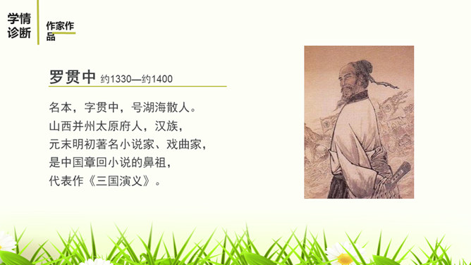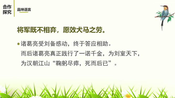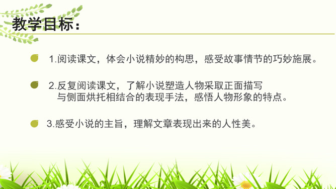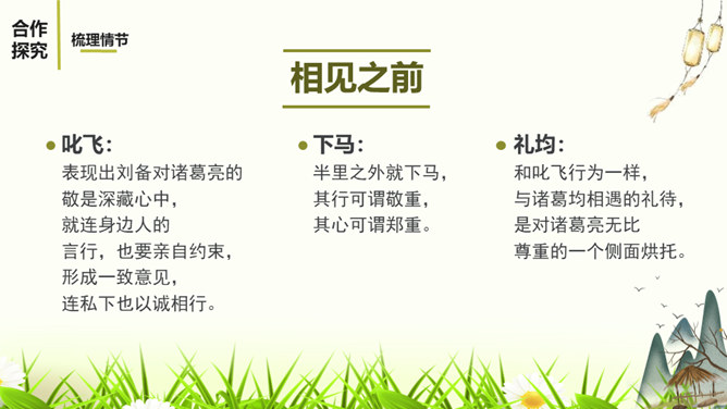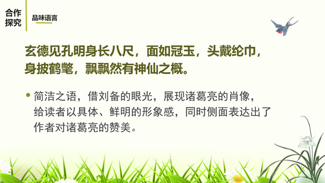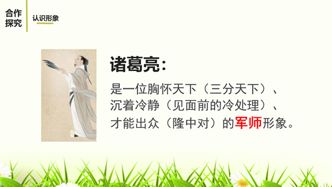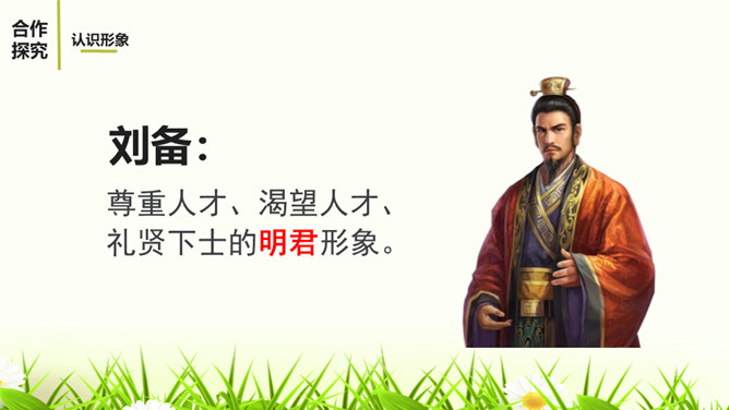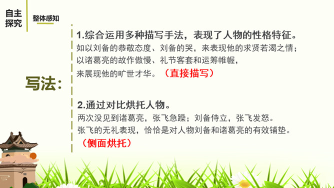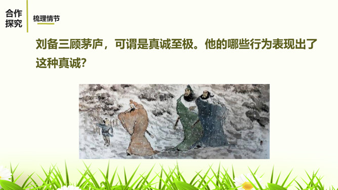 1.阅读课文,体会小说精妙的构思,感受故事情节的巧妙施展。2.反复阅读课文,了解小说塑造人物采取正面描写与侧面烘托相结合的表现手法,感悟人物形象的特点。3.感受小说的主旨,理解文章表现出来的人性美。课文记叙了刘备第三次前去隆中草庐拜谒诸葛亮,终于第一次见到了诸葛亮本人,在他精诚所至、礼贤下士的感召下,诸葛亮答应出山相助,辅佐他完成统一国家大业。课文用张飞的莽撞、无礼,反衬刘备求贤若渴的态度。综合运用多种描写手法,表现了人物的性格特征。如以刘备的恭敬态度、刘备的哭,来表现他的求贤若渴之情。所属专题:三顾茅庐ppt。