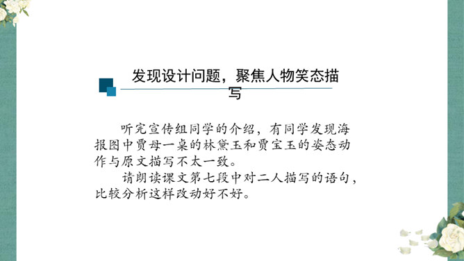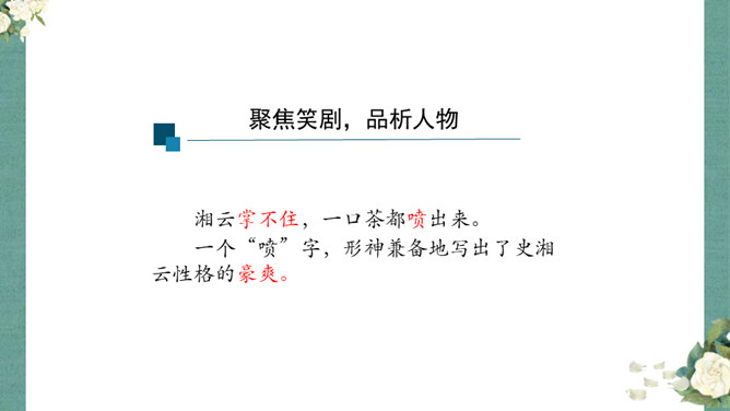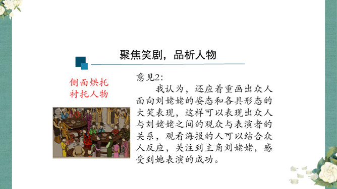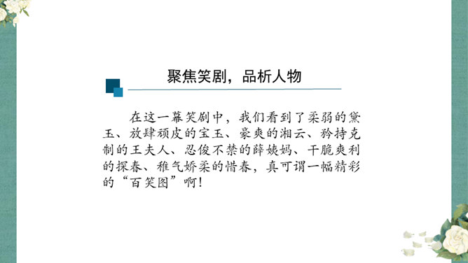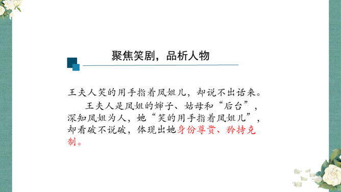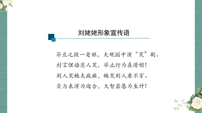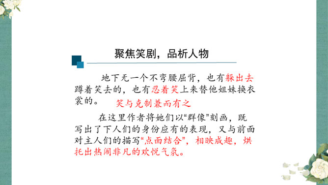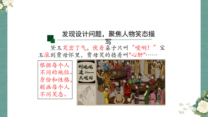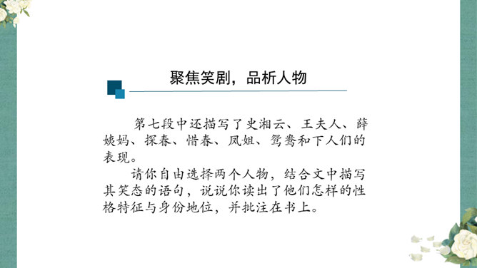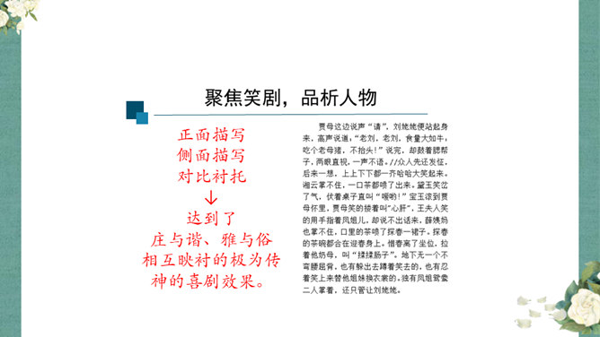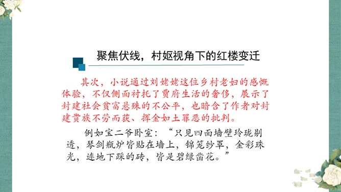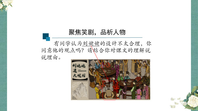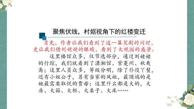 首先,作者让我们看到了这一幕笑剧的同时,更让我们借刘姥姥的眼睛,看到了大观园的盛景。这里楼馆众多,仅节选部分,通过刘姥姥的行踪,我们就看到了潇湘馆、紫菱州、秋爽斋;这里人员众多,等级分明,除了仆役丫鬟,还有小姐公子,另有当家的凤姐,最顶端的是她最需要取悦的贾母;这里什么都是大的,大房、大箱、大柜、大桌子、大床……其次,小说通过刘姥姥这位乡村老妇的感慨体验,不仅侧面衬托了贾府生活的奢侈,展示了封建社会贫富悬殊的不公平,也暗含了作者对封建贵族不劳而获、挥金如土罪恶的批判。所属专题:刘姥姥进大观园ppt。