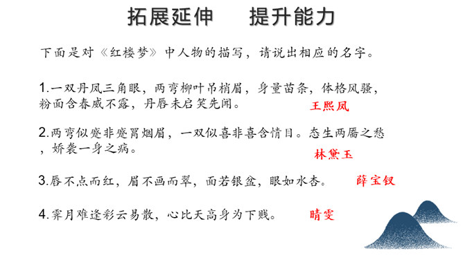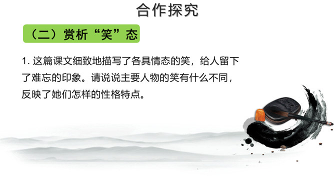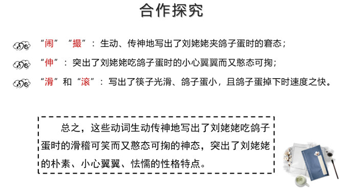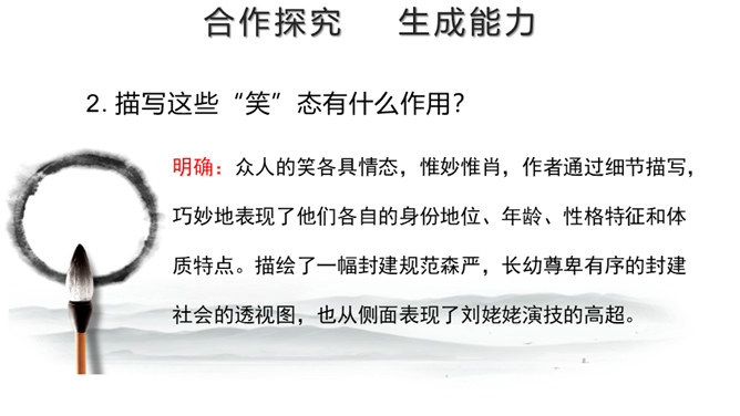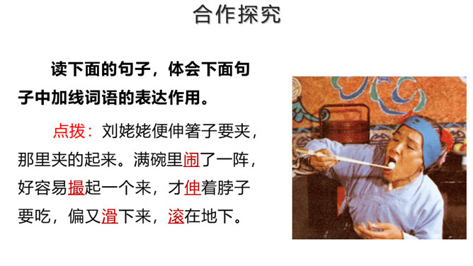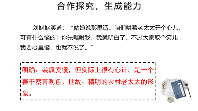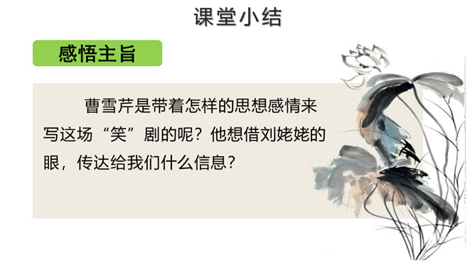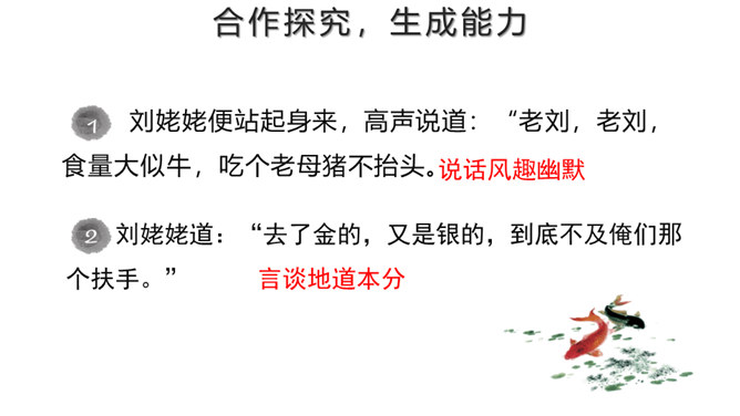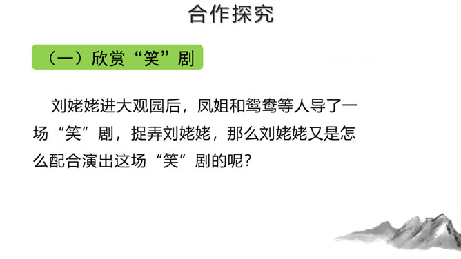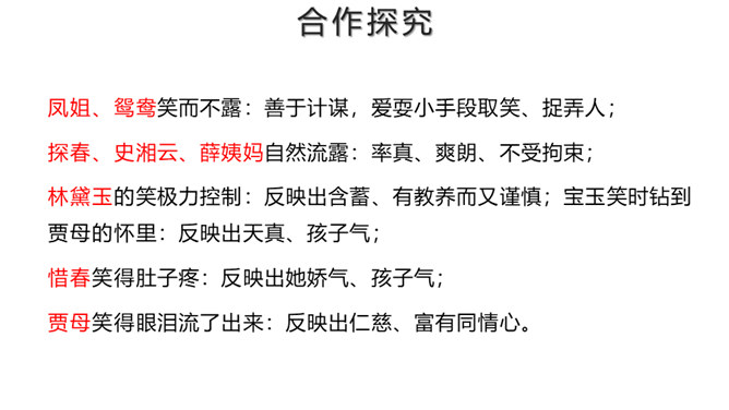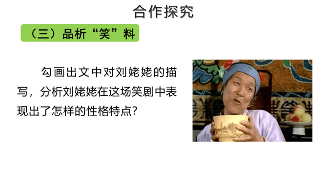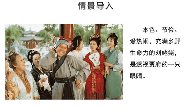 本色、节俭、爱热闹、充满乡野生命力的刘姥姥,是透视贾府的一只眼睛。刘姥姥进大观园后,凤姐和鸳鸯等人导了一场“笑”剧,捉弄刘姥姥,那么刘姥姥又是怎么配合演出这场“笑”剧的呢?总之,这些动词生动传神地写出了刘姥姥吃鸽子蛋时的滑稽可笑而又憨态可掬的神态,突出了刘姥姥的朴素、小心翼翼、怯懦的性格特点。这篇课文细致地描写了各具情态的笑,给人留下了难忘的印象。请说说主要人物的笑有什么不同,反映了她们怎样的性格特点。描写这些“笑”态有什么作用?所属专题:刘姥姥进大观园ppt。