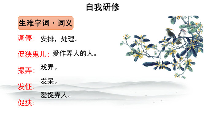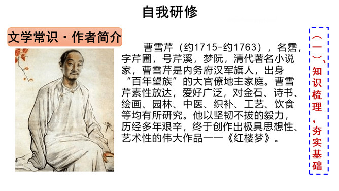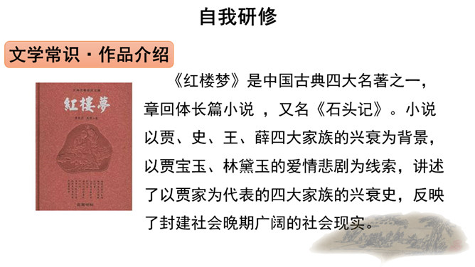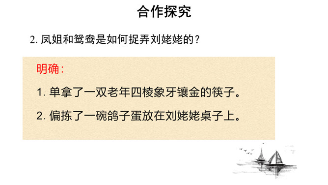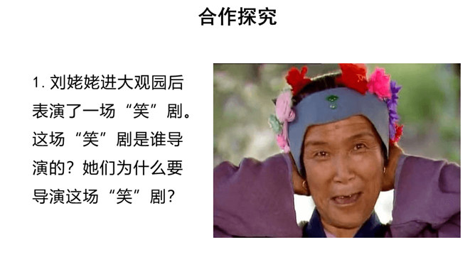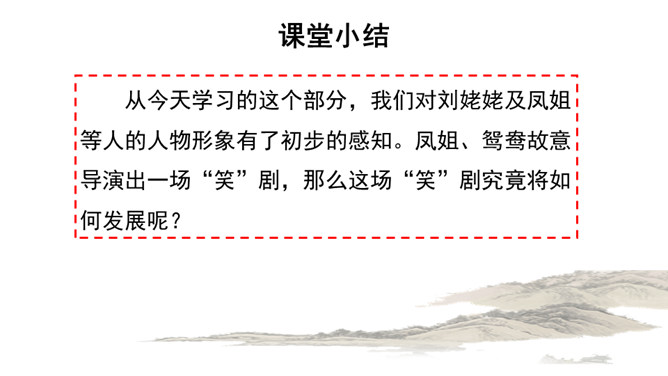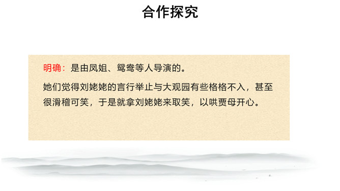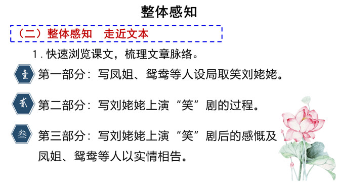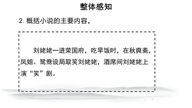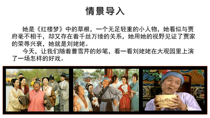 快速浏览课文,梳理文章脉络。第一部分:写凤姐、鸳鸯等人设局取笑刘姥姥。第二部分:写刘姥姥上演“笑”剧的过程。第三部分:写刘姥姥上演“笑”剧后的感慨及凤姐、鸳鸯等人以实情相告。概括小说的主要内容。刘姥姥一进荣国府,吃早饭时,在秋爽斋,凤姐、鸳鸯设局取笑刘姥姥,酒席间刘姥姥上演“笑”剧。刘姥姥进大观园后表演了一场“笑”剧。这场“笑”剧是谁导演的?她们为什么要导演这场“笑”剧?她们觉得刘姥姥的言行举止与大观园有些格格不入,甚至很滑稽可笑,于是就拿刘姥姥来取笑,以哄贾母开心。所属专题:刘姥姥进大观园ppt。