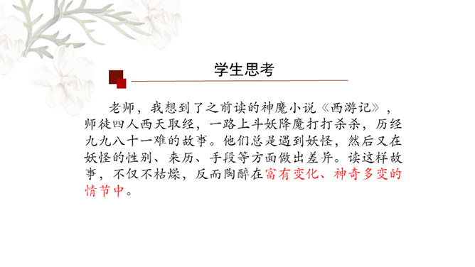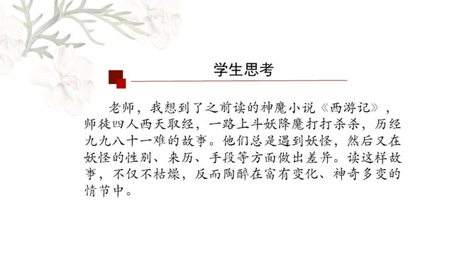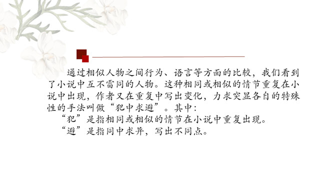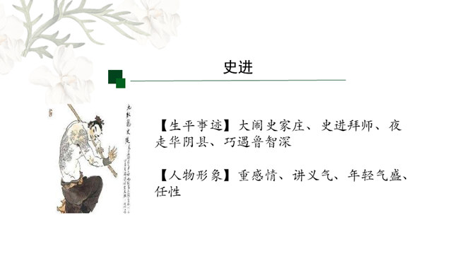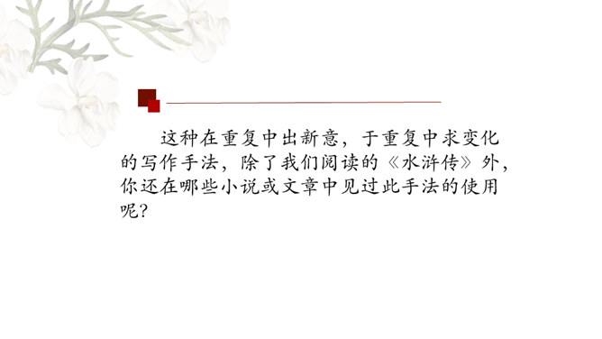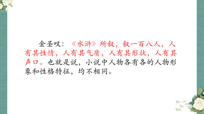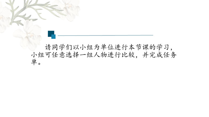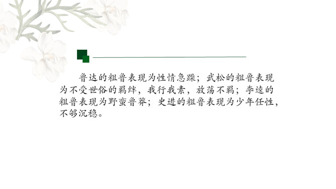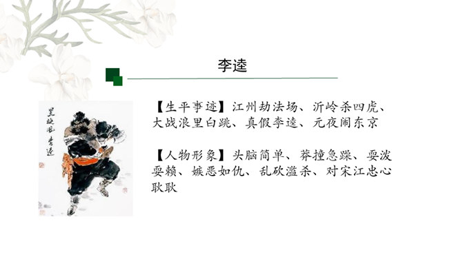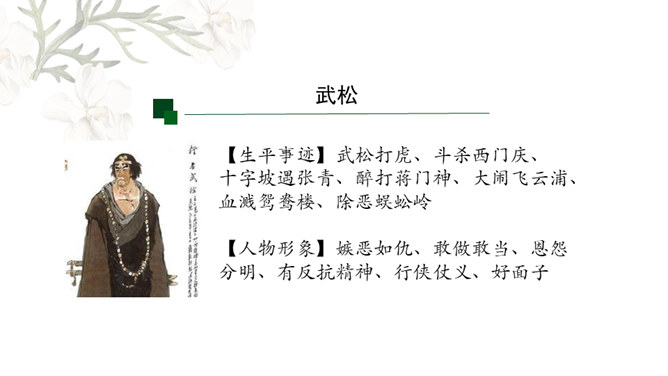 金圣叹:《水浒》所叙,叙一百八人,人有其性情,人有其气质,人有其形状,人有其声口。也就是说,小说中人物各有各的人物形象和性格特征,均不相同。通过小说相似人物间行为、语言等方面的比较,分析他们的个性特征,进而探究小说塑造人物的艺术手法。1.比较“武松打虎”和“李逵打虎”的情节,填写表格。2.比较菊花会上,鲁智深、武松、李逵三人的反对招安的言语行为,填写表格。3.比较小说粗鲁之人的粗鲁表现,填写表格。请同学们以小组为单位进行本节课的学习,小组可任意选择一组人物进行比较,并完成任务单。所属专题:水浒传ppt。