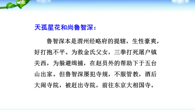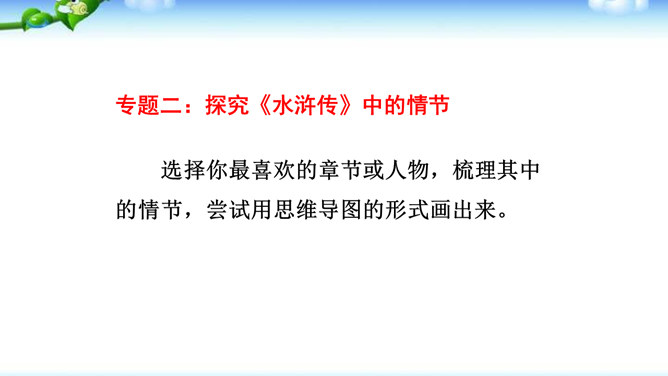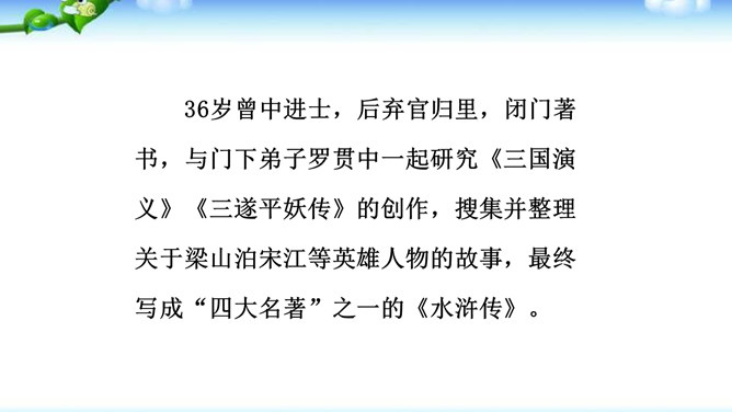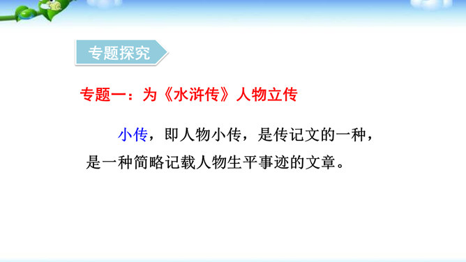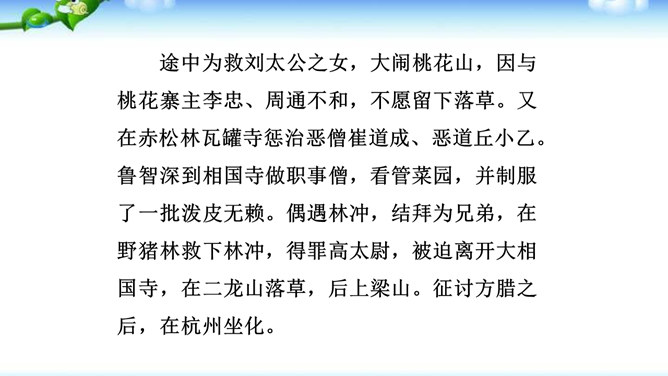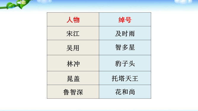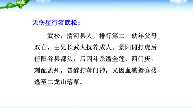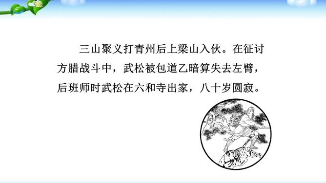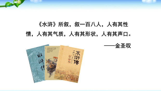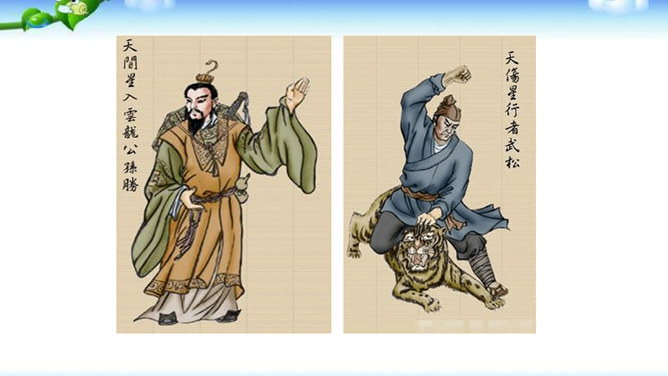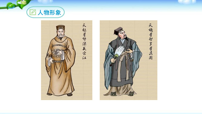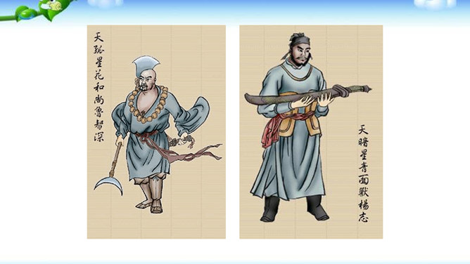 一些出身下层的英雄人物,如李逵、三阮、武松、石秀等,对统治阶级的剥削压迫感受最深,因此当他们一旦造反后,他们的反抗性也最强,什么统治阶级的法度条例,对他们毫无约束,像李逵连皇帝也不放在眼里。他们为了起义的正义事业,赴汤蹈火在所不辞,作者对这些英雄人物的赞扬,完全是出自内心的热爱。作品歌颂这样一批被统治阶级视为所谓“杀人放火”的强盗、朝廷的叛逆,一些所谓“不赦”的罪人,把他们写得如此光辉动人,可敬可爱,这显示了作者的胆识和正义感情。与此相反,作者对于统治阶级的人物,则将他们写得丑恶不堪。所属专题:水浒传ppt。