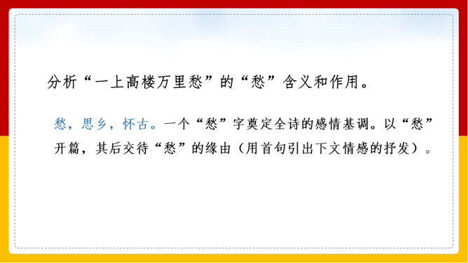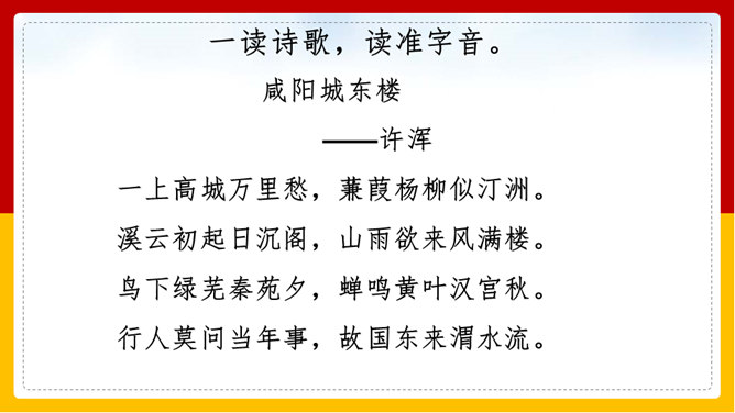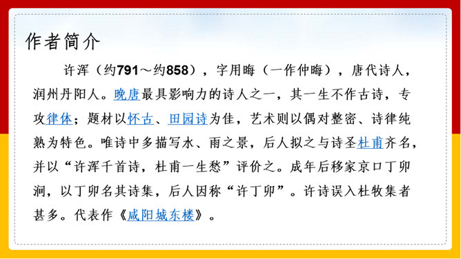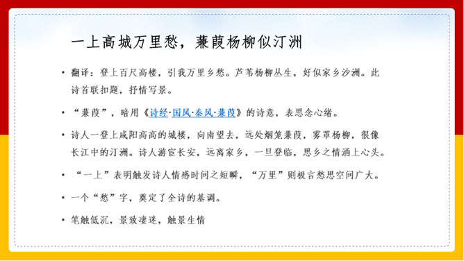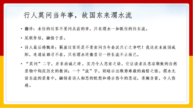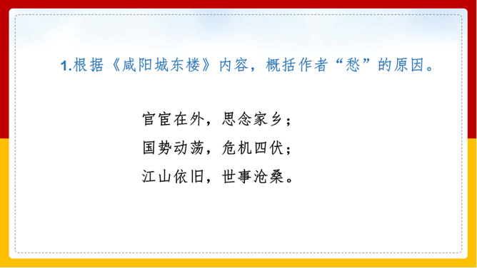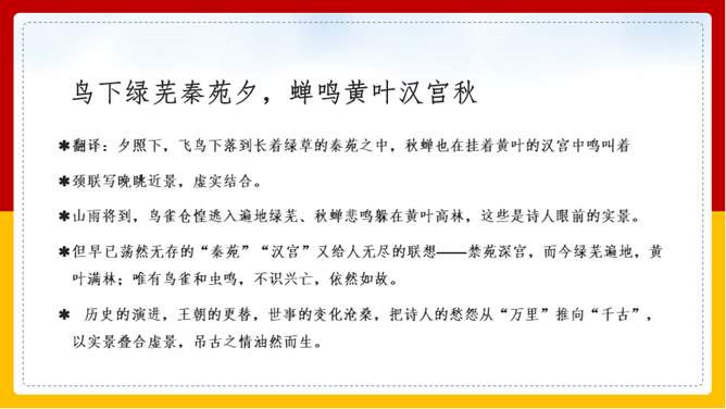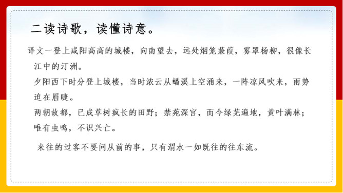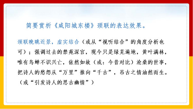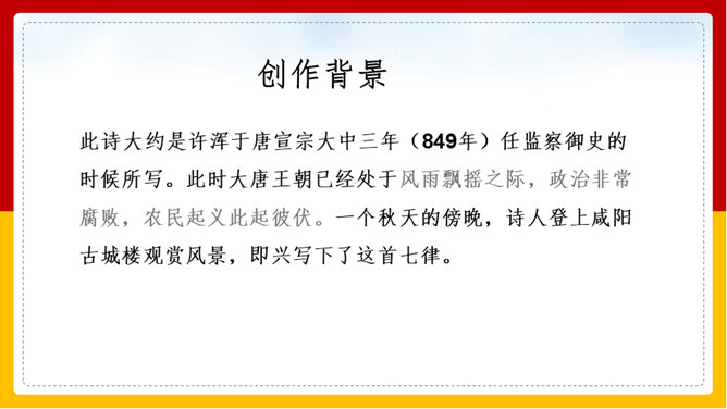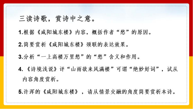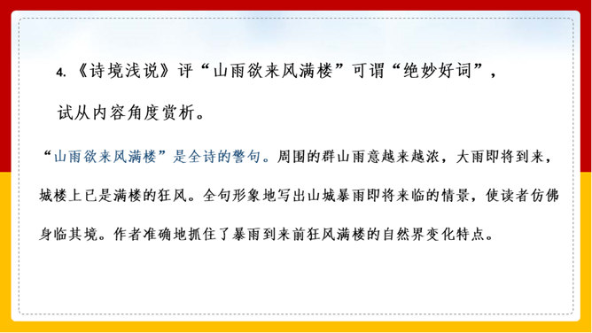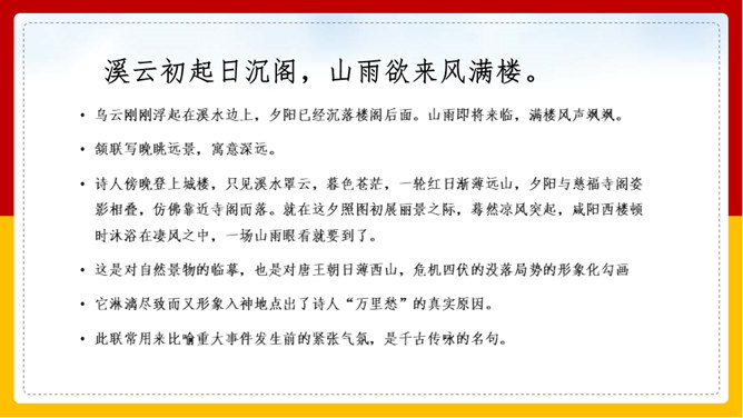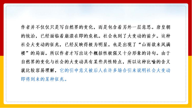 “山雨欲来风满楼”是全诗的警句。周围的群山雨意越来越浓,大雨即将到来,城楼上已是满楼的狂风。全句形象地写出山城暴雨即将来临的情景,使读者仿佛身临其境。作者准确地抓住了暴雨到来前狂风满楼的自然界变化特点。作者并不仅仅只是写自然界的变化,而是包含着另外一层意思。唐皇朝的统治,已经面临着崩溃在即的危机。社会也到了大变动的前夕。这种社会大变动的征兆,已经反映得极为明显。也是出现了“山雨欲来风满楼”的局面。所以作者才写出这个概括性极强又十分形象的诗句。所属专题:咸阳城东楼ppt。