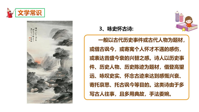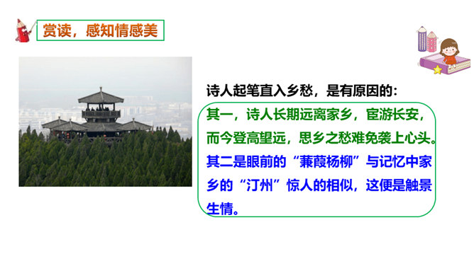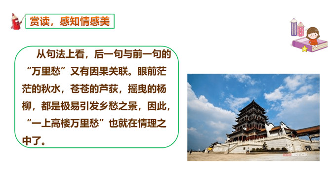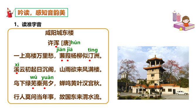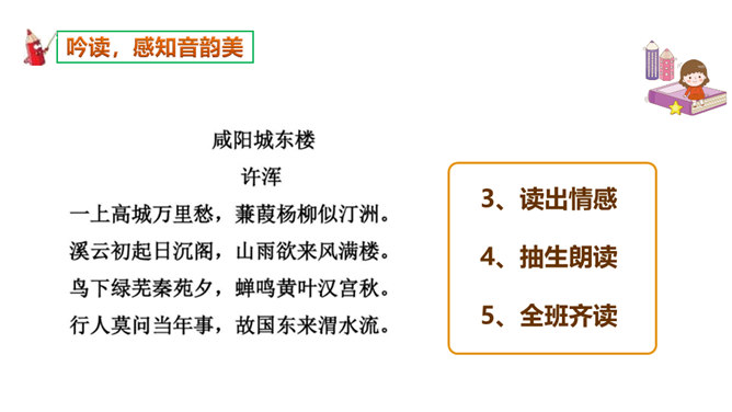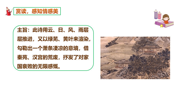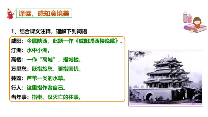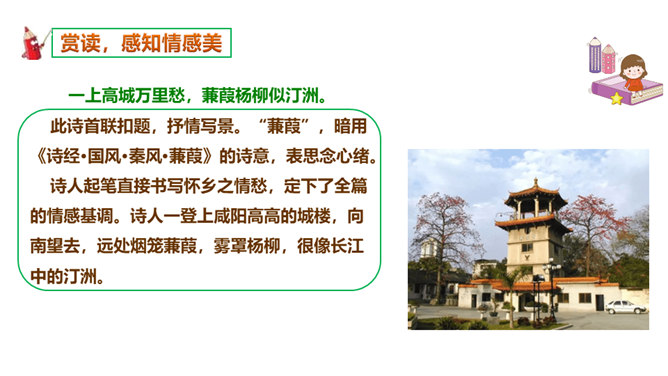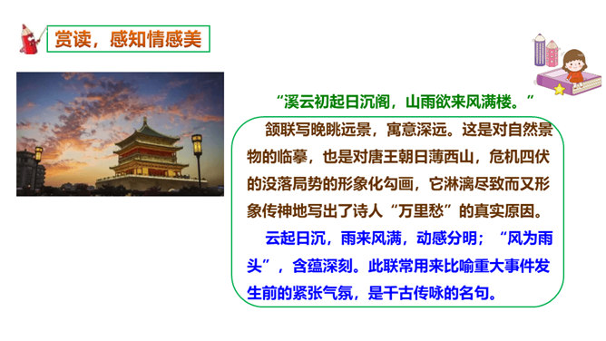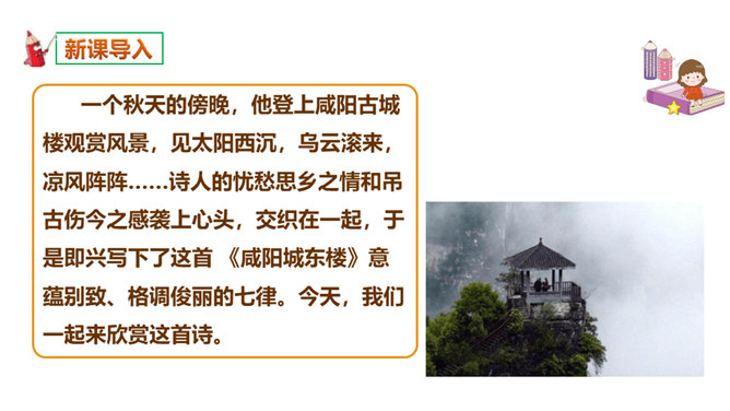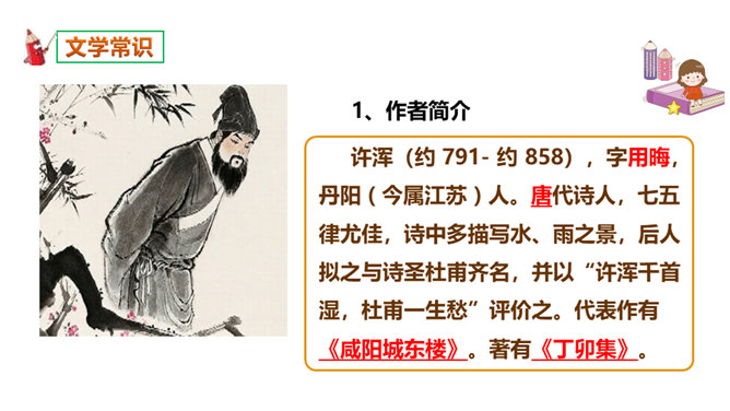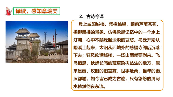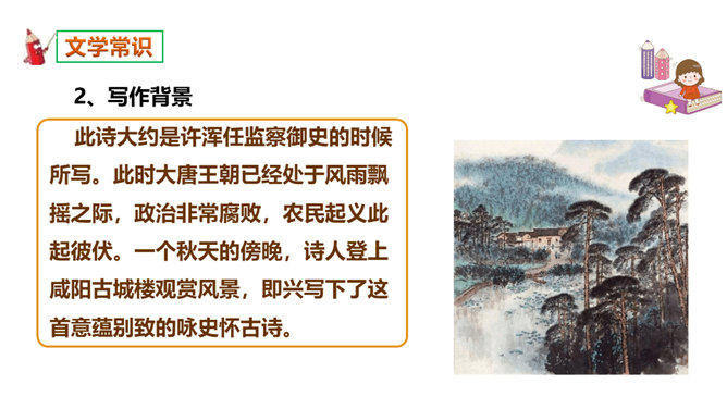 一个秋天的傍晚,他登上咸阳古城楼观赏风景,见太阳西沉,乌云滚来,凉风阵阵……诗人的忧愁思乡之情和吊古伤今之感袭上心头,交织在一起,于是即兴写下了这首意蕴别致、格调俊丽的七律。今天,我们一起来欣赏这首诗。此诗大约是许浑任监察御史的时候所写。此时大唐王朝已经处于风雨飘摇之际,政治非常腐败,农民起义此起彼伏。一个秋天的傍晚,诗人登上咸阳古城楼观赏风景,即兴写下了这首意蕴别致的咏史怀古诗。咏史怀古诗:一般以古代历史事件或古代人物为题材,或借古讽今,或寄寓个人怀才不遇的感伤,或表达昔盛今衰的兴替之感。所属专题:咸阳城东楼ppt。