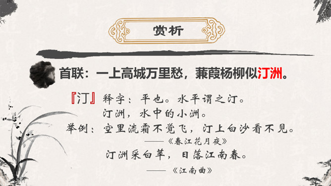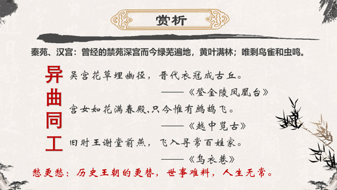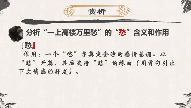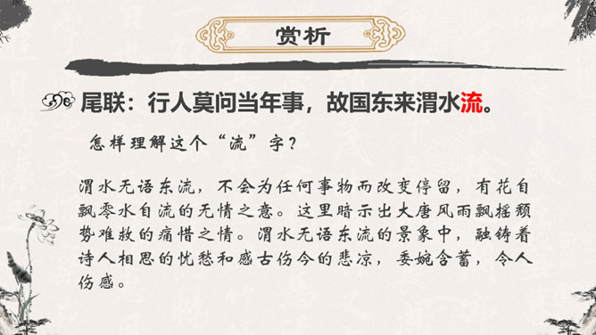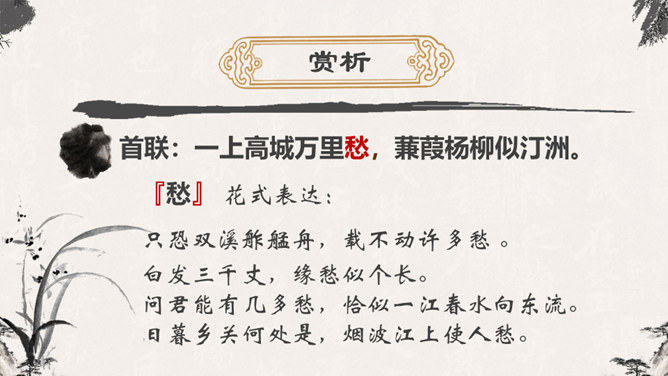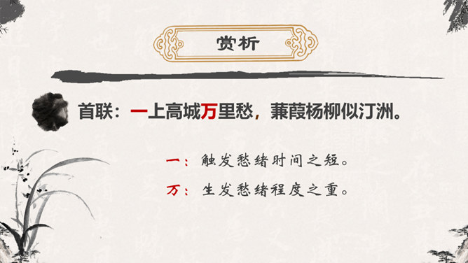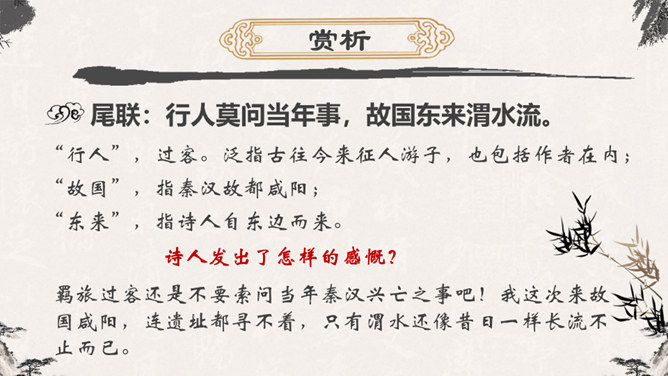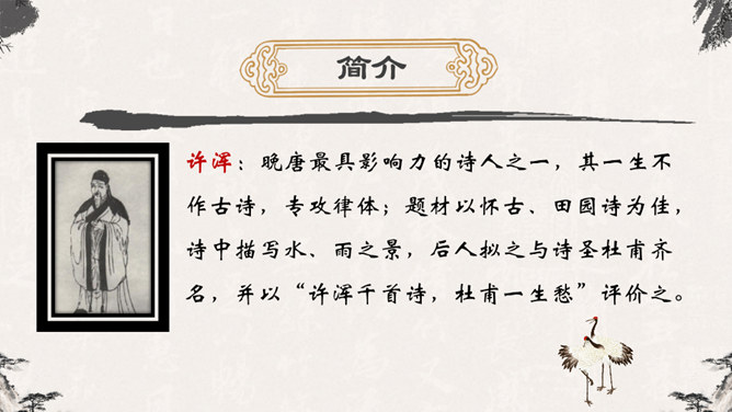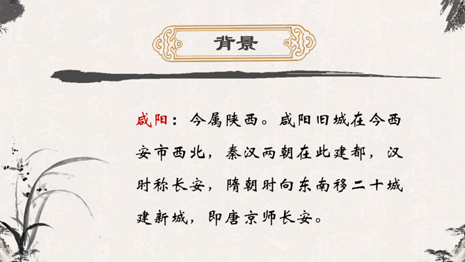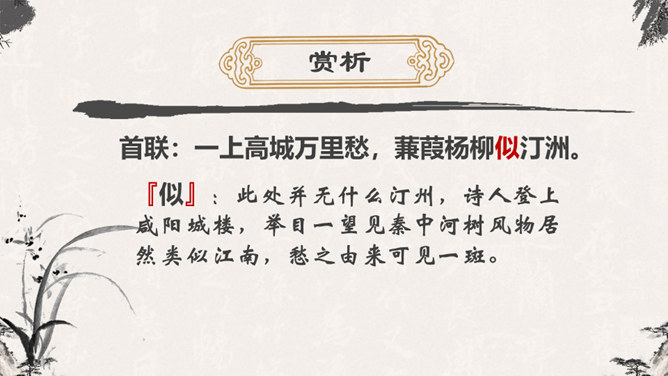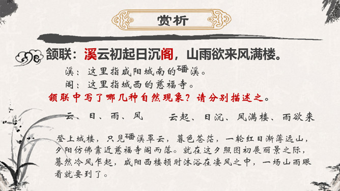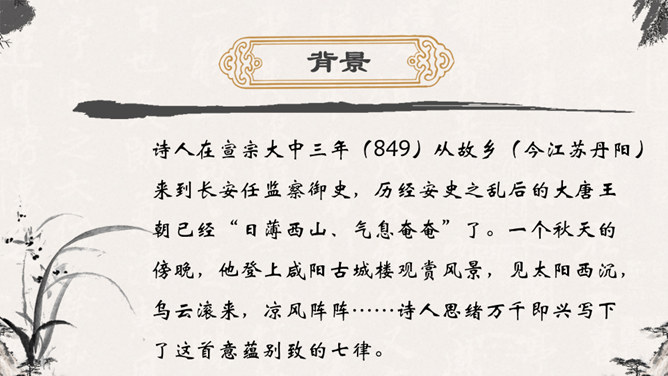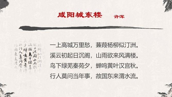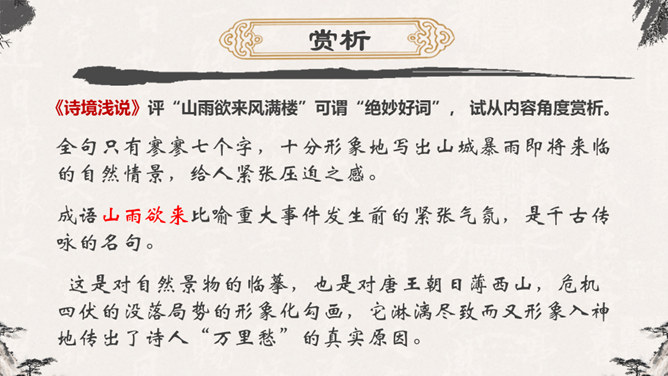 许浑:晚唐最具影响力的诗人之一,其一生不作古诗,专攻律体;题材以怀古、田园诗为佳,诗中描写水、雨之景,后人拟之与诗圣杜甫齐名,并以“许浑千首诗,杜甫一生愁”评价之。登上城楼,只见磻溪罩云,暮色苍茫,一轮红日渐薄远山,夕阳仿佛靠近慈福寺阁而落。就在这夕照图初展丽景之际,蓦然冷风乍起,咸阳西楼顿时沐浴在凄风之中,一场山雨眼看就要到了。全句只有寥寥七个字,十分形象地写出山城暴雨即将来临的自然情景,给人紧张压迫之感。成语山雨欲来比喻重大事件发生前的紧张气氛,是千古传咏的名句。所属专题:咸阳城东楼ppt。
