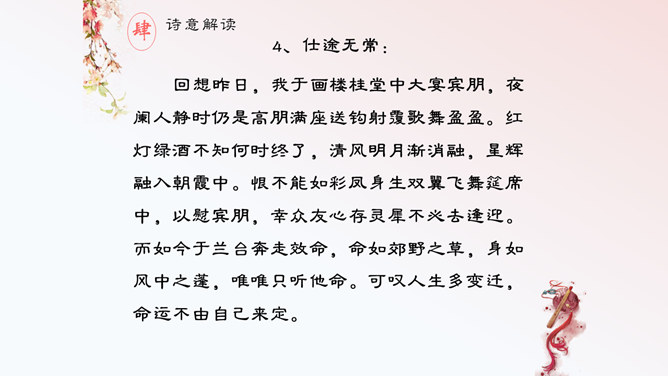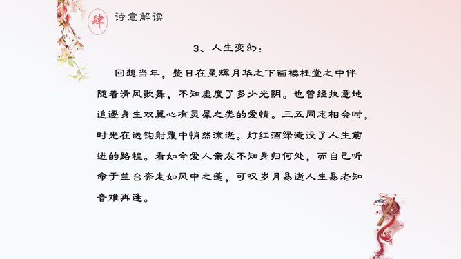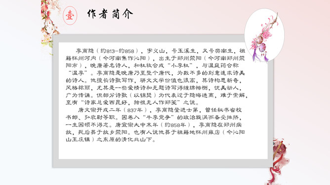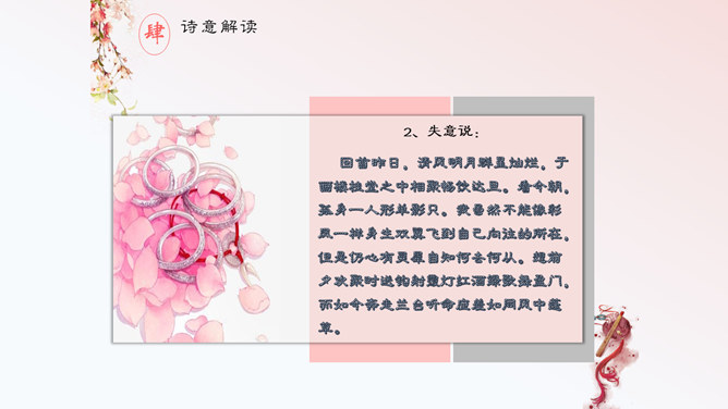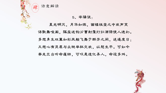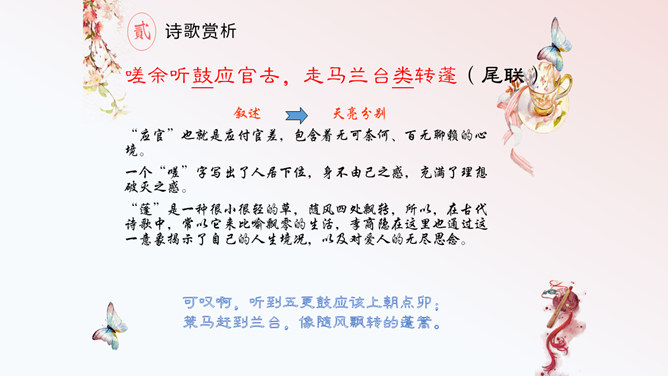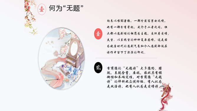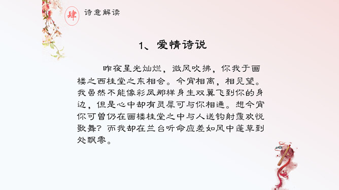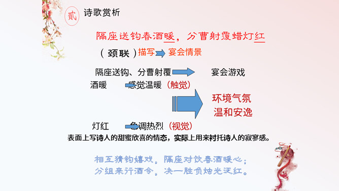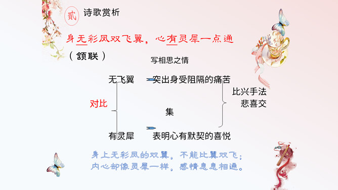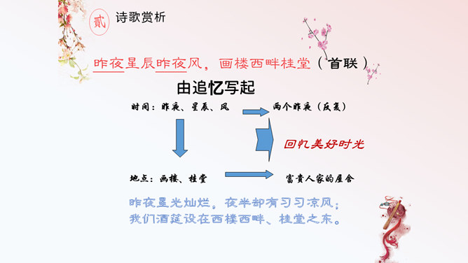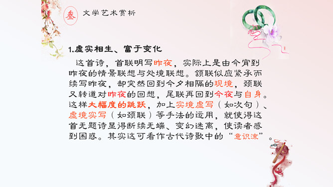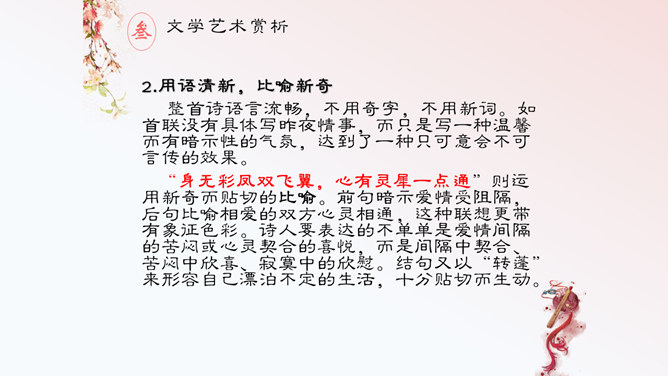 这首诗,首联明写昨夜,实际上是由今宵到昨夜的情景联想与处境联想。颔联似应紧承而续写昨夜,却突然回到今夕相隔的现境,颈联又转道对昨夜的回想,尾联再回到今夜与自身。这样大幅度的跳跃,加上实境虚写(如次句)、虚境实写(如颈联)等手法的运用,就使得这首无题诗显得断续无端、变幻迷离,使读者感到困惑。其实这可看作古代诗歌中的“意识流”。整首诗语言流畅,不用奇字,不用新词。如首联没有具体写昨夜情事,而只是写一种温馨而有暗示性的气氛,达到了一种只可意会不可言传的效果。所属专题:无题ppt。
