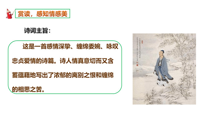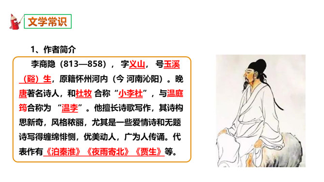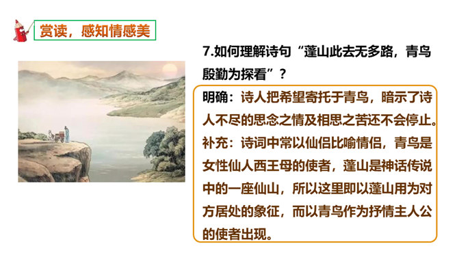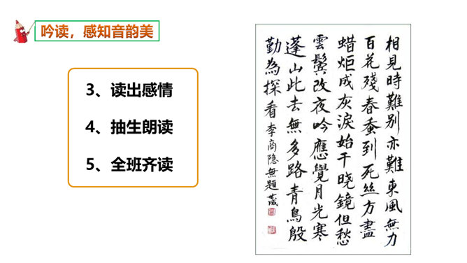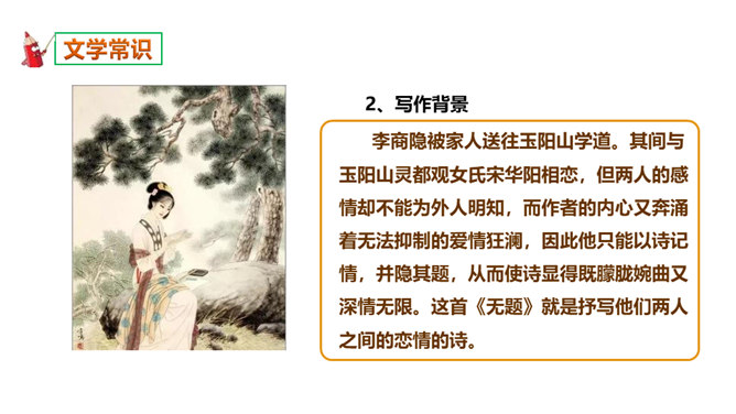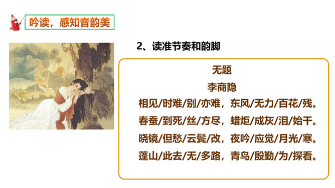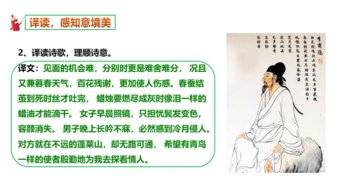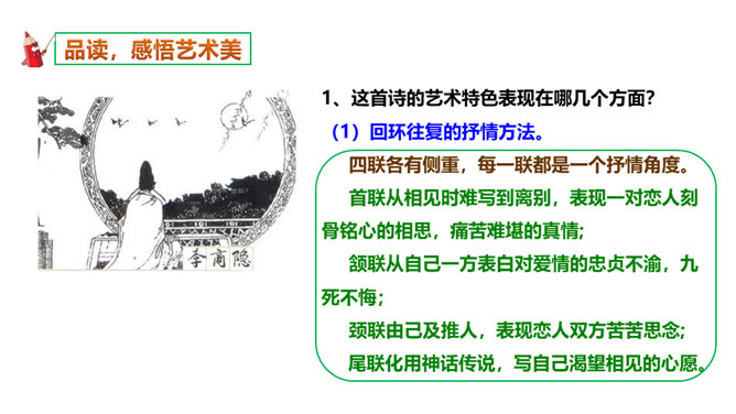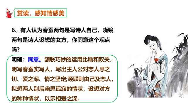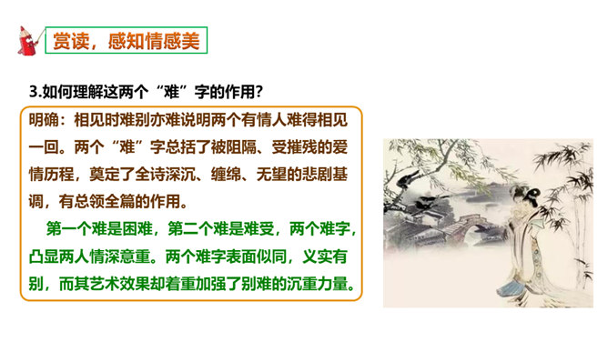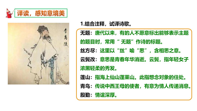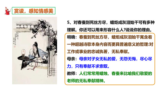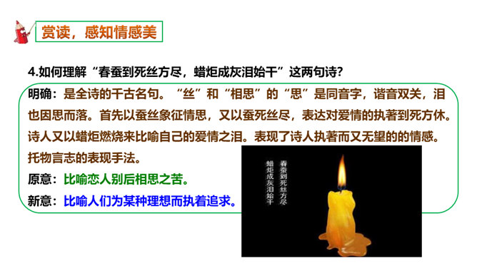 如何理解这两个“难”字的作用?明确:相见时难别亦难说明两个有情人难得相见一回。两个“难”字总括了被阻隔、受摧残的爱情历程,奠定了全诗深沉、缠绵、无望的悲剧基调,有总领全篇的作用。第一个难是困难,第二个难是难受,两个难字,凸显两人情深意重。两个难字表面似同,义实有别,而其艺术效果却着重加强了别难的沉重力量。“丝”和“相思”的“思”是同音字,谐音双关,泪也因思而落。首先以蚕丝象征情思,又以蚕死丝尽,表达对爱情的执著到死方休。诗人又以蜡炬燃烧来比喻自己的爱情之泪。表现了诗人执著而又无望的的情感。所属专题:无题ppt。