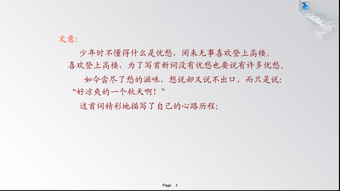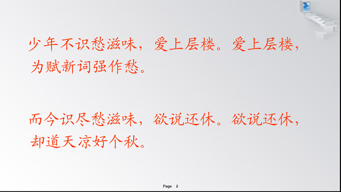 辛弃疾(1140~1207年),南宋词人。字幼安,号稼轩,历城(今山东济南)人。他出生于战乱年代,长大后积极抗金,主张北伐,恢复中原。他的词慷慨悲壮,风格豪放,具有深刻的爱国主义思想,反映了时代精神。这首词精彩地描写了自己的心路历程:青少年时代,无忧无虑,不知愁苦是什么滋味。然而随着年龄的增长、心态的转变,真正体会到人生的苦涩艰辛后,那许多的愁连说都说不出口,只好独自承受了。所属专题:丑奴儿书博山道中壁ppt。