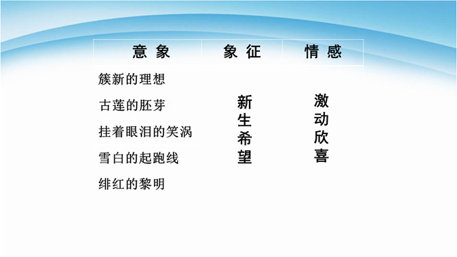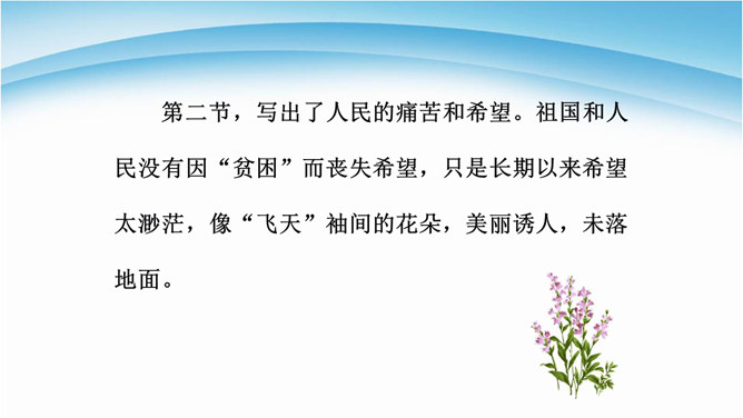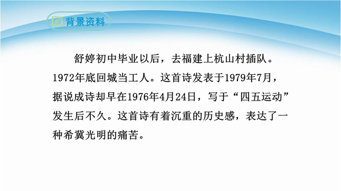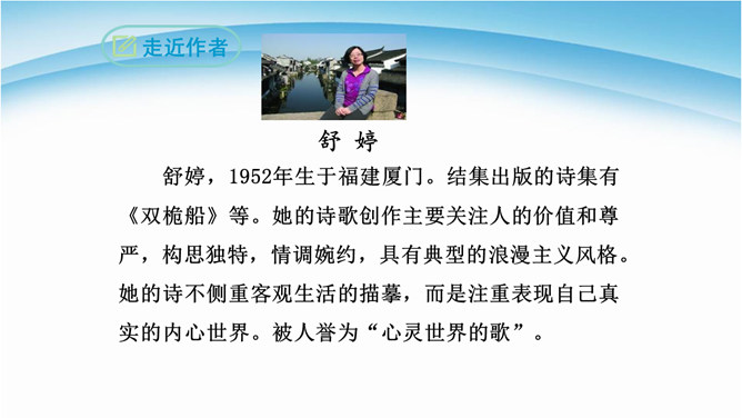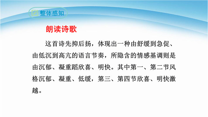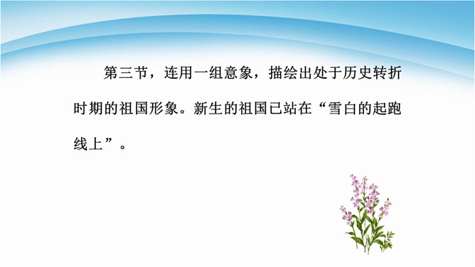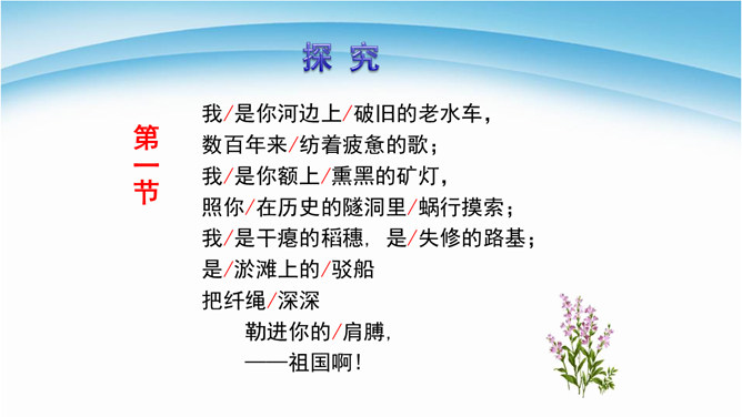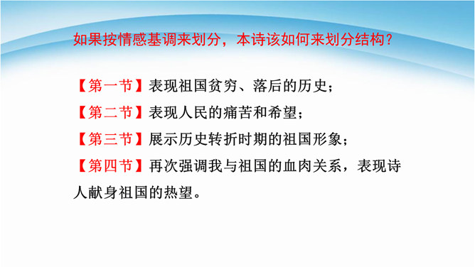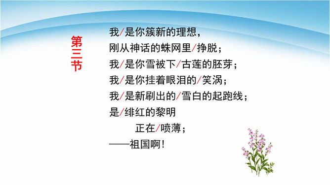 读诗必须用心灵去读,才能读出真情,才能更好地把握好作品的内在思想意义。今后同学们要用你的眼睛发现生活中的真善美,用心灵去感受生活、感悟人生,用你的笔去歌颂我们伟大的祖国。 我们欣赏了当代女诗人舒婷的朦胧诗代表作之一,诗中有许多意象,下面就以“我是你——”的句式仿写一组意象来表达对祖国的拳拳赤子之心。可以交流,可以合作,把它写出来,每人仿写一句话。教师指导引路,如:我是你发梢上的蝴蝶结,时时刻刻展示你的风姿。 从破折号引出,“祖国啊”这一激情咏叹,这是叙述人称的转换,也使读音在小小的高潮中稍作停顿。所属专题:祖国啊我亲爱的祖国ppt。