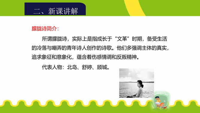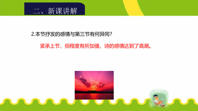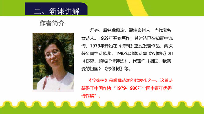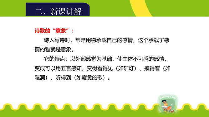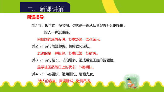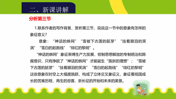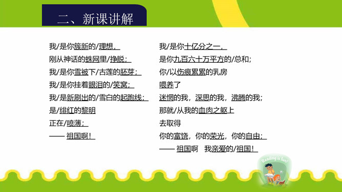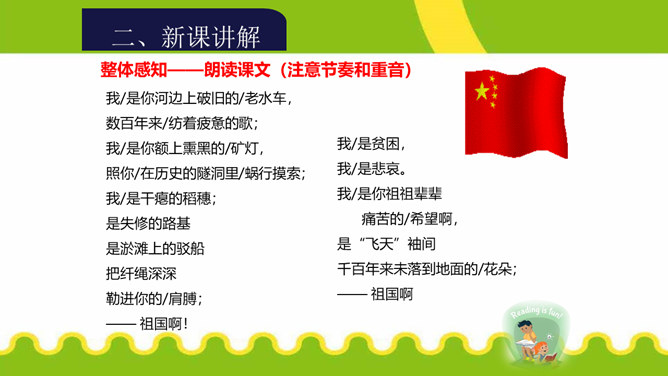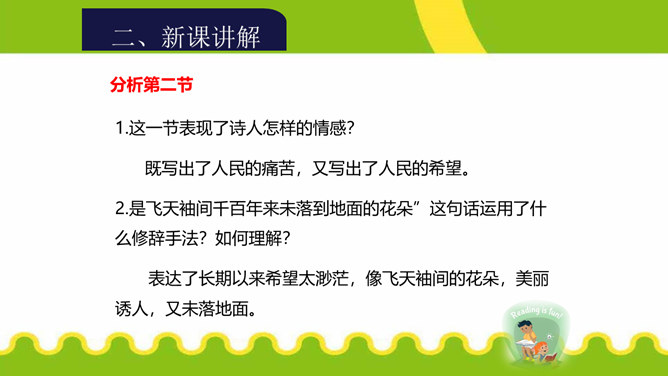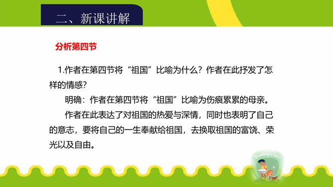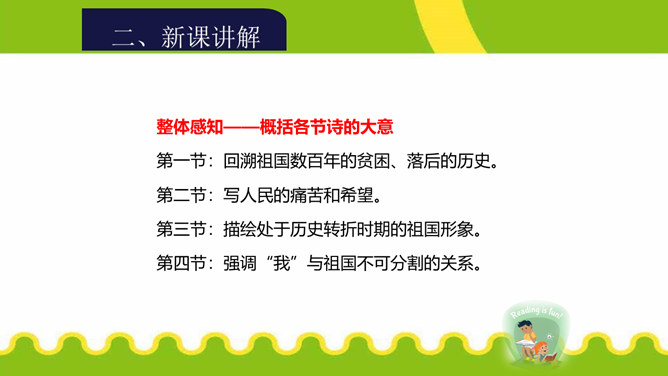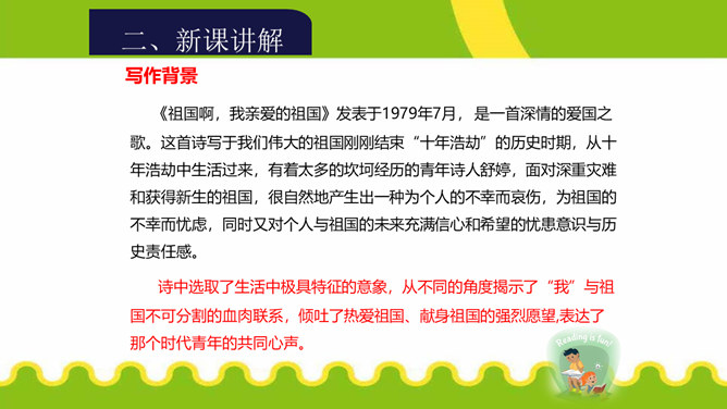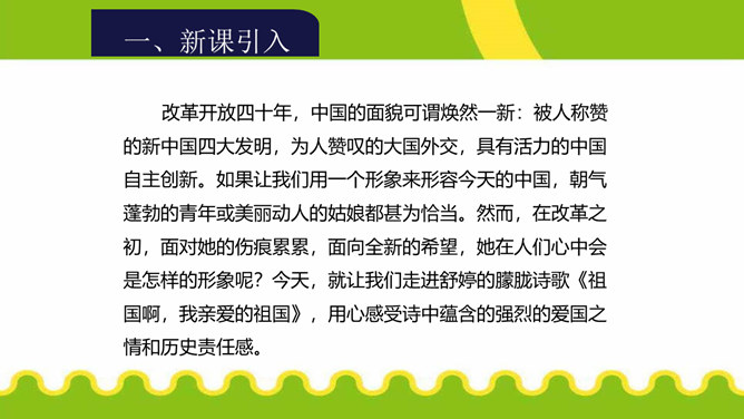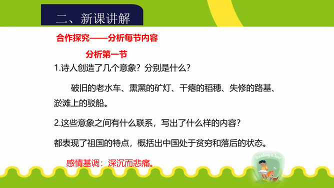诗中选取了生活中极具特征的意象,从不同的角度揭示了“我”与祖国不可分割的血肉联系,倾吐了热爱祖国、献身祖国的强烈愿望,表达了那个时代青年的共同心声。1.诗人创造了几个意象?分别是什么?破旧的老水车、熏黑的矿灯、干瘪的稻穗、失修的路基、淤滩上的驳船。2.这些意象之间有什么联系,写出了什么样的内容?都表现了祖国的特点,概括出中国处于贫穷和落后的状态。感情基调:深沉而悲痛。是飞天袖间千百年来未落到地面的花朵”这句话运用了什么修辞手法?表达了长期以来希望太渺茫,像飞天袖间的花朵,美丽诱人,又未落地面。所属专题:祖国啊我亲爱的祖国ppt。