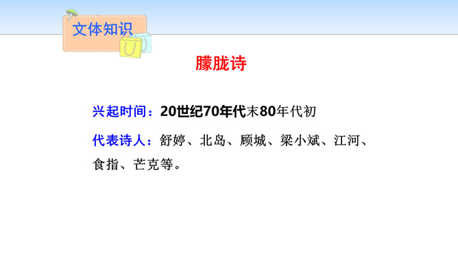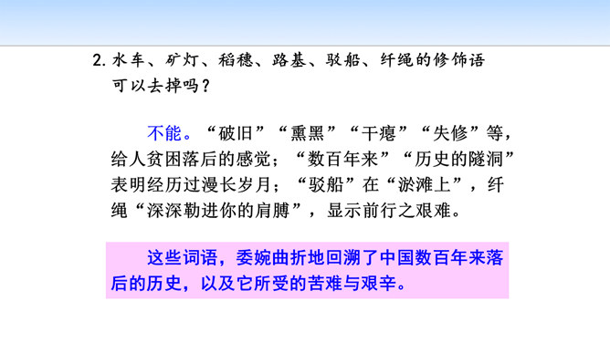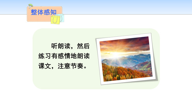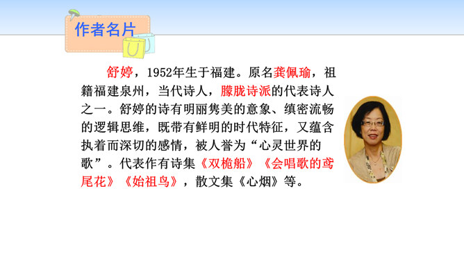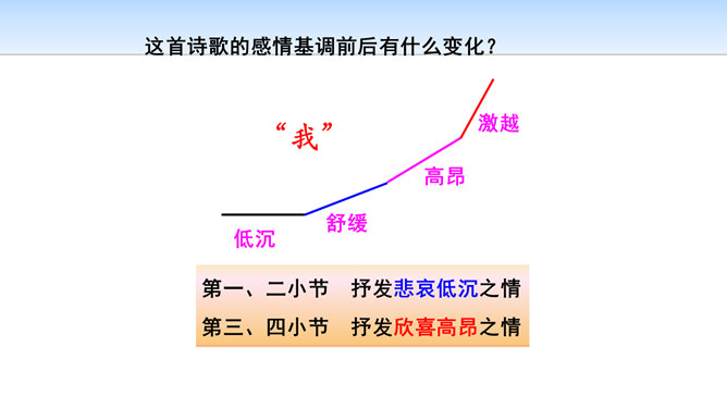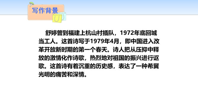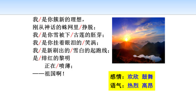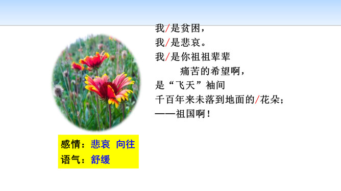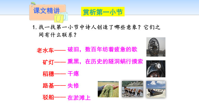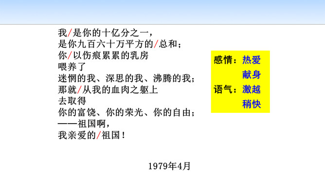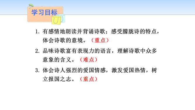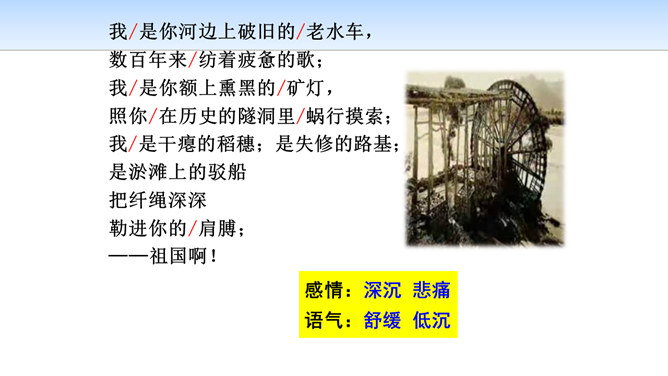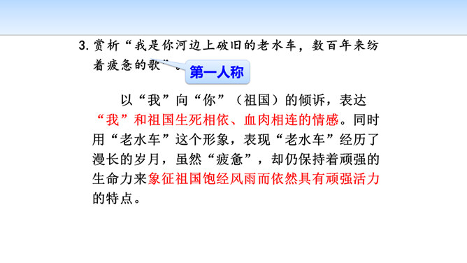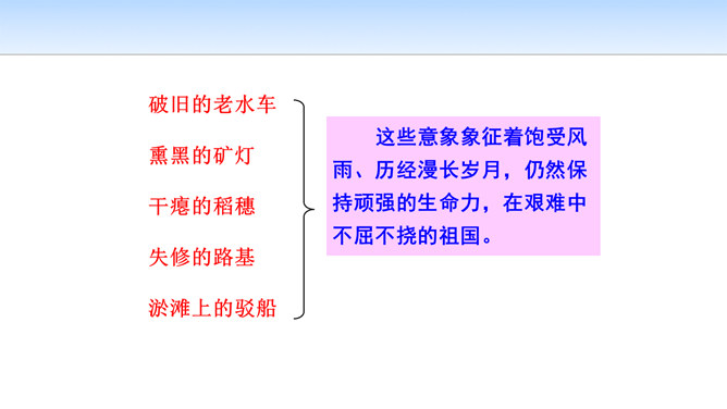 有感情地朗读并背诵诗歌;感受朦胧诗的特点,体会诗歌的意境。(重点)品味诗歌富有表现力的语言,理解诗歌中众多意象的含义。(难点)体会诗人强烈的爱国情感,激发爱国热情,树立报国之志。(重点)这些意象象征着饱受风雨、历经漫长岁月,仍然保持顽强的生命力,在艰难中不屈不挠的祖国。以“我”向“你”(祖国)的倾诉,表达“我”和祖国生死相依、血肉相连的情感。同时用“老水车”这个形象,表现“老水车”经历了漫长的岁月,虽然“疲惫”,却仍保持着顽强的生命力来象征祖国饱经风雨而依然具有顽强活力的特点。所属专题:祖国啊我亲爱的祖国ppt。